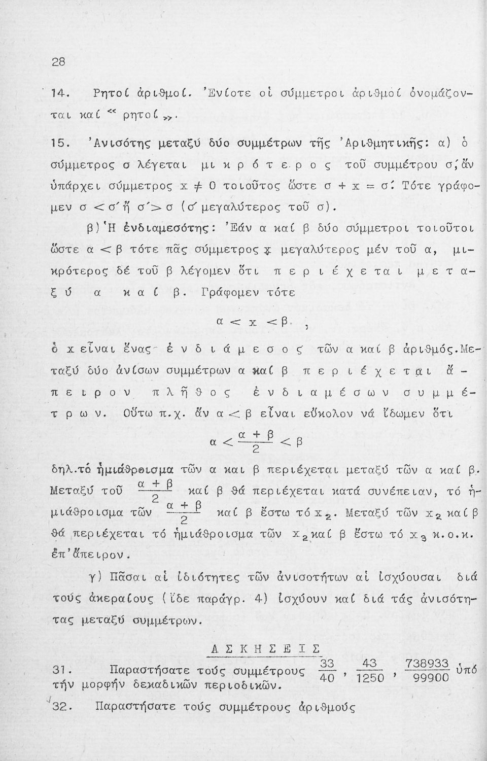 Σχολικό εγχειρίδιο Μαθηματικών Γυμνασίου που παρουσιάζει τις βασικές έννοιες της Άλγεβρας, εστιάζει τις ιδιότητες των αριθμών και περιέχει ασκήσεις εξισώσεων, λογαρίθμων και παραγώγων.