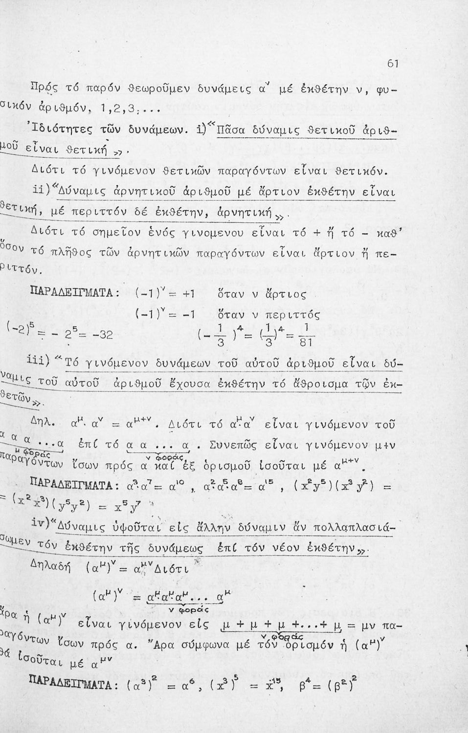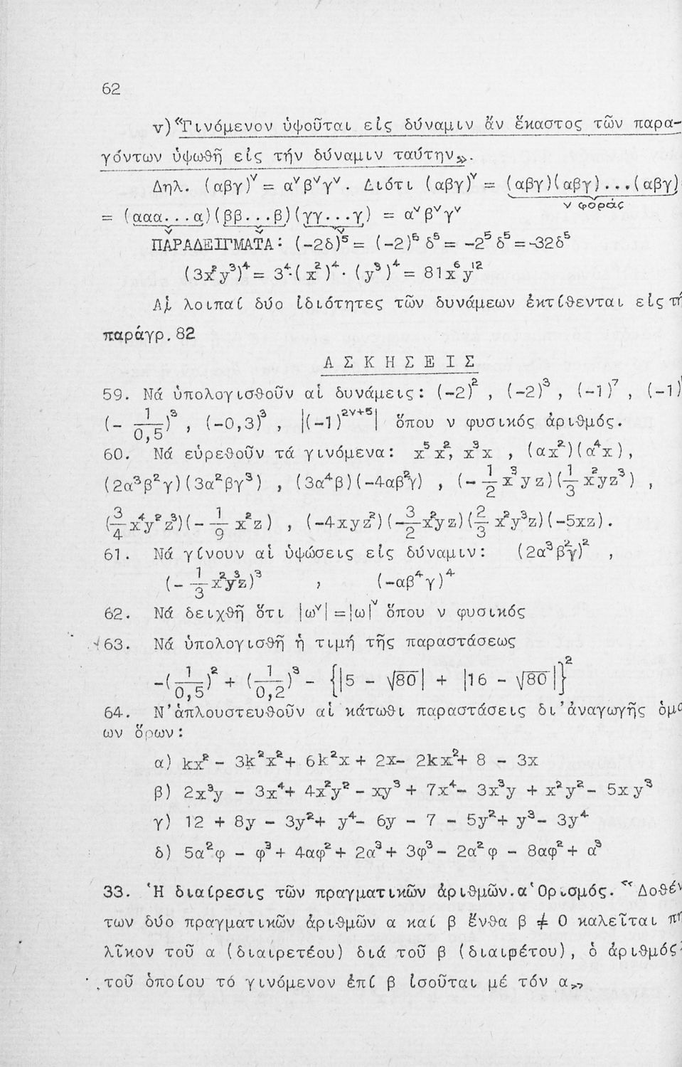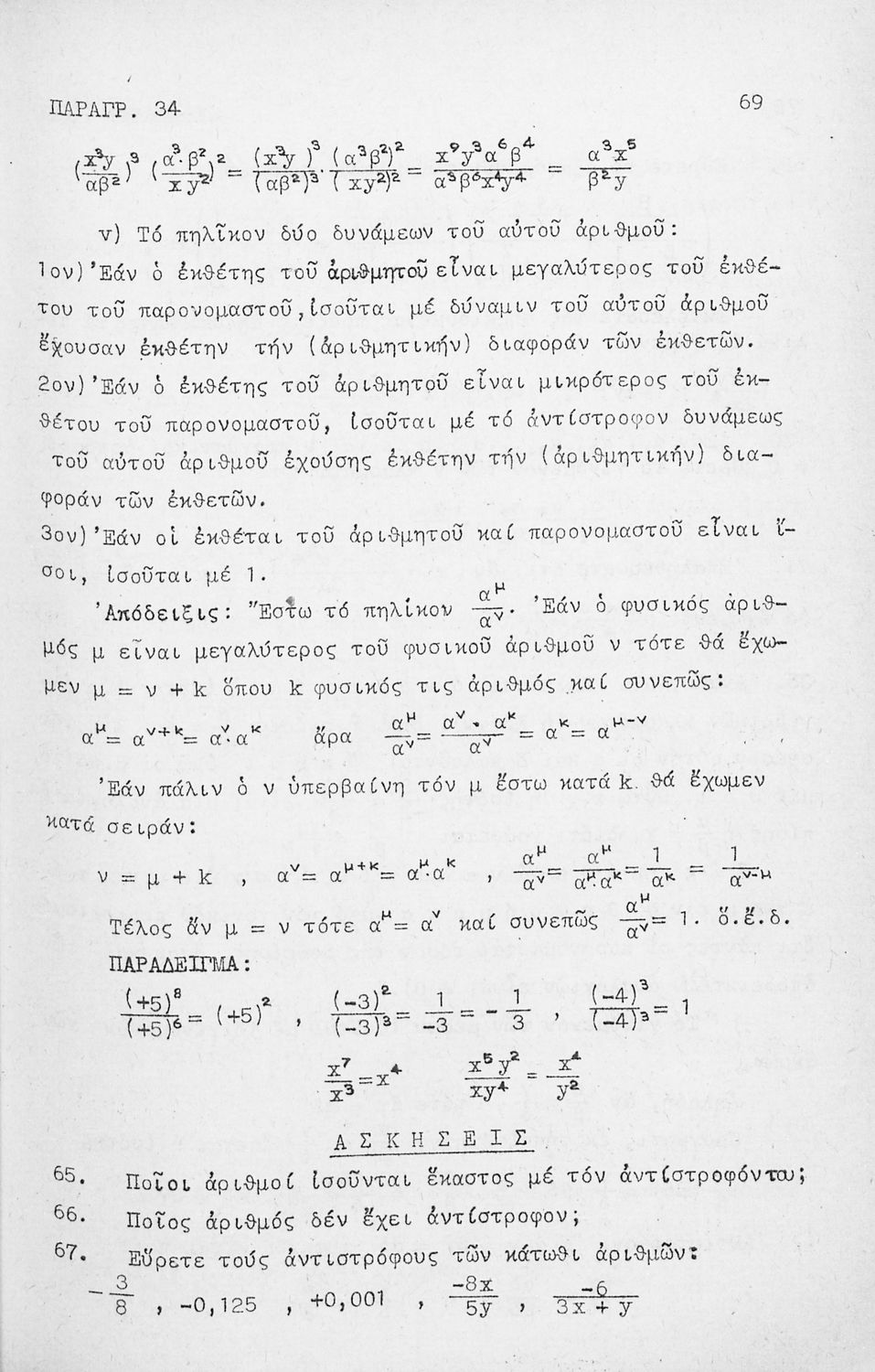 Σχολικό εγχειρίδιο Μαθηματικών Γυμνασίου που παρουσιάζει τις βασικές έννοιες της Άλγεβρας, εστιάζει τις ιδιότητες των αριθμών και περιέχει ασκήσεις εξισώσεων, λογαρίθμων και παραγώγων.