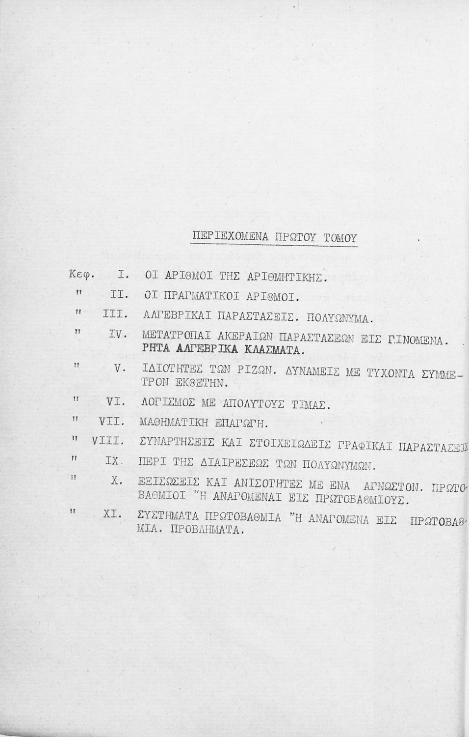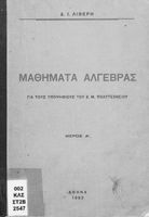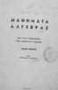 Βαθμίδα εκπαίδευσης: Δευτεροβάθμια Μάθημα: Μαθηματικά Γλώσσα: Απλή καθαρεύουσα Παρουσίαση περιεχομένου: Μαθητικό βοήθημα Άλγεβρας για τους υποψηφίους των Ανωτάτων Σχολών που περιέχει τα θεμελιώδη μέρη της Άλγεβρας καθώς και τις διαφορετικές μορφές Αλγεβρικού λογισμού μεταξύ πραγματικών αριθμών. |