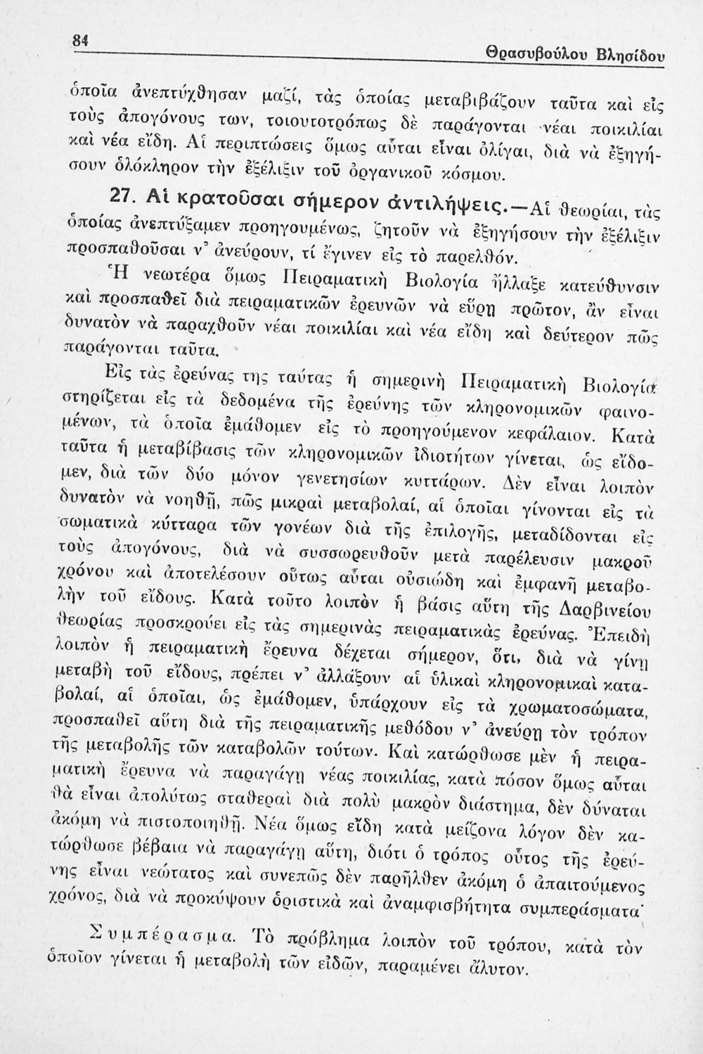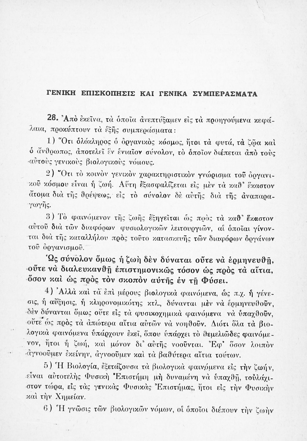 Βαθμίδα εκπαίδευσης: Δευτεροβάθμια Τάξη: Δ' Γυμνασίου Μάθημα: Βιολογία Γλώσσα: Απλή καθαρεύουσα Παρουσίαση περιεχομένου: Σχολικό εγχειρίδιο Βιολογίας της Δ' Δημοτικού. Το βιβλίο παρουσιάζει μια γενική επισκόπηση της Βιολογίας αρχίζοντας με γενικές έννοιες Βιολογίας και ιδιότητες των ζώντων και οργανισμός, εξετάζει τη δομή του κυττάρου, για να καταλήξει σε ζητήματα κληρονομικότητας και εξέλιξης των οργανισμών. |