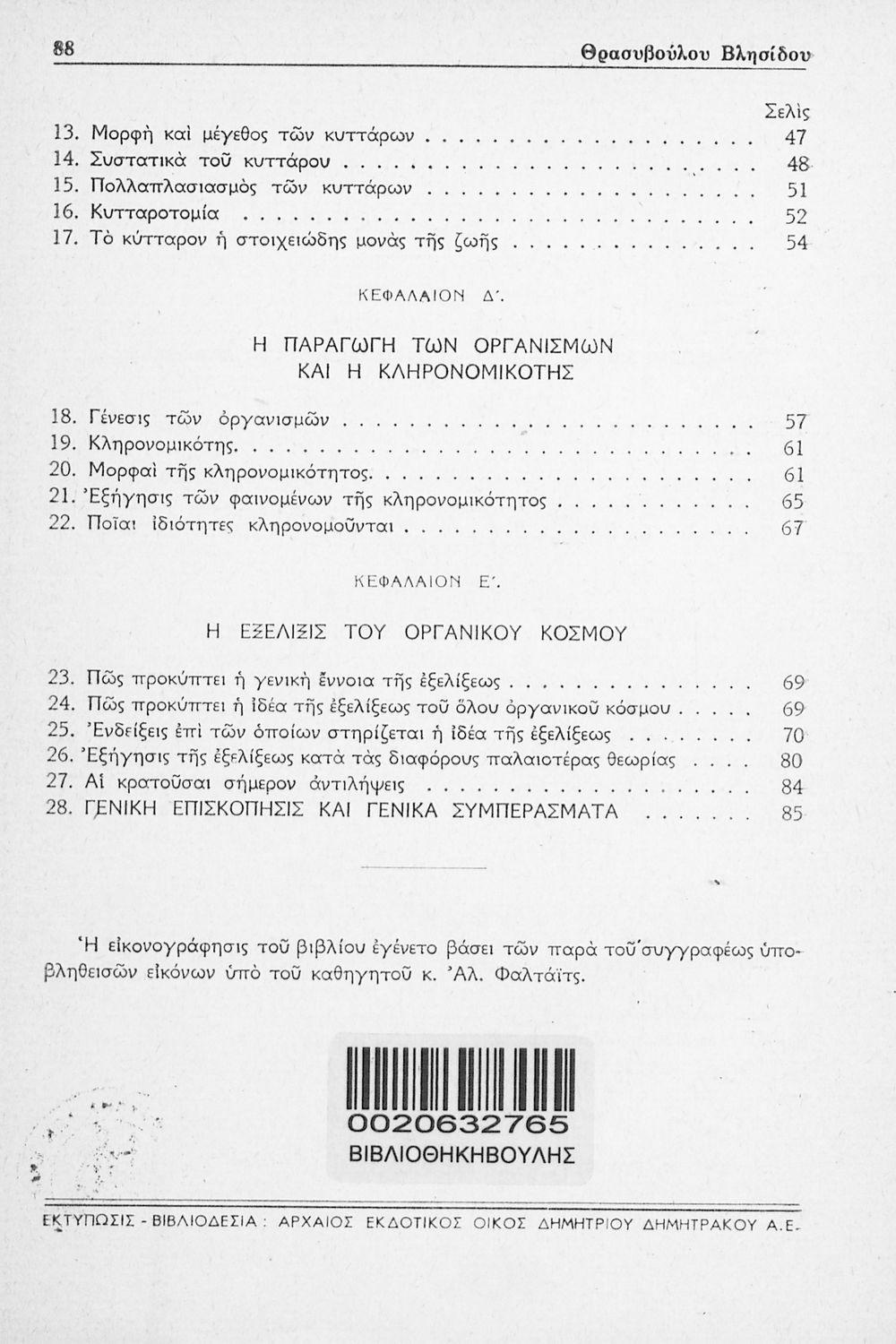 Κωδικός αναγνώρισης: 03-20632765 Τίτλος: Στοιχεία Γενικής Βιολογίας, δια την Δ΄ τάξιν των Γυμνασίων Συγγραφέας: Θρασύβουλος Βλησίδης Εικονογράφος: Αλ. Φαλτάϊτς Μέγεθος και υπόστρωμα: Σχολικό εγχειρίδιο, μαλακό εξώφυλλο, 88 σελίδες. Σκίτσα (ασπρόμαυρα). |