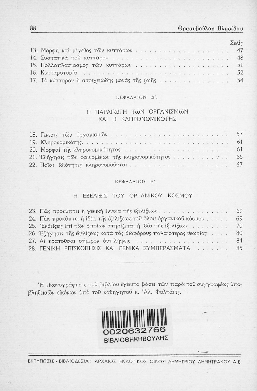 Σχολικό εγχειρίδιο Βιολογίας Δ΄ Γυμνασίου που εστιάζει στις συνθήκες γέννησης, μεταβολής και θανάτου των έμβιων οργανισμών. Ο συγγραφέας ήταν καθηγητής της γενικής Βιολογίας στο Πανεπιστήμιο Αθηνών.