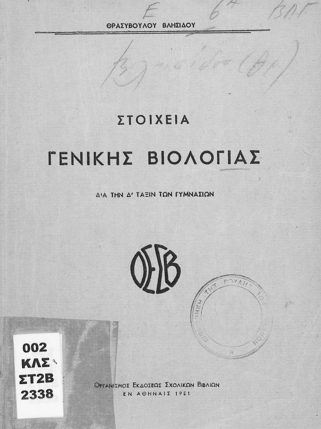 Κωδικός αναγνώρισης: 03-20632766 Τίτλος: Στοιχεία Γενικής Βιολογίας δια την Δ' τάξιν των Γυμνασίων Συγγραφέας: Θρασύβουλος Βλησίδης Εικονογράφος: Αλ. Φαλτάϊτς Μέγεθος και υπόστρωμα: Σχολικό εγχειρίδιο, μαλακό εξώφυλλο, 88 σελίδες. Εικόνες, σκίτσα (ασπρόμαυρα). |