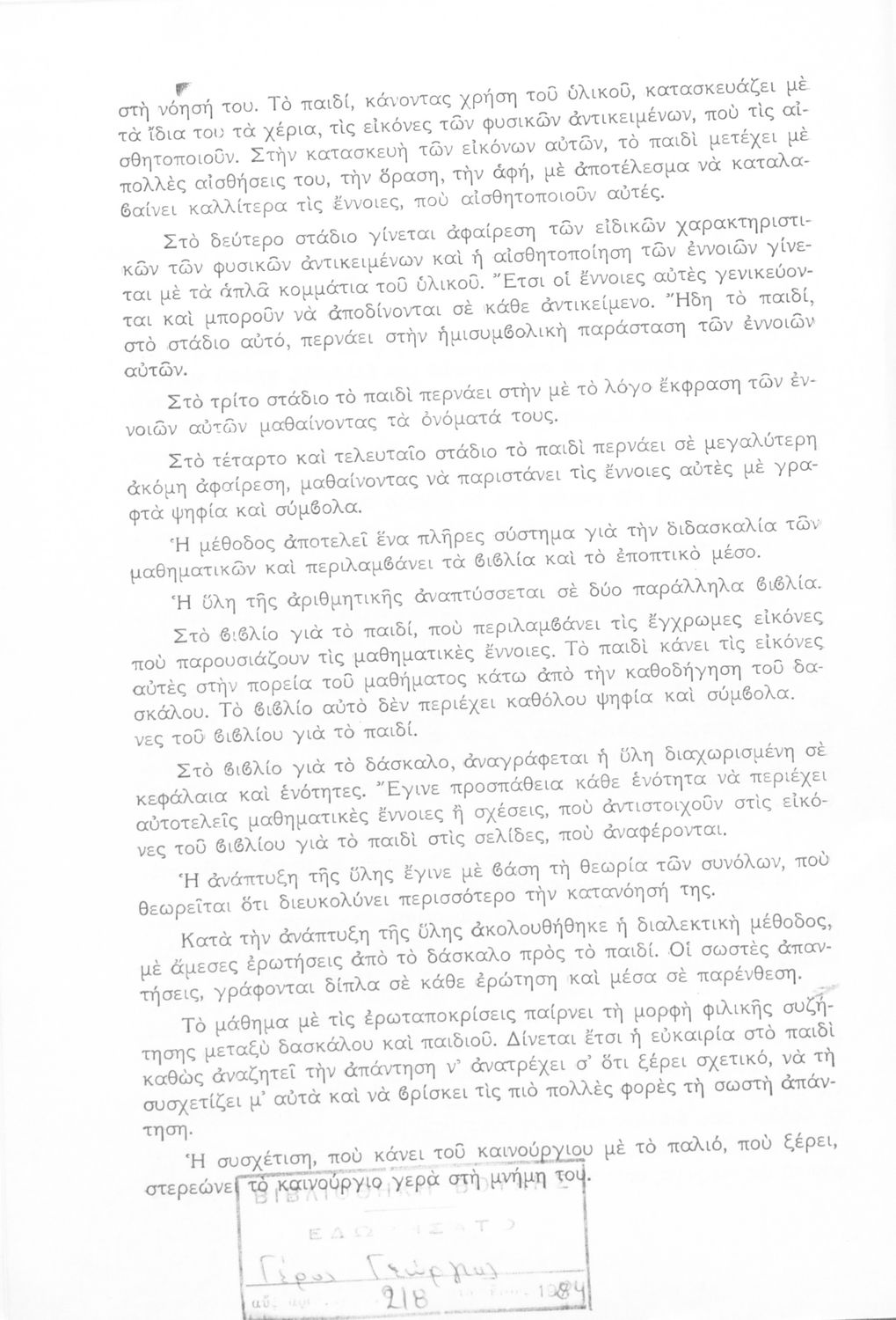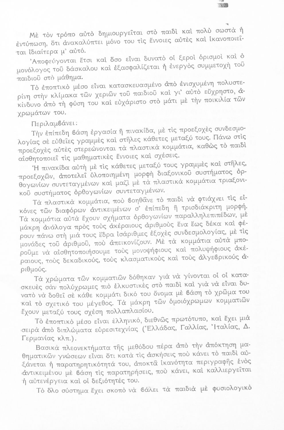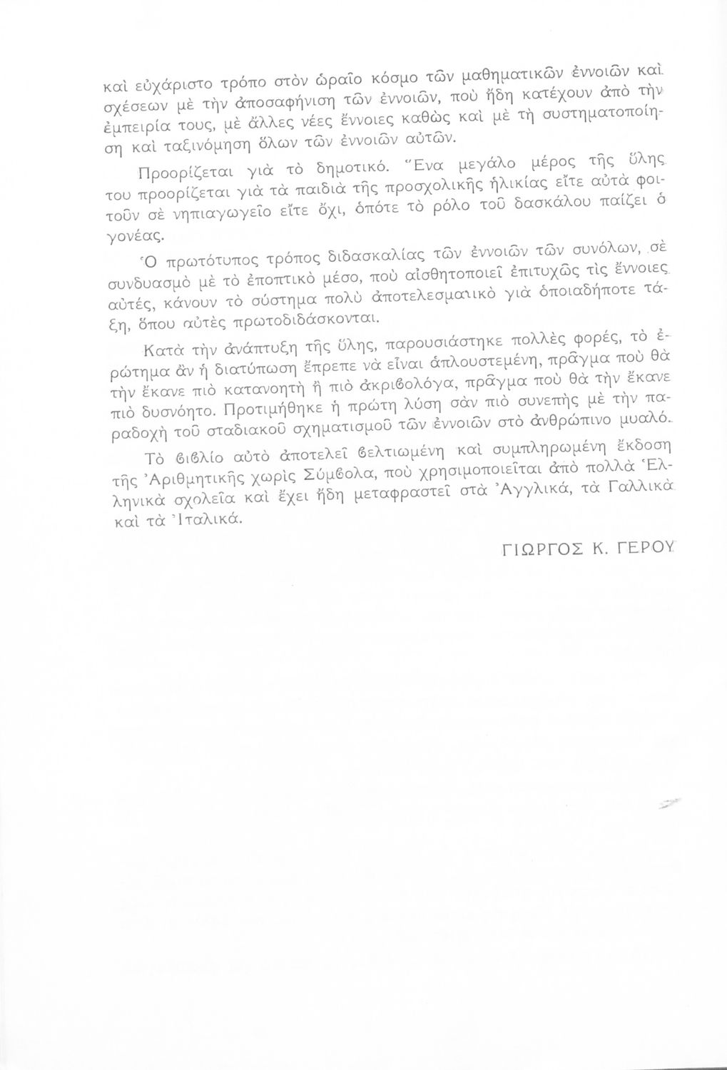 Το βιβλίο είναι παιδαγωγικό βοήθημα για το δάσκαλο στο μάθημα των μαθηματικών στο Νηπιαγωγείο και στο Δημοτικό. Παρουσιάζει μια νέα μέθοδο διδασκαλίας των βασικών εννοιών των μαθηματικών στις πρώτες τάξεις του σχολείου