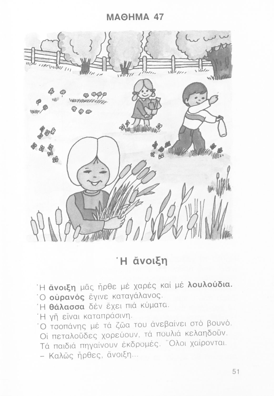 Αναγνωστικό Δημοτικού που περιέχει πεζά και ποιήματα Ελλήνων συγγραφέων τα οποία αντλούν τα θέματά τους από την καθημερινή ζωή των ανθρώπων και τη σχέση τους με τη φύση.