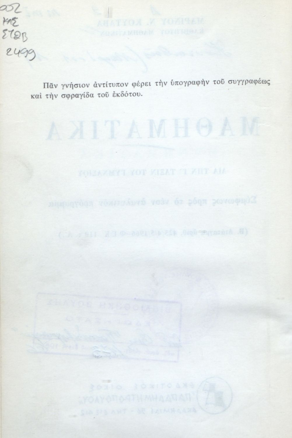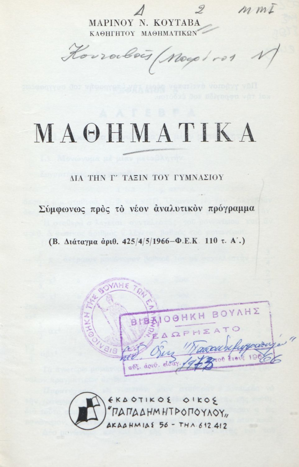 LDR 01167 2200193 4500 035 ## _a03-20636915 040 ## _aΒιβλιοθήκη της Βουλής των Ελλήνων 041 ## _ael 100 ## _aΜ. Κουταβάς 110 ## _a20636915 245 0# _aΜαθηματικά δια την Γ' τάξιν του Γυμνασίου συμφώνως προς το νέον αναλυτικόν πρόγραμμα 260 ## _aΑθήνα _bΠαπαδημητρόπουλος _c1966 300 ## _a100 520 ## _aΜαθητικό βοήθημα Μαθηματικών για τους μαθητές της Γ΄ Γυμνασίου το οποίο περιέχει τις βασικές αρχές και αξιώματα των Μαθηματικών καθώς και σειρά ασκήσεων πρωτοβάθμιων και δευτεροβάθμιων εξισώσεων. 521 ## _aΓ' Γυμνασίου 522 ## _aΕλλάδα 546 ## _aΑπλή καθαρεύουσα 563 ## _aΜαλακό Εξώφυλλο 650 #4 _aΔευτεροβάθμιες εξισώσεις _aΜαθηματικά _aΜονώνυμα _aΠολυώνυμα _aΠρωτοβάθμιες