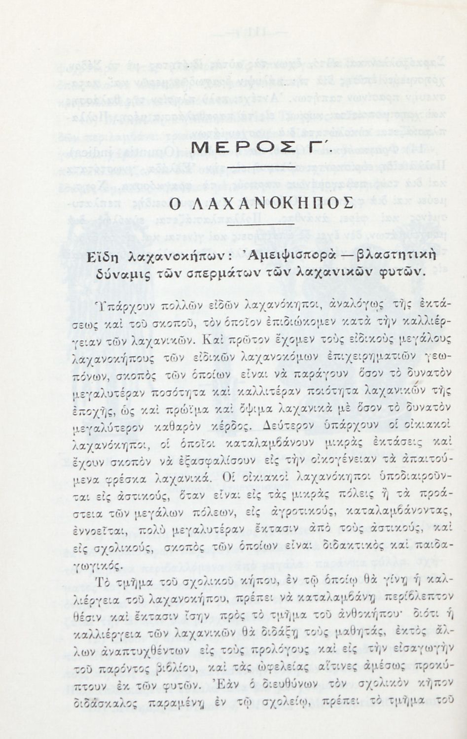 Παιδαγωγικό βοήθημα Ανθοκομίας και Λαχανοκηπίας που εξετάζει τον τρόπο διαμόρφωσης σχολικών κήπων και εξηγεί στους δασκάλους πως να εκπαιδεύσουν τους μαθητές στην κατασκευή τους. Επίσης περιέχει στοιχεία για τους εχθρούς και τις ασθένειες των ανθέων και λαχανικών και τους τρόπους θεραπείας, και κατάλογο με καλλιεργούμενα λαχανικά και άνθη.