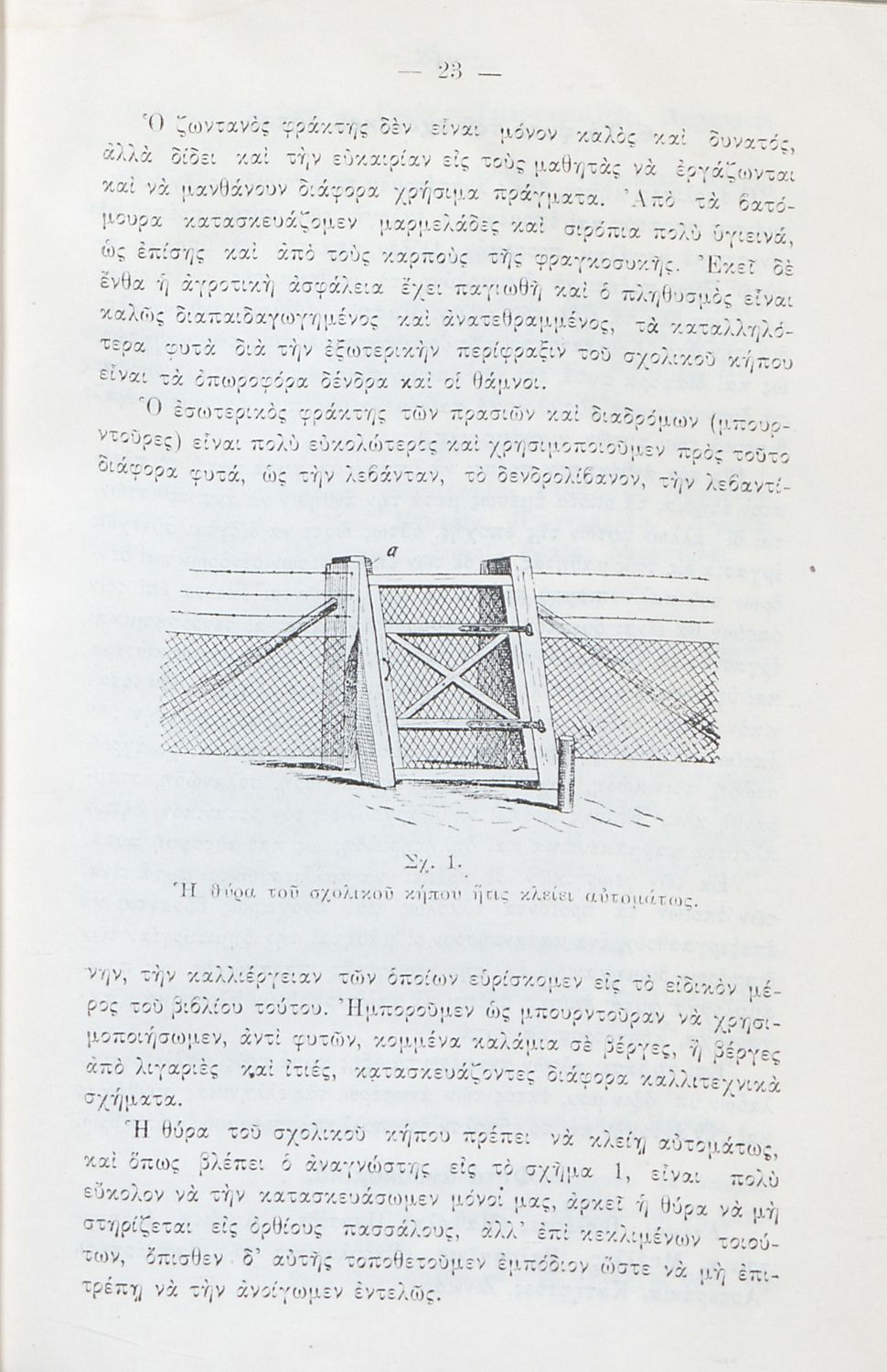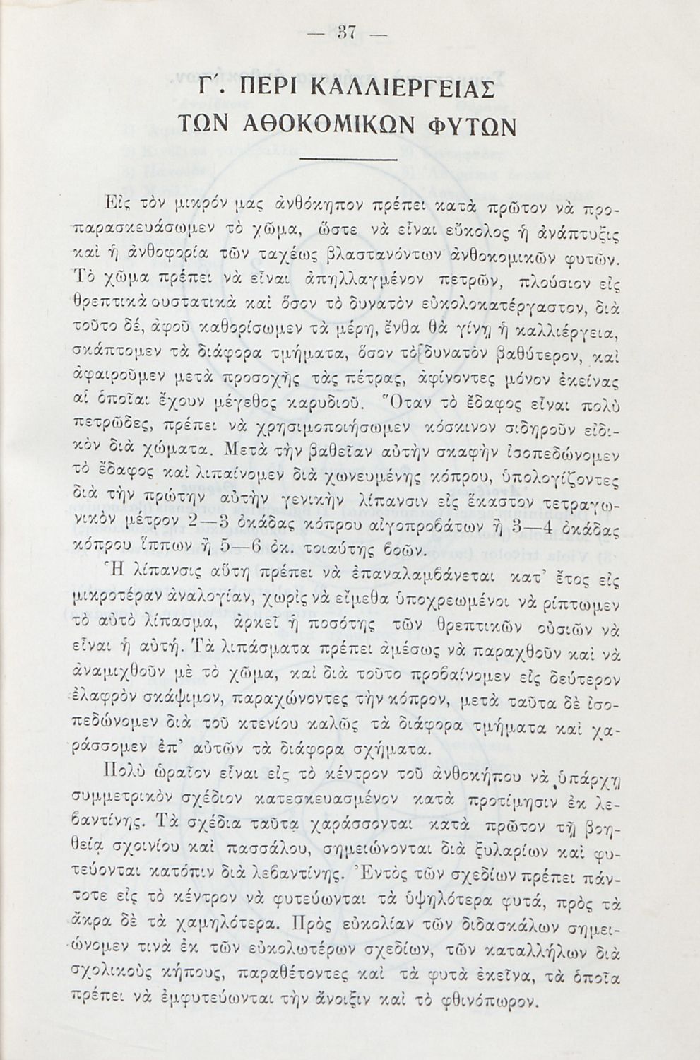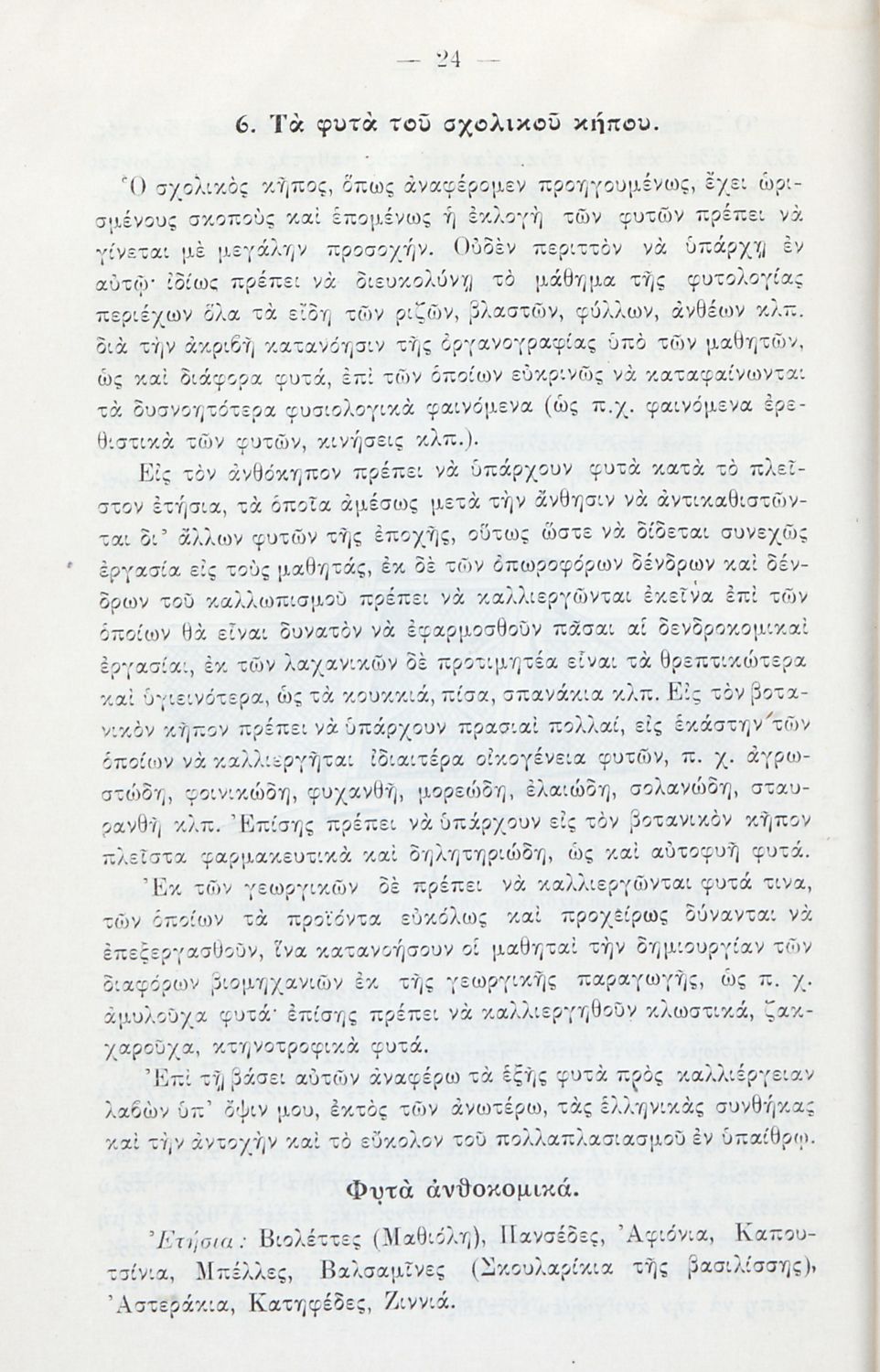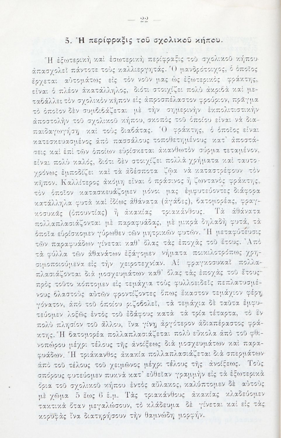 Παιδαγωγικό βοήθημα Ανθοκομίας και Λαχανοκηπίας που εξετάζει τον τρόπο διαμόρφωσης σχολικών κήπων και εξηγεί στους δασκάλους πως να εκπαιδεύσουν τους μαθητές στην κατασκευή τους. Επίσης περιέχει στοιχεία για τους εχθρούς και τις ασθένειες των ανθέων και λαχανικών και τους τρόπους θεραπείας, και κατάλογο με καλλιεργούμενα λαχανικά και άνθη.