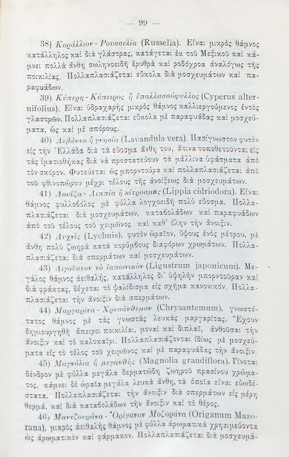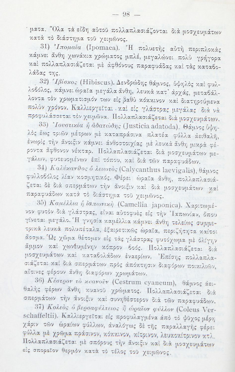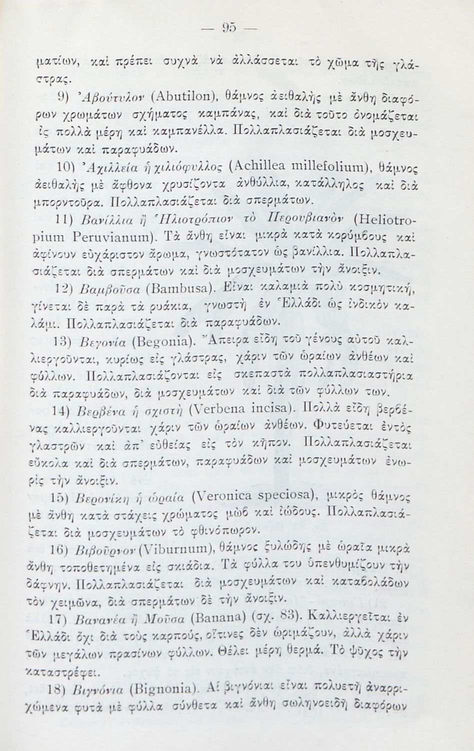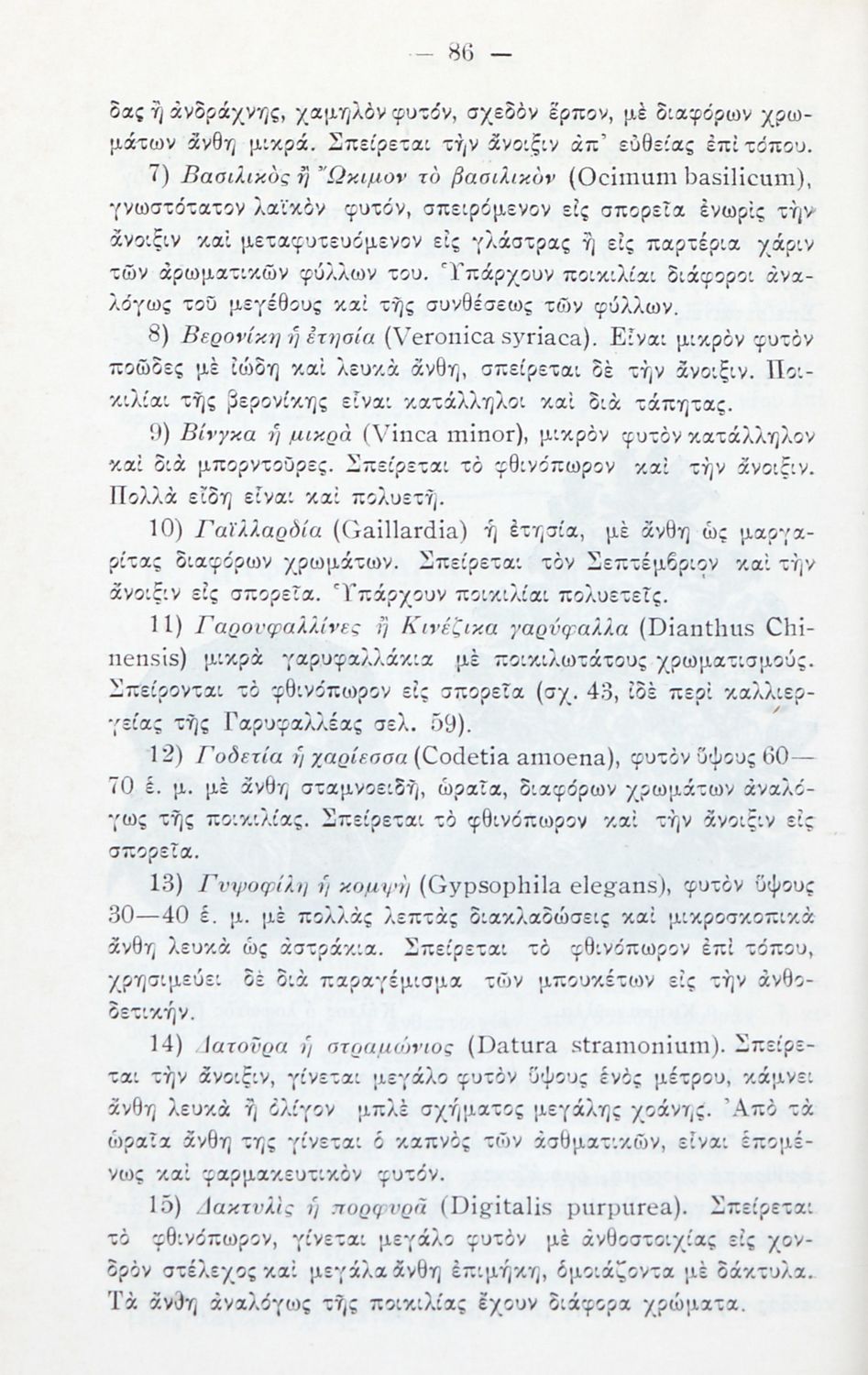 Μάθημα: Φυτολογία Γλώσσα: Καθαρεύουσα Παρουσίαση περιεχομένου: Παιδαγωγικό βοήθημα Ανθοκομίας και Λαχανοκηπίας που εξετάζει τον τρόπο διαμόρφωσης σχολικών κήπων και εξηγεί στους δασκάλους πως να εκπαιδεύσουν τους μαθητές στην κατασκευή τους. Επίσης περιέχει στοιχεία για τους εχθρούς και τις ασθένειες των ανθέων και λαχανικών και τους τρόπους θεραπείας, και κατάλογο με καλλιεργούμενα λαχανικά και άνθη. |