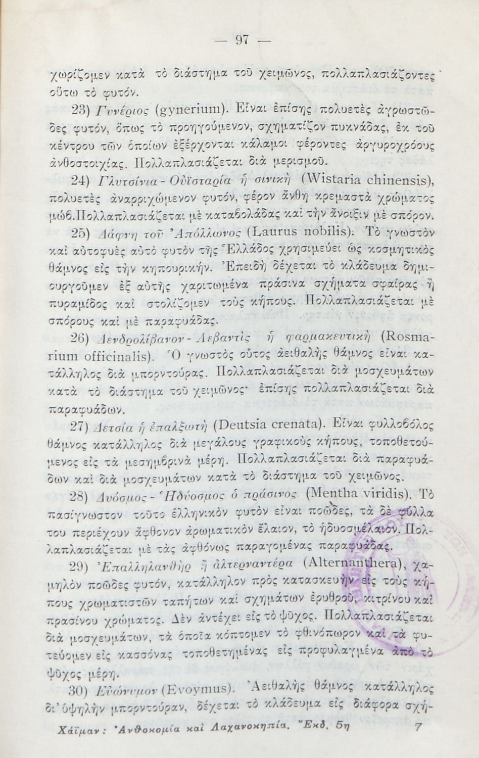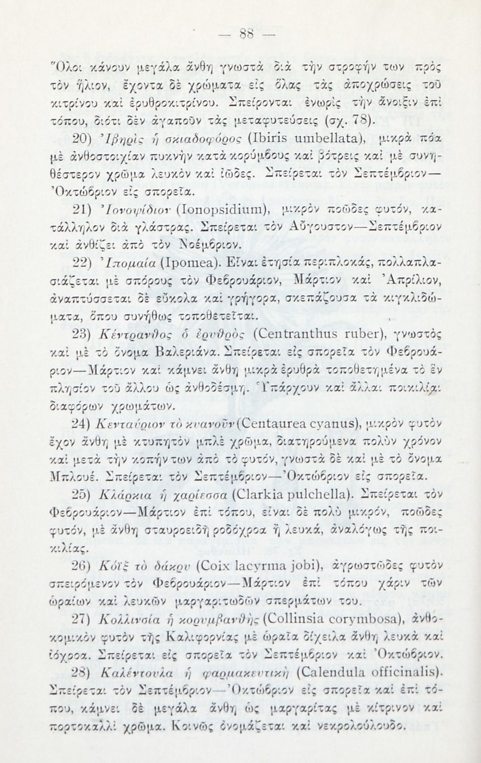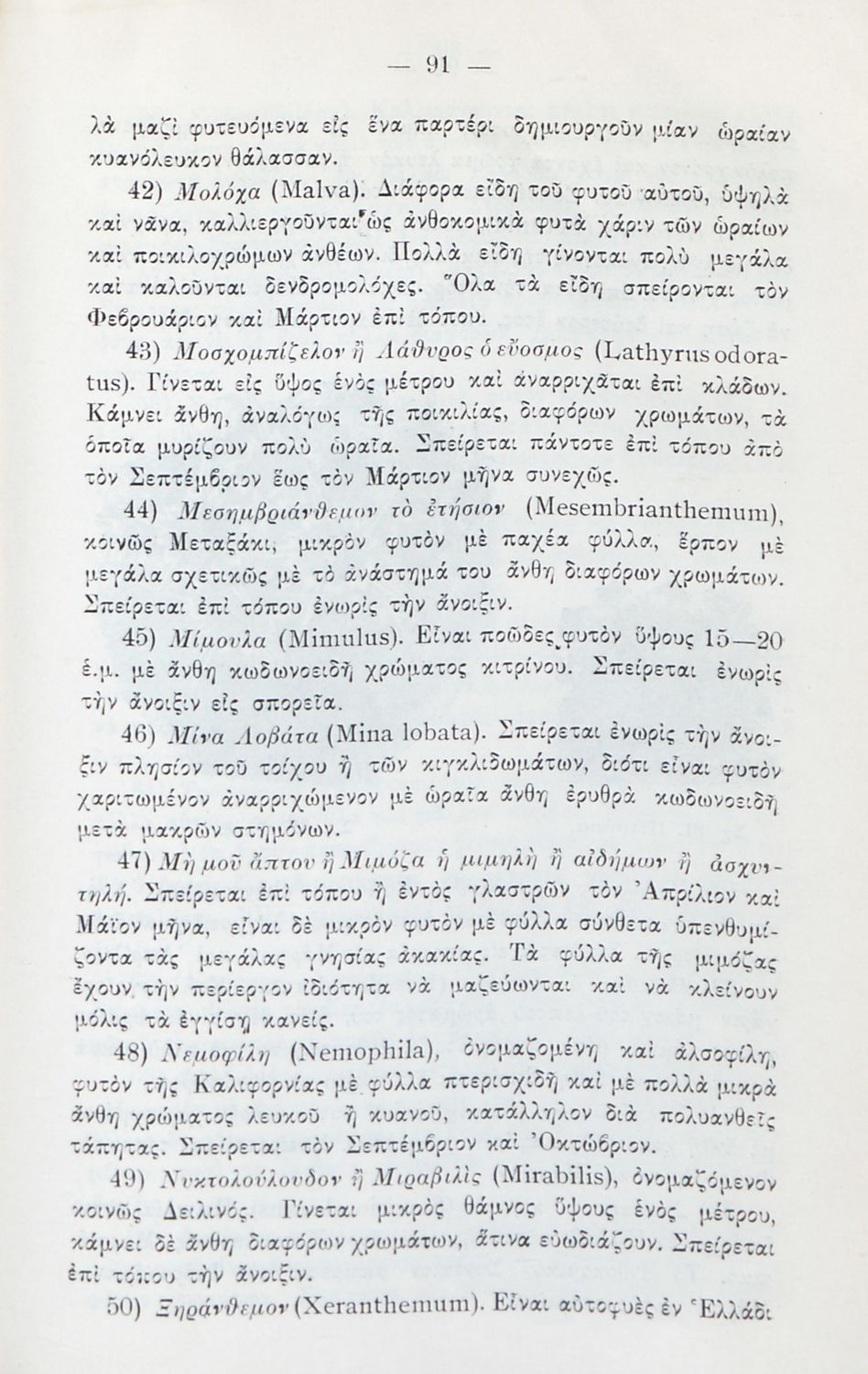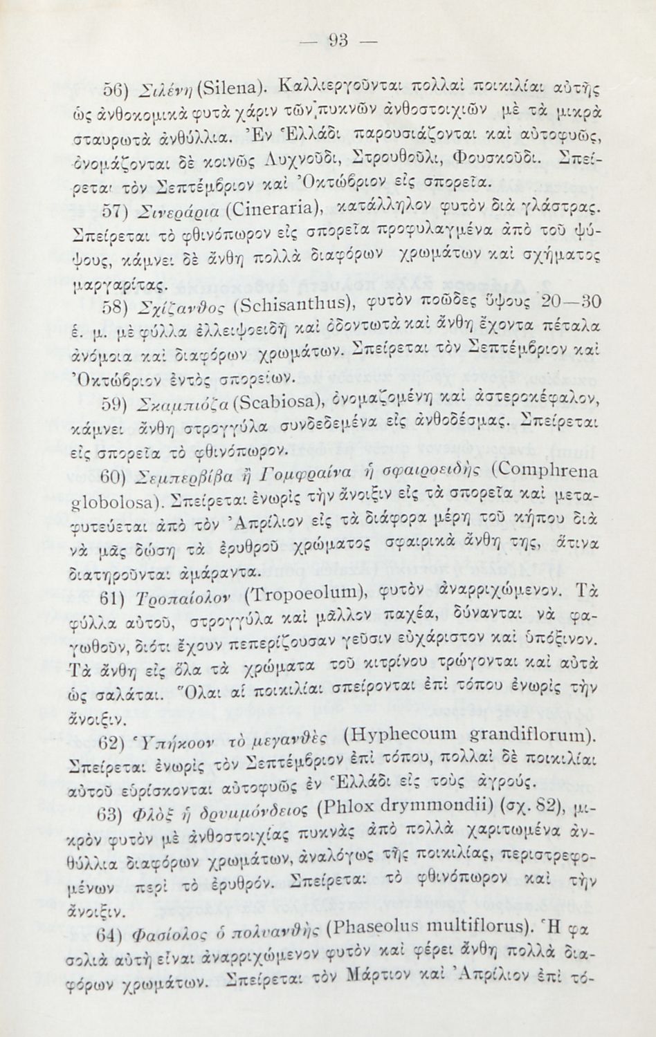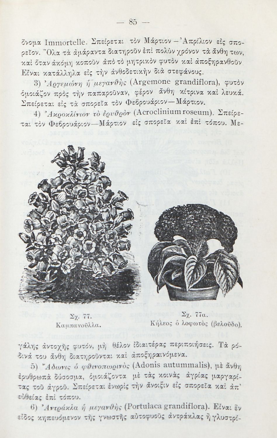 Μάθημα: Φυτολογία Γλώσσα: Καθαρεύουσα Παρουσίαση περιεχομένου: Παιδαγωγικό βοήθημα Ανθοκομίας και Λαχανοκηπίας που εξετάζει τον τρόπο διαμόρφωσης σχολικών κήπων και εξηγεί στους δασκάλους πως να εκπαιδεύσουν τους μαθητές στην κατασκευή τους. Επίσης περιέχει στοιχεία για τους εχθρούς και τις ασθένειες των ανθέων και λαχανικών και τους τρόπους θεραπείας, και κατάλογο με καλλιεργούμενα λαχανικά και άνθη. |