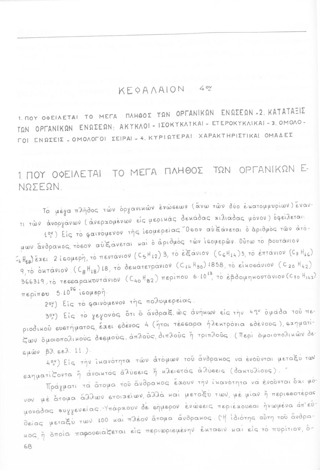Σχολικό εγχειρίδιο για τις τάξεις του Γυμνασίου και τις Ανώτατες Σχολές για το μάθημα της Χημείας. Το εγχειρίδιο περιλαμβάνει εισαγωγικά γενικές γνώσεις της οργανικής χημείας, την σύνταξη των οργανικών ενώσεων, τις καύσιμες ύλες, αλκοόλες, υδρογονάνθρακες, αρωματικά οξέα, τα αλκαλοειδή, τα εντομοκτόνα κ.α.