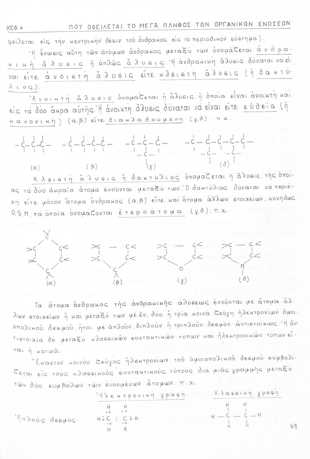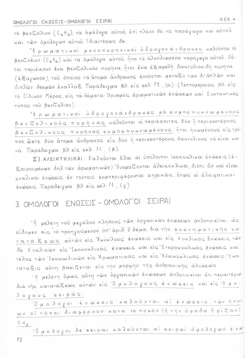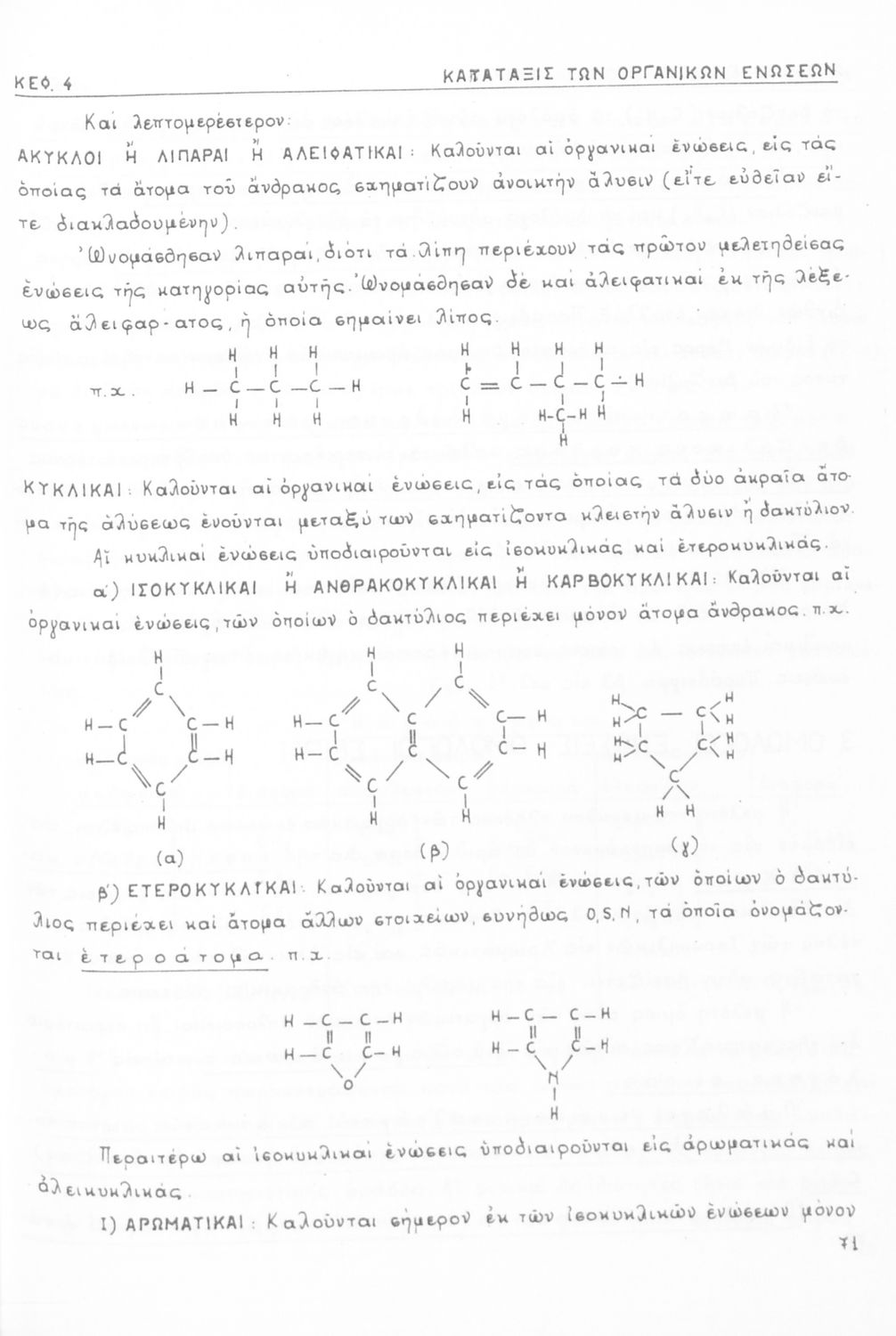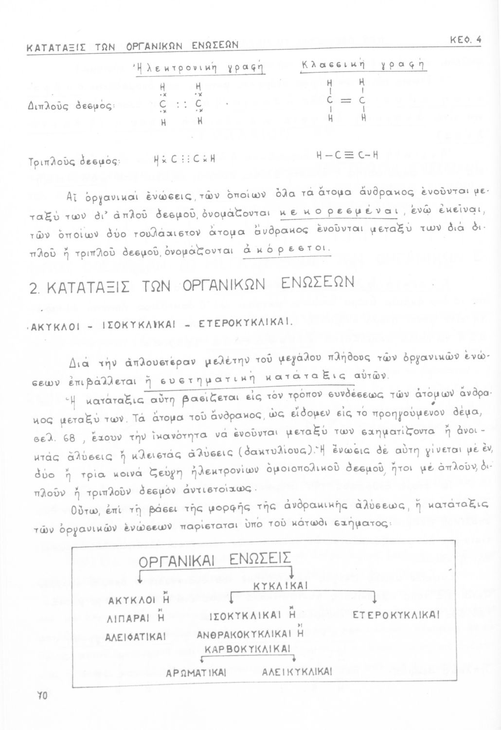 Σχολικό εγχειρίδιο για τις τάξεις του Γυμνασίου και τις Ανώτατες Σχολές για το μάθημα της Χημείας. Το εγχειρίδιο περιλαμβάνει εισαγωγικά γενικές γνώσεις της οργανικής χημείας, την σύνταξη των οργανικών ενώσεων, τις καύσιμες ύλες, αλκοόλες, υδρογονάνθρακες, αρωματικά οξέα, τα αλκαλοειδή, τα εντομοκτόνα κ.α.