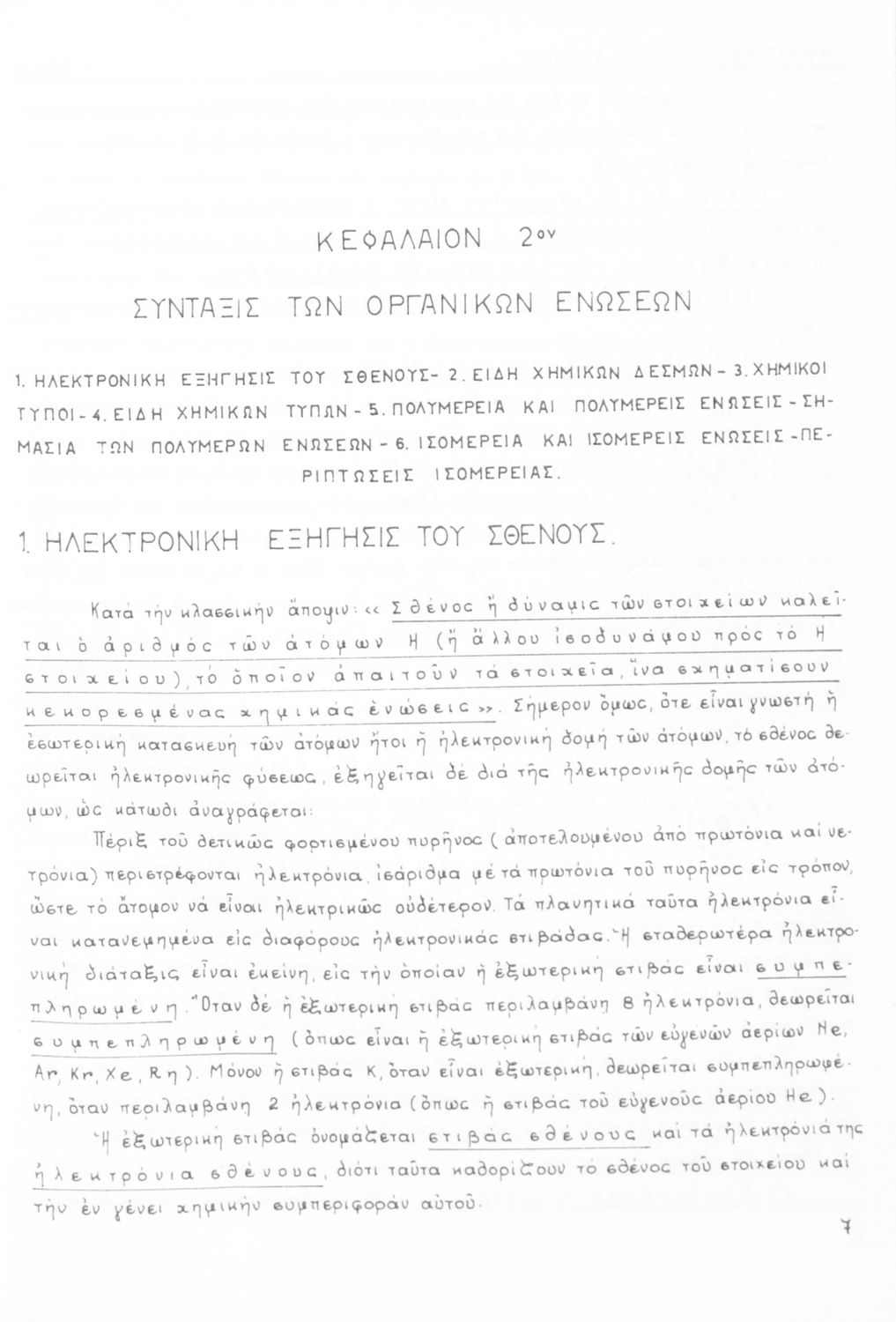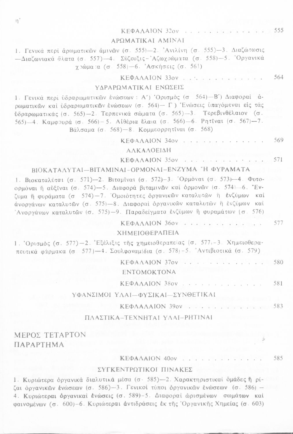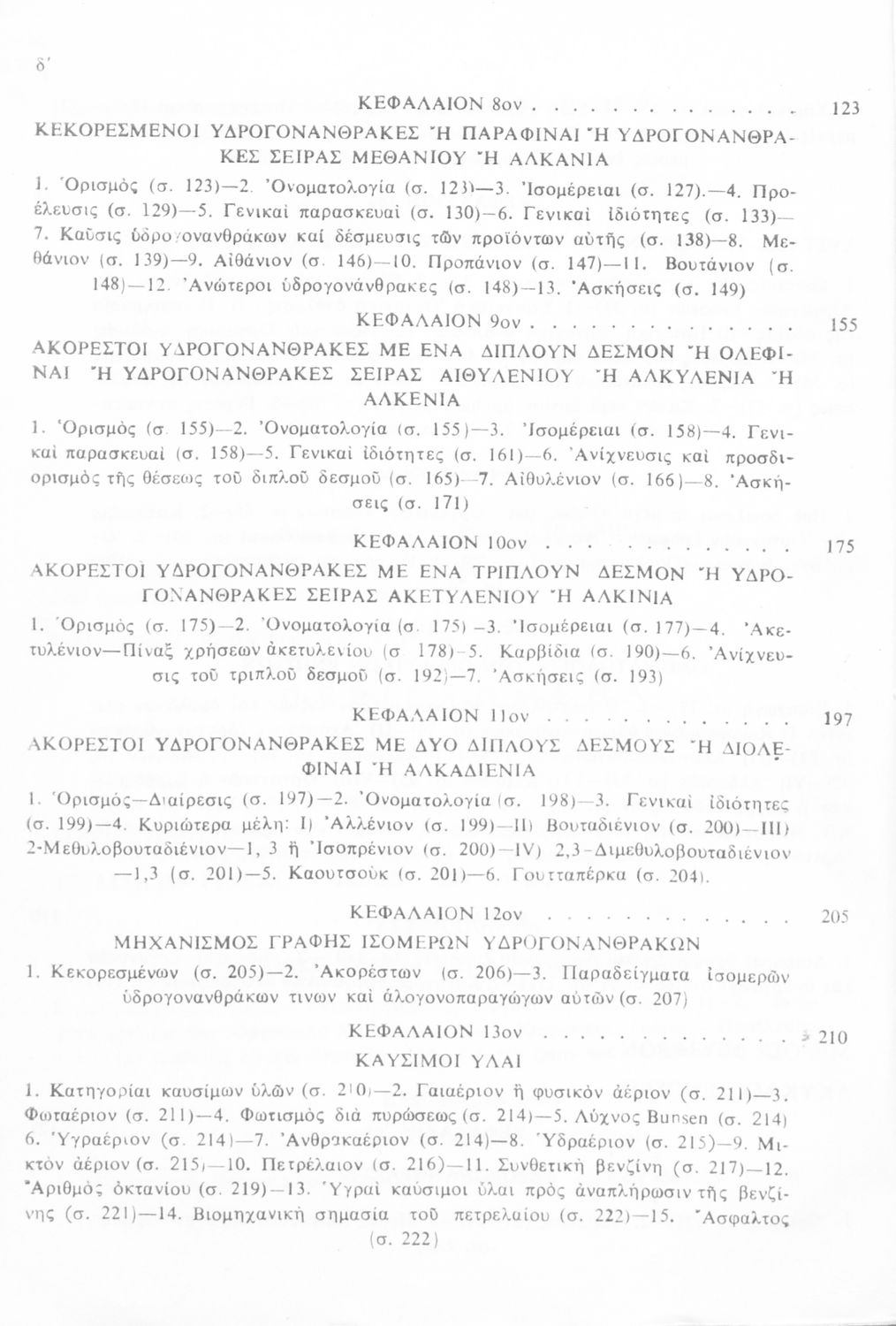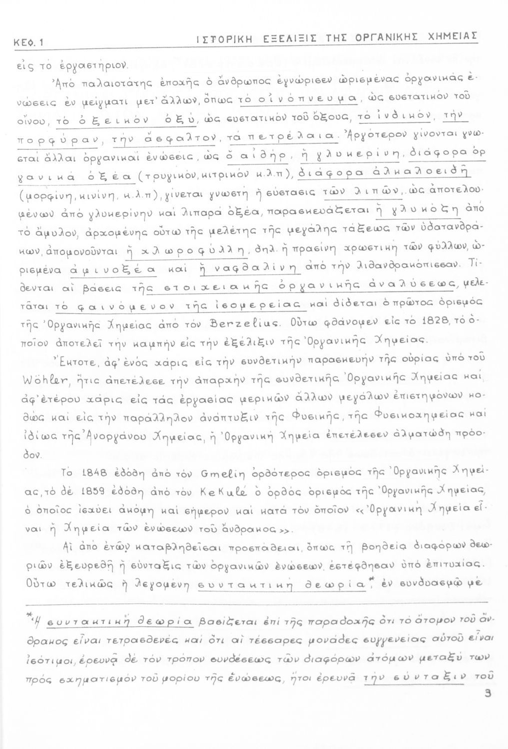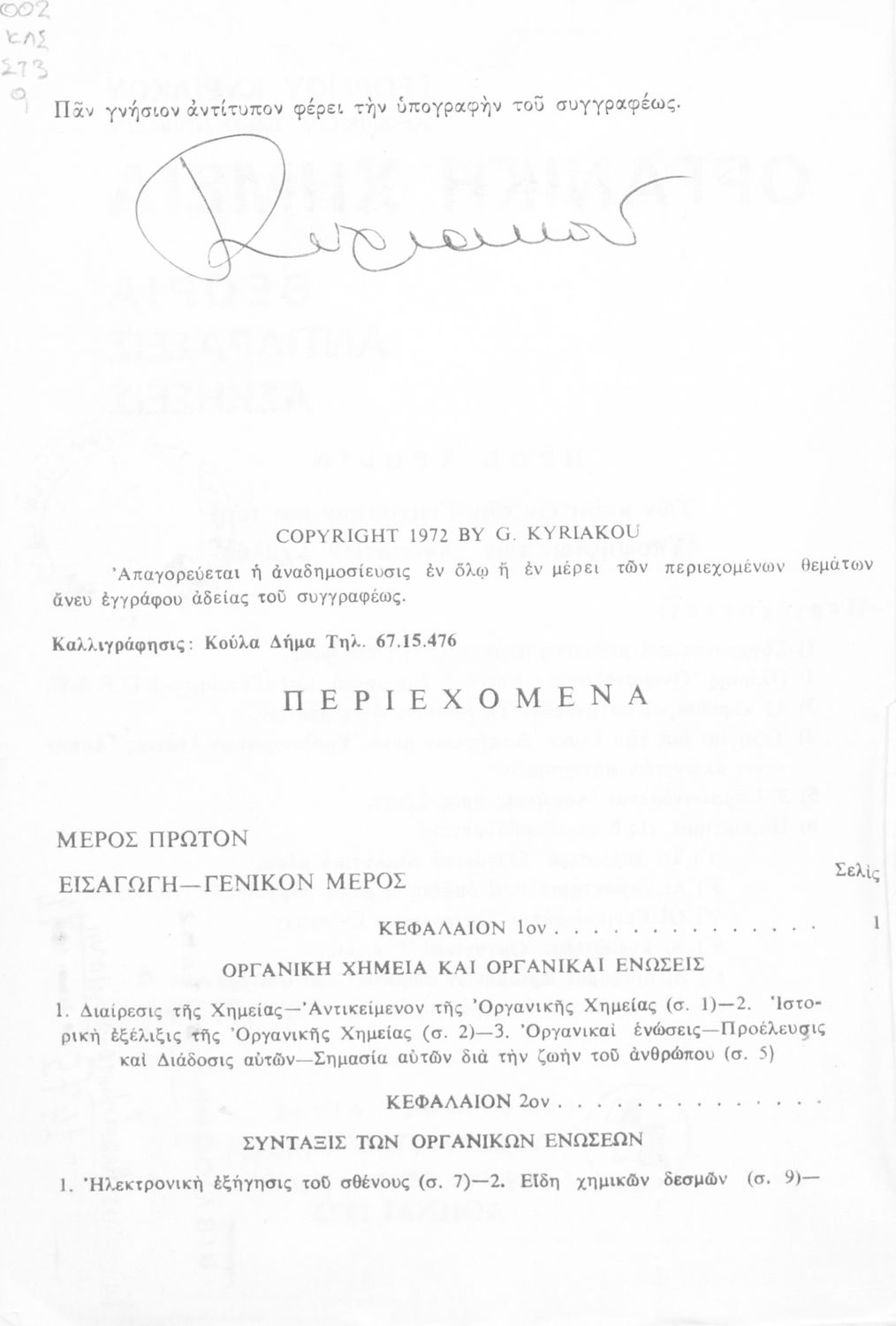 Σχολικό εγχειρίδιο για τις τάξεις του Γυμνασίου και τις Ανώτατες Σχολές για το μάθημα της Χημείας. Το εγχειρίδιο περιλαμβάνει εισαγωγικά γενικές γνώσεις της οργανικής χημείας, την σύνταξη των οργανικών ενώσεων, τις καύσιμες ύλες, αλκοόλες, υδρογονάνθρακες, αρωματικά οξέα, τα αλκαλοειδή, τα εντομοκτόνα κ.α.
