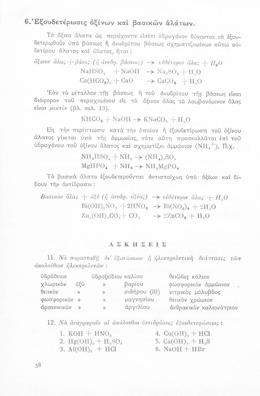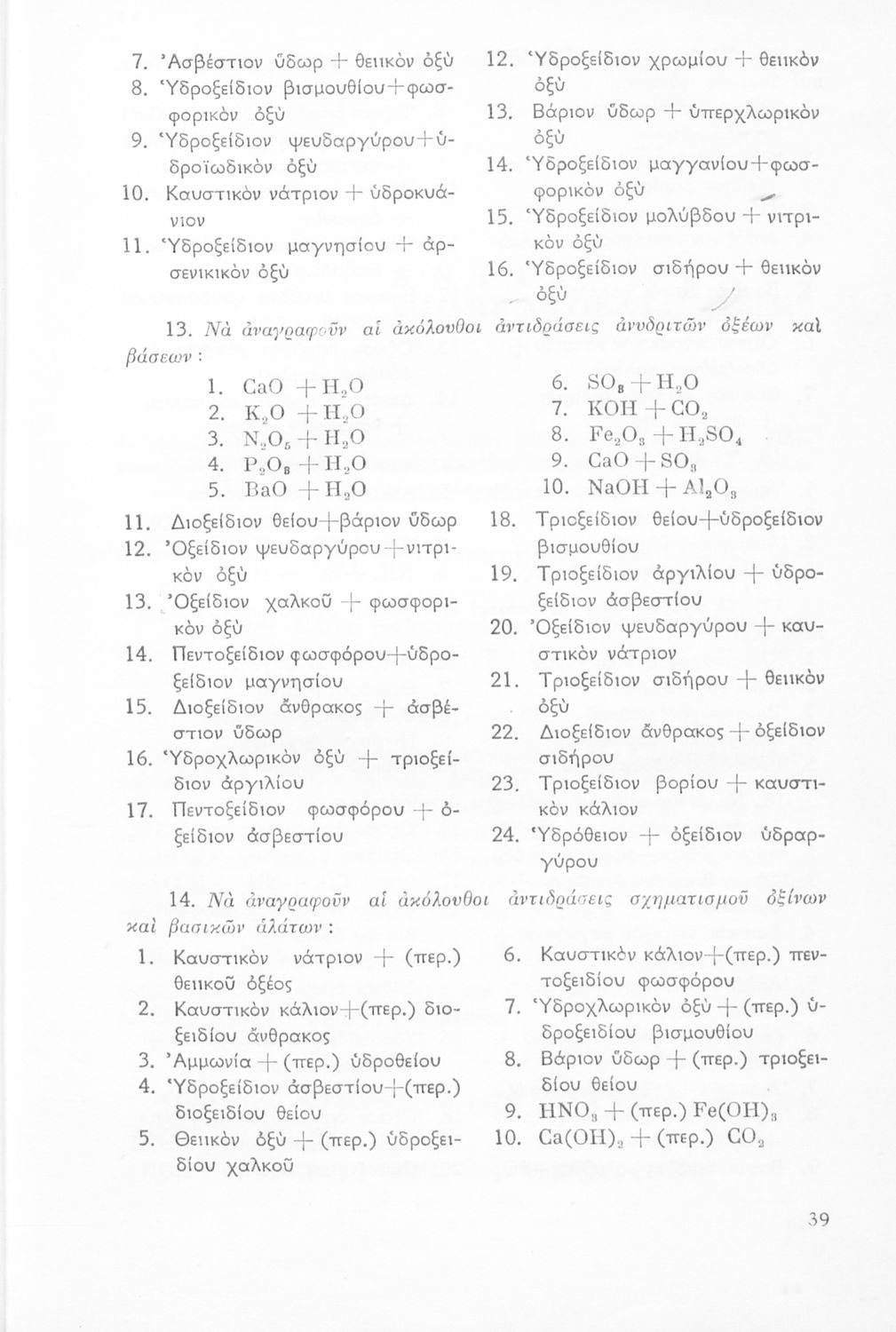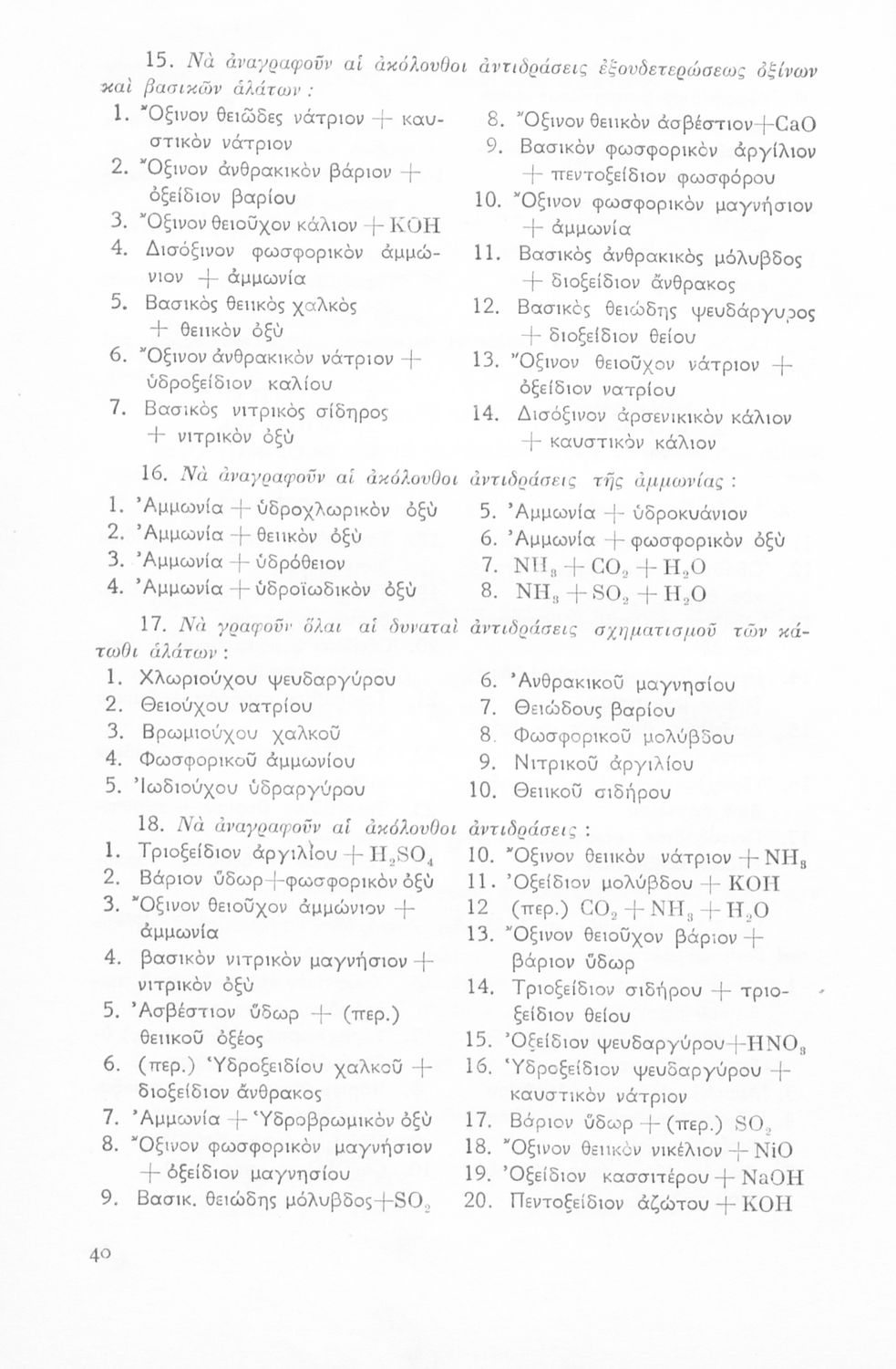 Μαθητικό βοήθημα Χημείας για τους μαθητές των τελευταίων τάξεων του Γυμνασίου και τους υποψηφίους των Ανωτάτων Σχολών που περιέχει ασκήσεις ανόργανης χημείας.
