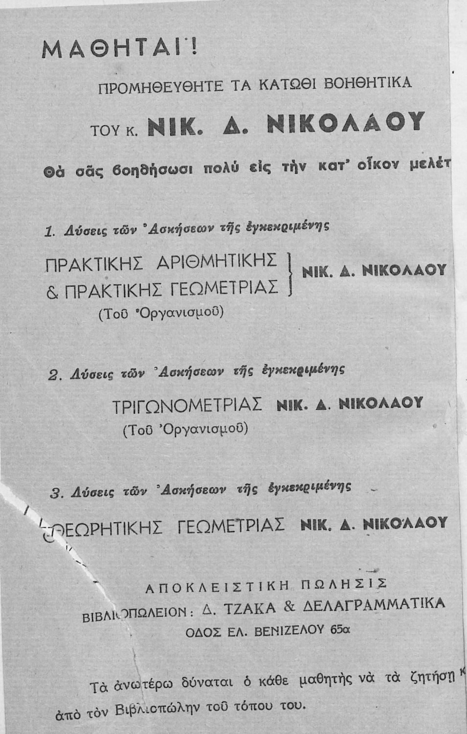 Μαθητικό βοήθημα τριγωνομετρίας που περιέχει τις λύσεις των ασκήσεων που περιλαμβάνονται στο εγκεκριμένο σχολικό εγχειρίδιο που είχε συγγράψει ο Νικ. Νικολάου