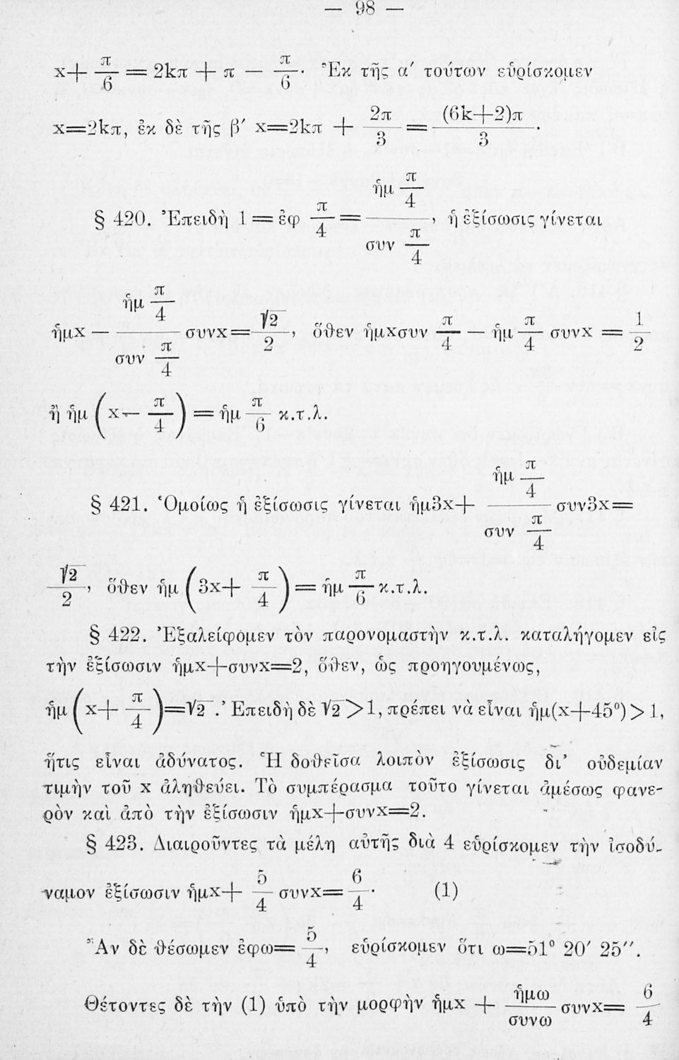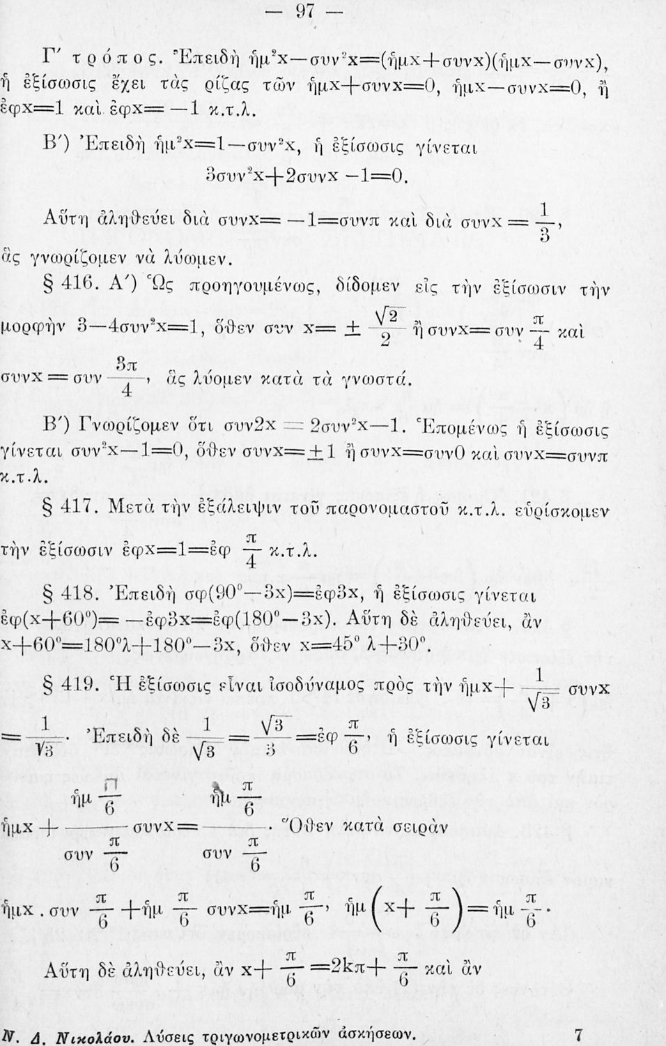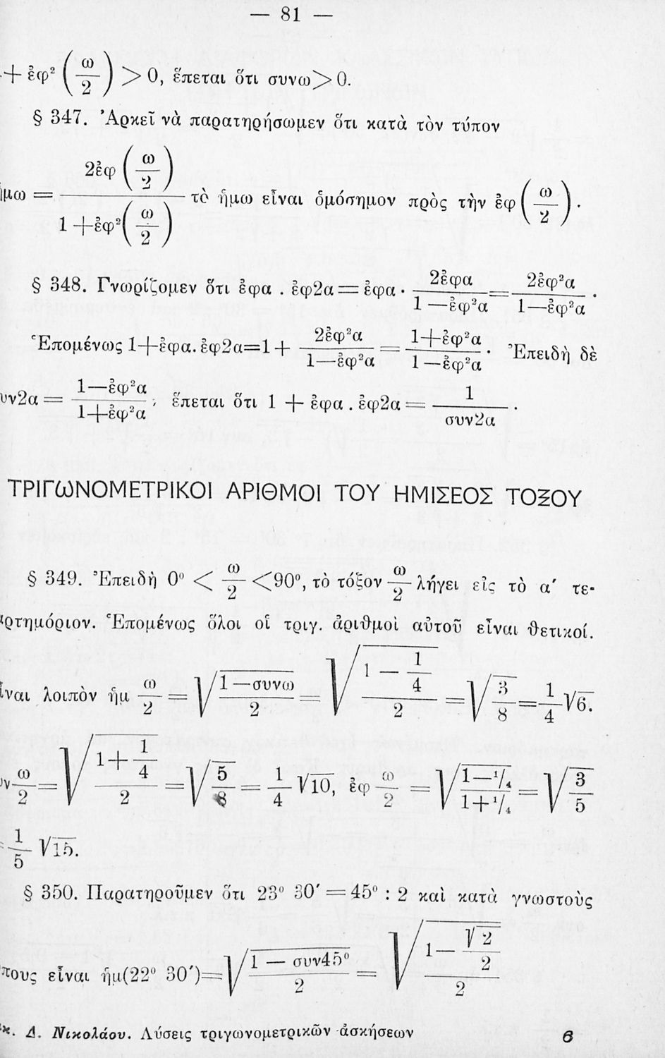 Μαθητικό βοήθημα τριγωνομετρίας που περιέχει τις λύσεις των ασκήσεων που περιλαμβάνονται στο εγκεκριμένο σχολικό εγχειρίδιο που είχε συγγράψει ο Νικ. Νικολάου