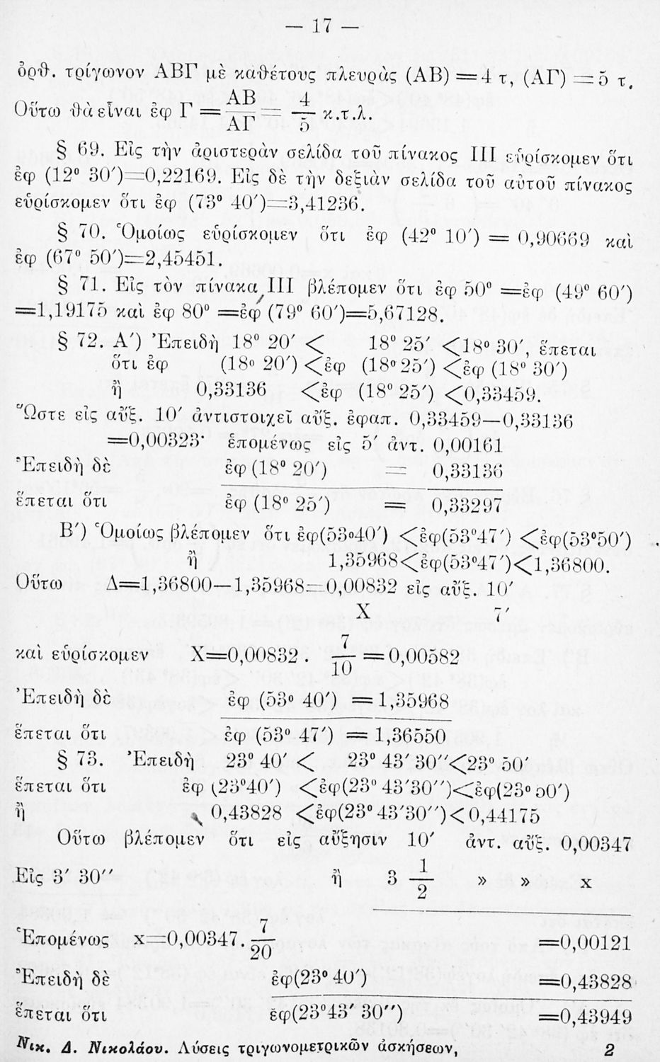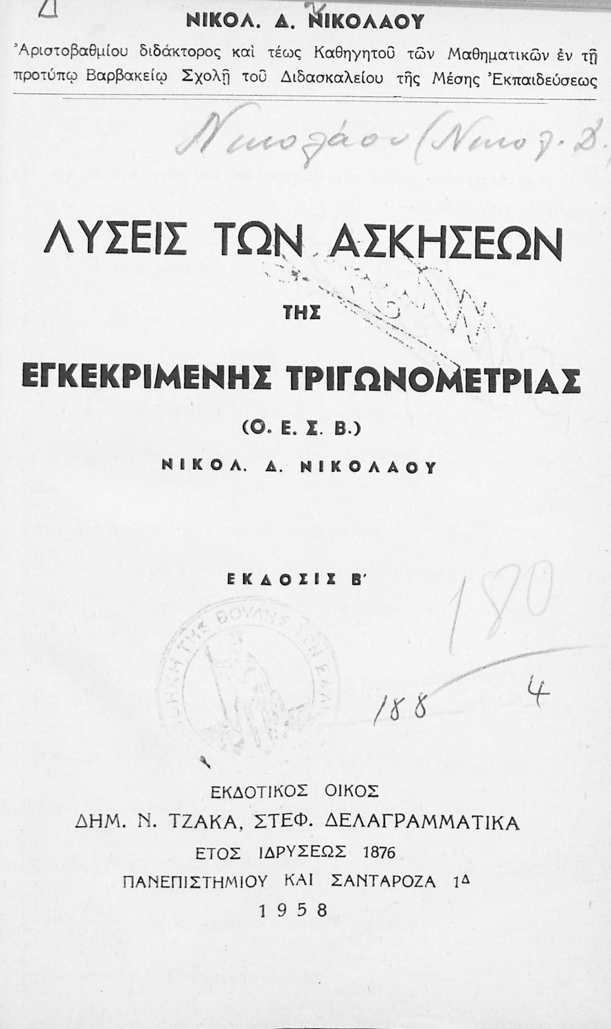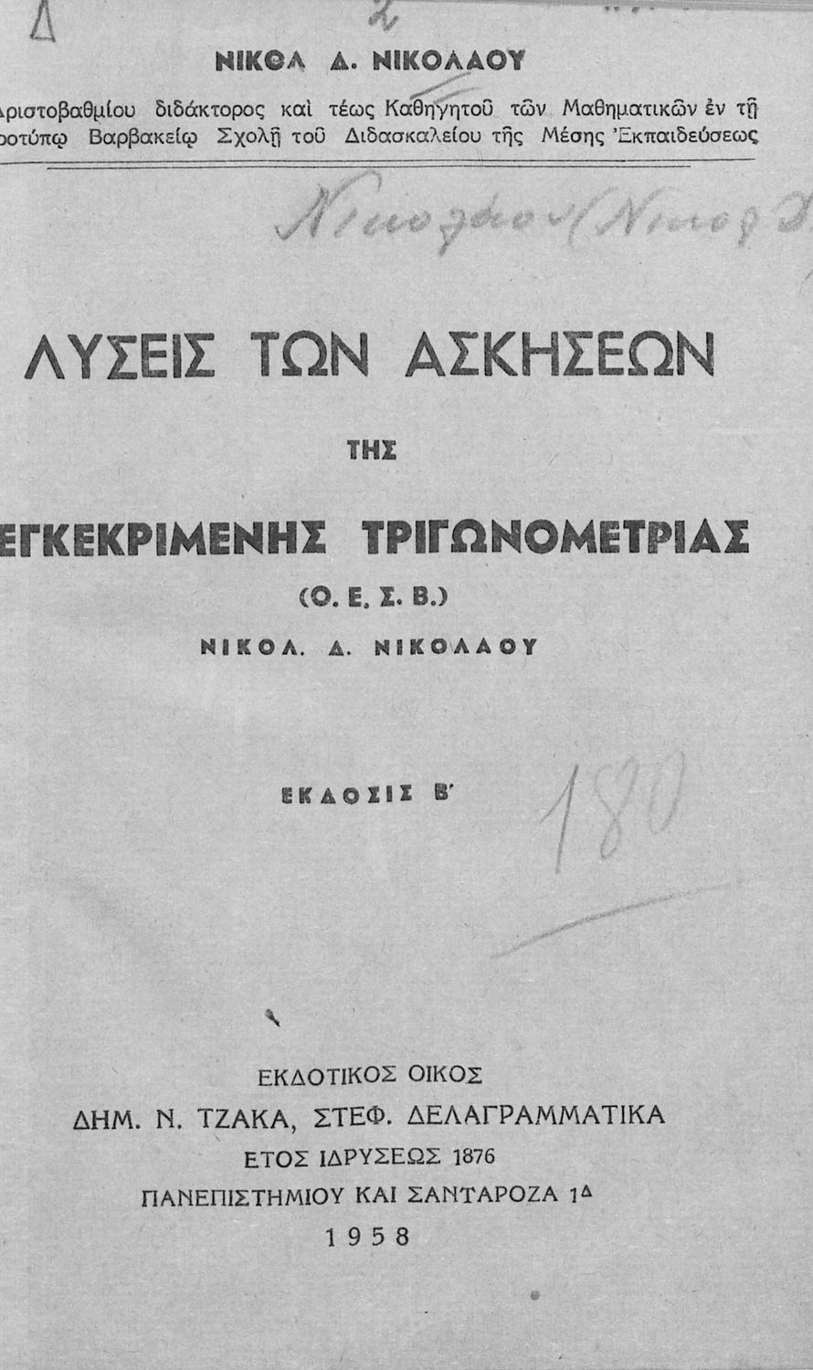 Μαθητικό βοήθημα τριγωνομετρίας που περιέχει τις λύσεις των ασκήσεων που περιλαμβάνονται στο εγκεκριμένο σχολικό εγχειρίδιο που είχε συγγράψει ο Νικ. Νικολάου
