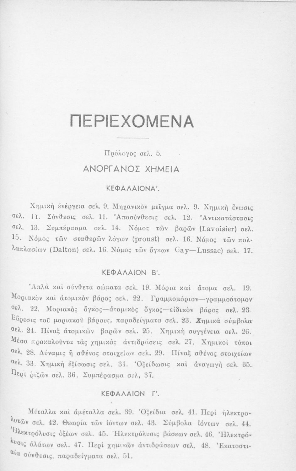 Σχολικό εγχειρίδιο Χημείας για τους μαθητές της Ε' Γυμνασίου. Χωρίζεται σε τρία μέρη. Στο πρώτο μέρος είναι μια γενική εισαγωγή στους θεμελιώδεις νόμους της Χημείας, τις χημικές αντιδράσεις, τα χημικά σύμβολα.