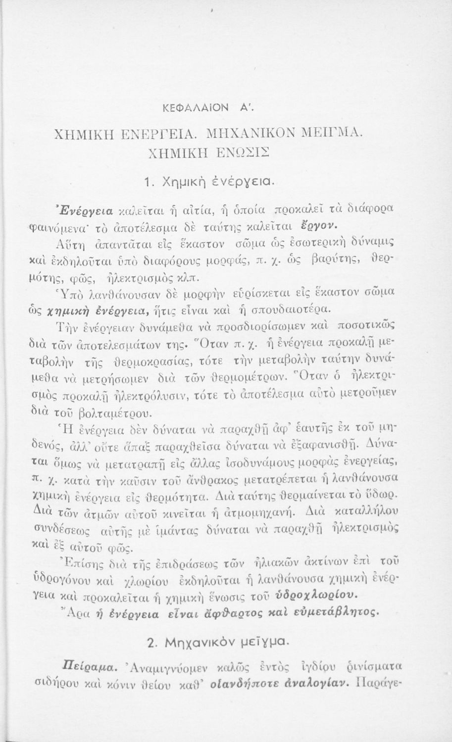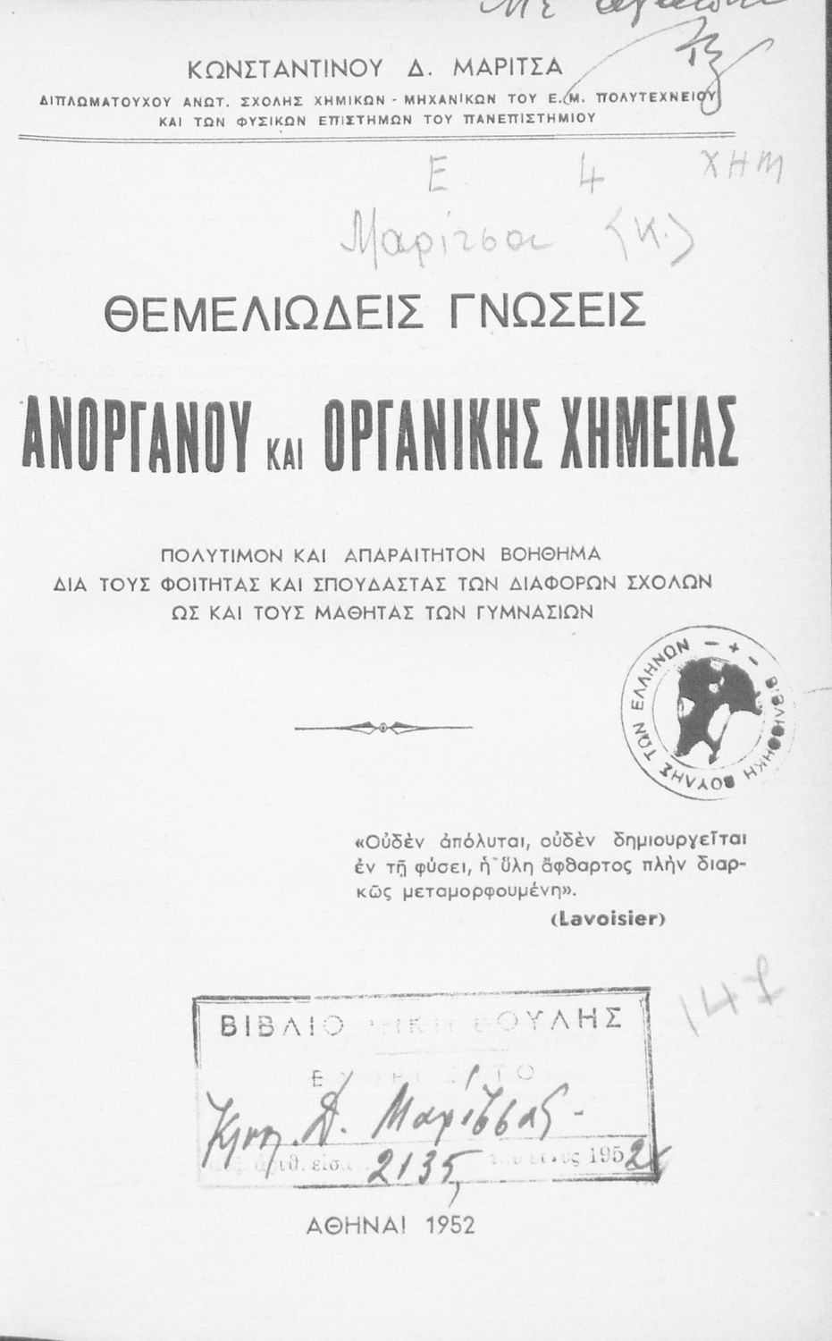 Σχολικό εγχειρίδιο Χημείας για τους μαθητές της Ε' Γυμνασίου. Χωρίζεται σε τρία μέρη. Στο πρώτο μέρος είναι μια γενική εισαγωγή στους θεμελιώδεις νόμους της Χημείας, τις χημικές αντιδράσεις, τα χημικά σύμβολα.