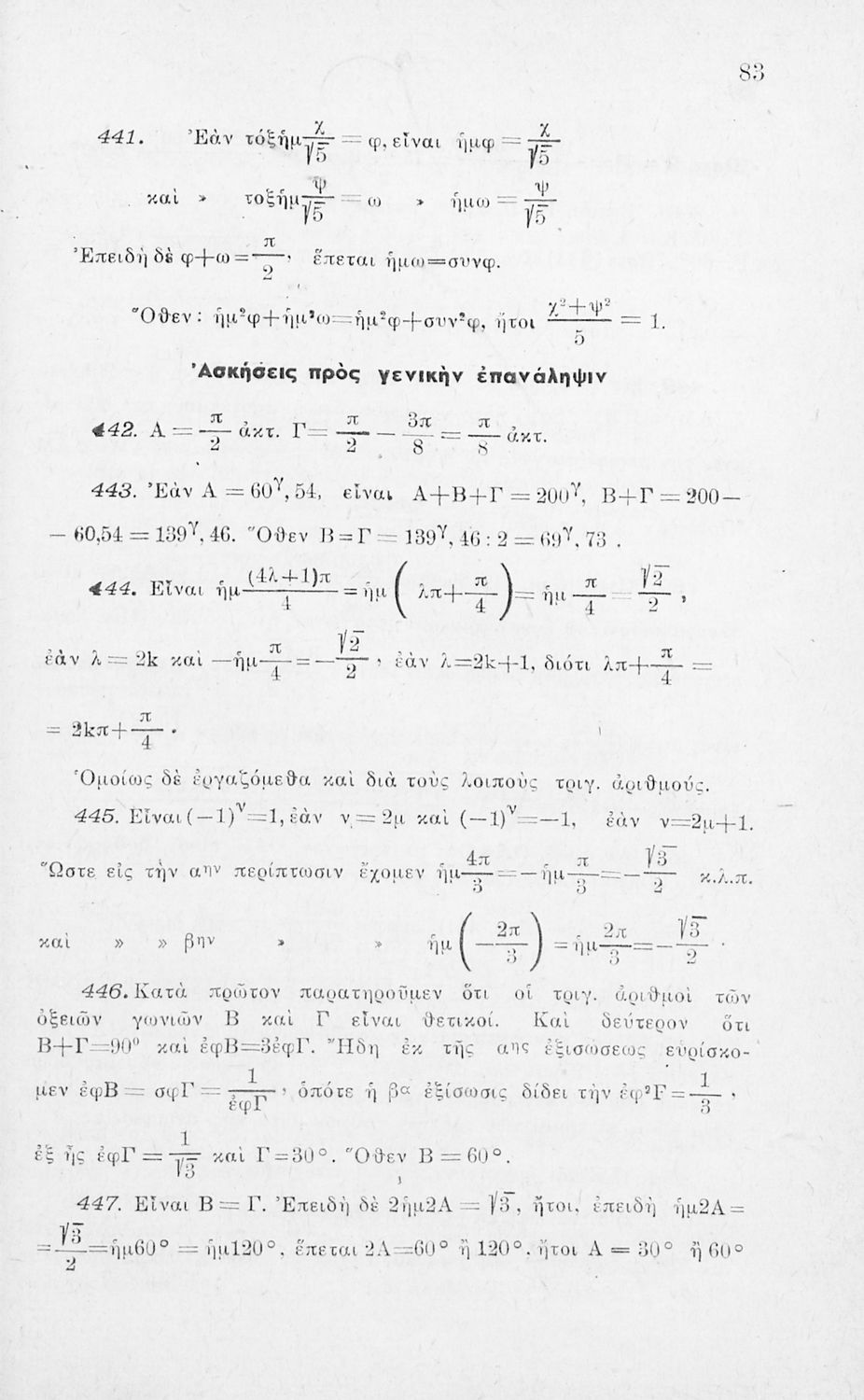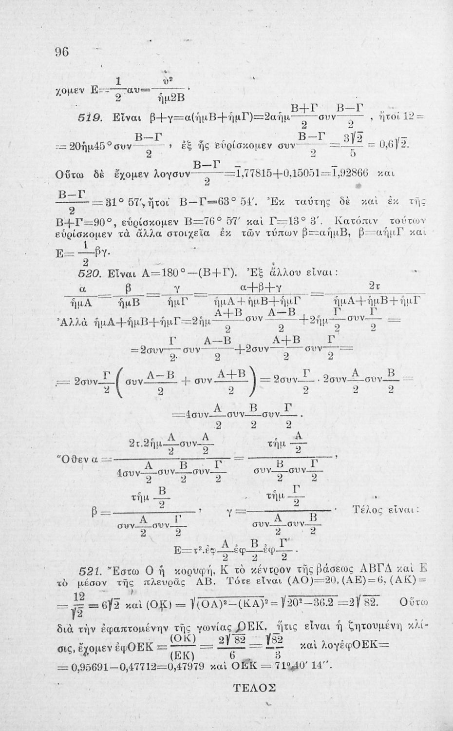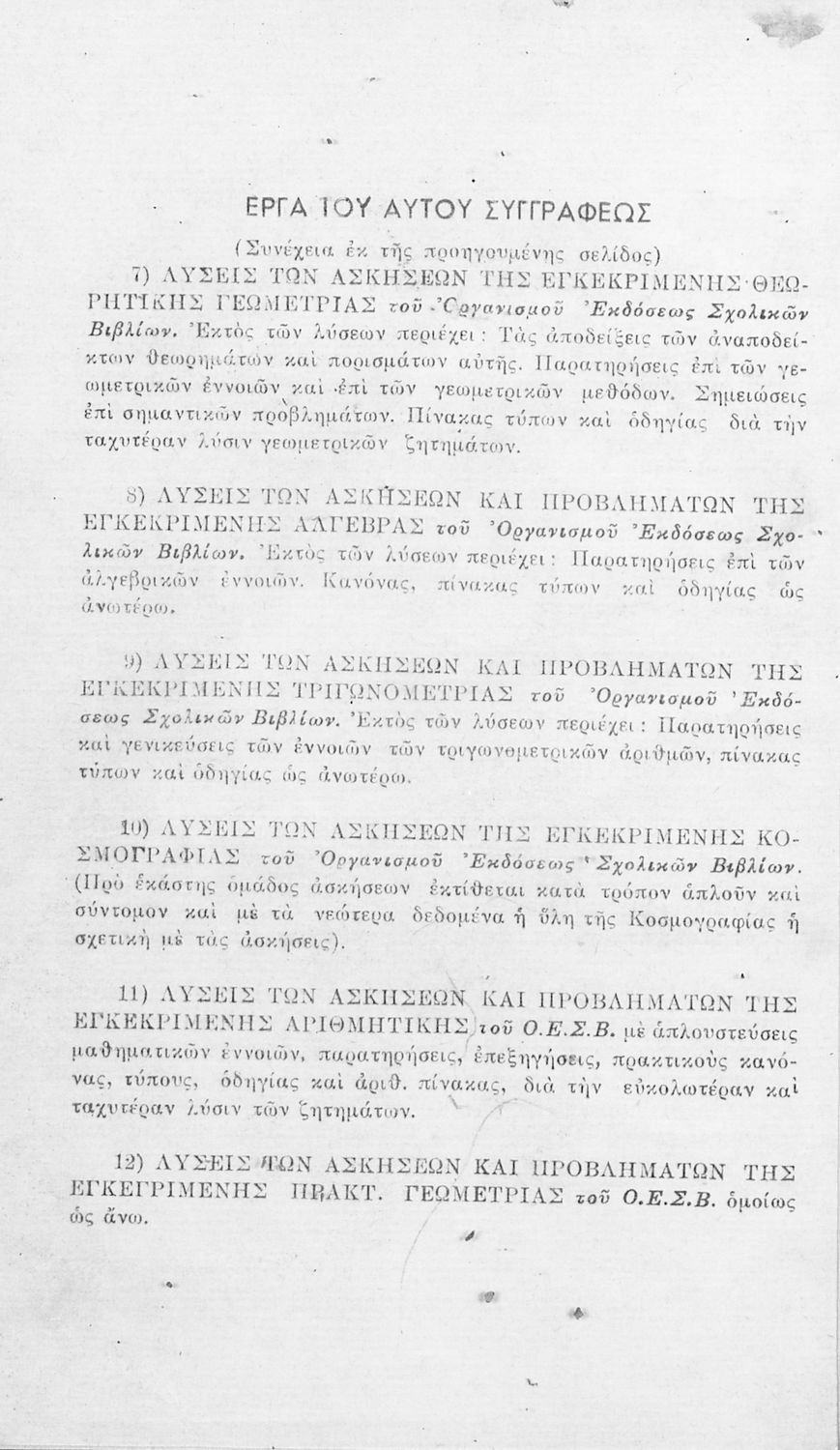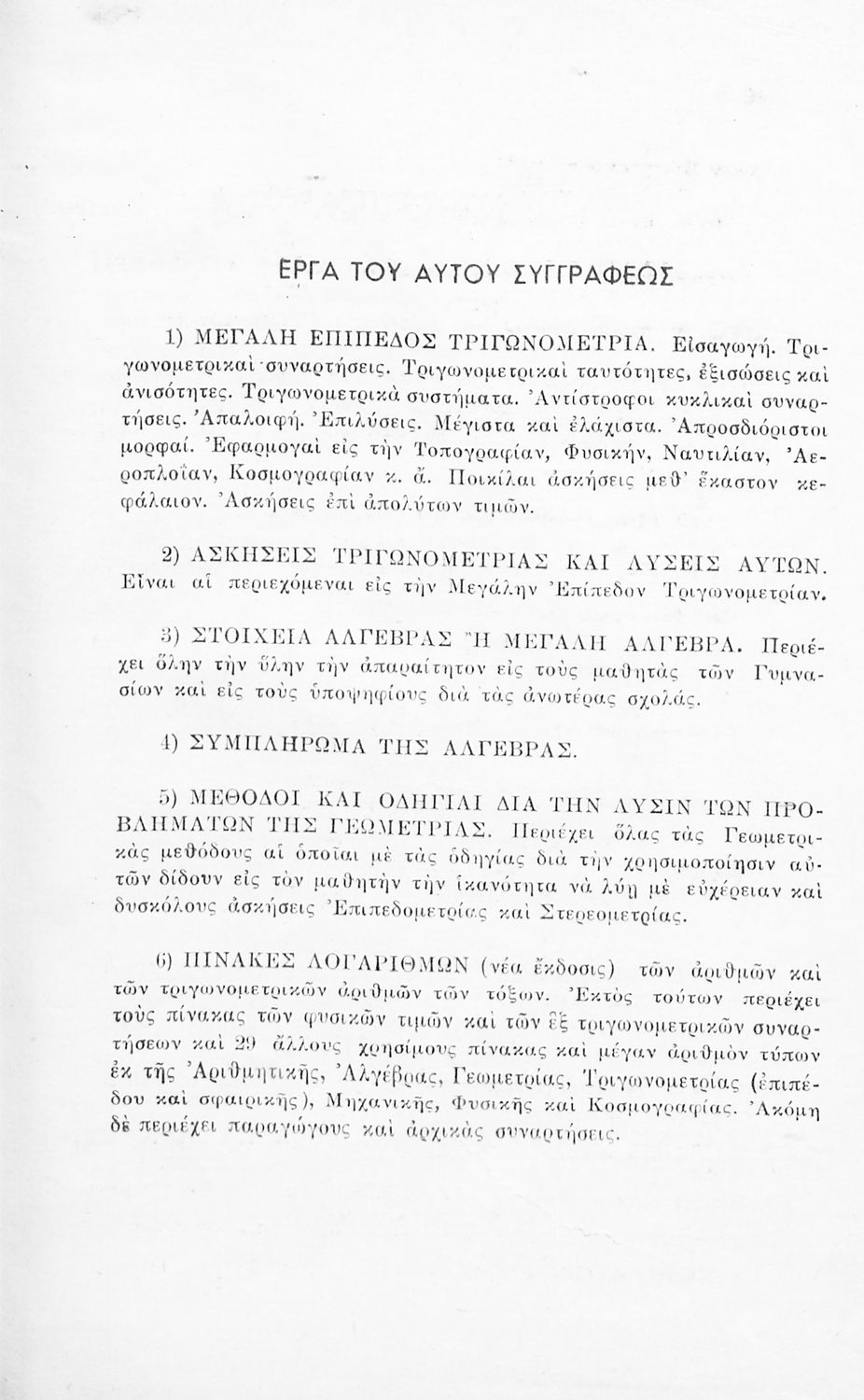 520 ## _aΜαθητικό βοήθημα Τριγωνομετρίας το οποίο περιλαμβάνει λύσεις ασκήσεων τις εγκεκριμένης Τριγωνομετρίας του Οργανισμού Εκδόσεως Σχολικών Βιβλίων, παρατηρήσεις επί των εννοιών της Άλγεβρας και σημειώσεις σχετικά με τους κανόνες και τύπους για την ταχύτερη λύση των ασκήσεων Τριγωνομετρίας.