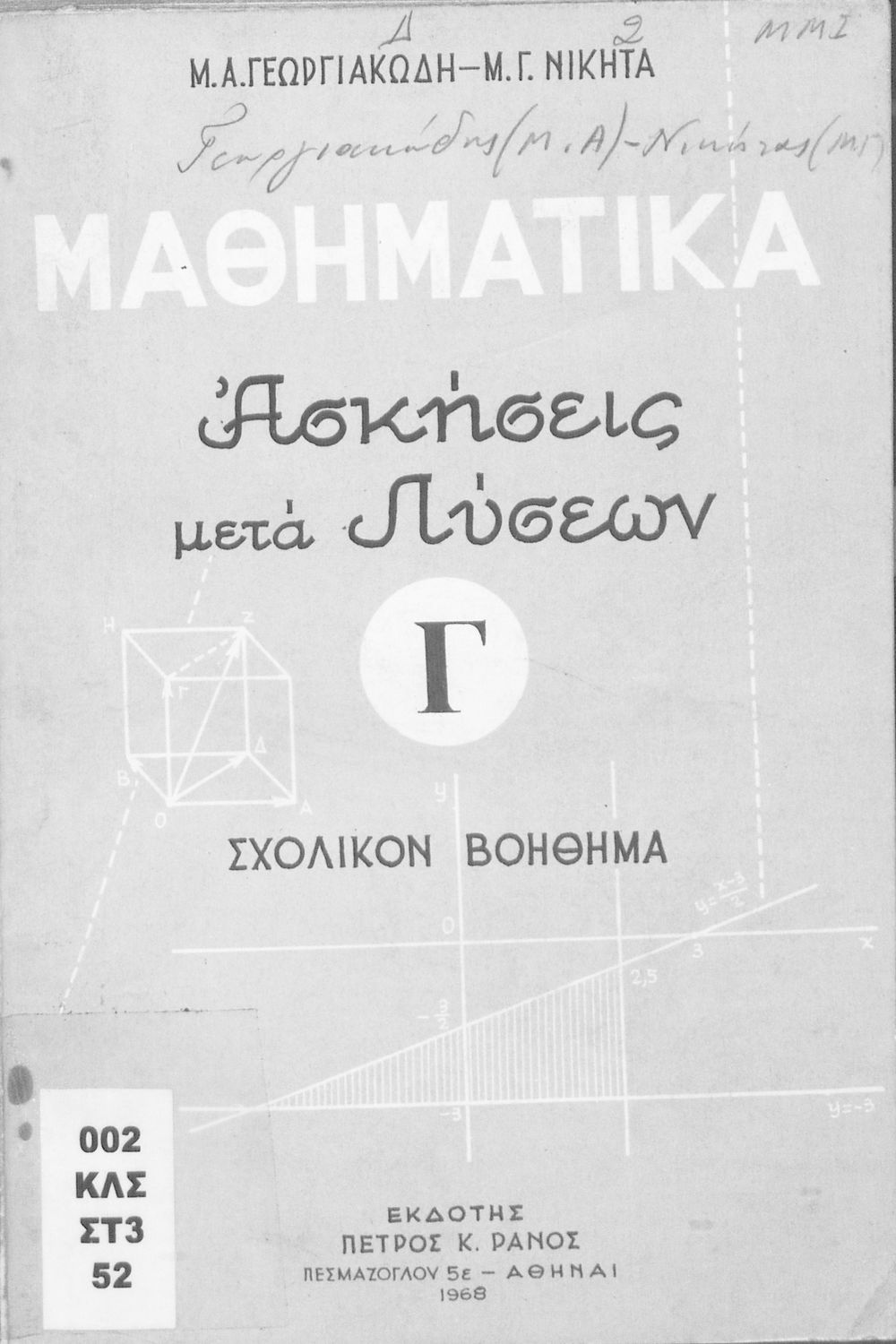 Σχολικό εγχειρίδιο Μαθηματικών Γ΄ Λυκείου που είναι χωρισμένο σε θεωρήματα, παραδείγματα και ασκήσεις και περιλαμβάνει στοιχεία Ανώτερης Άλγεβρας και Μαθηματικής Ανάλυσης.