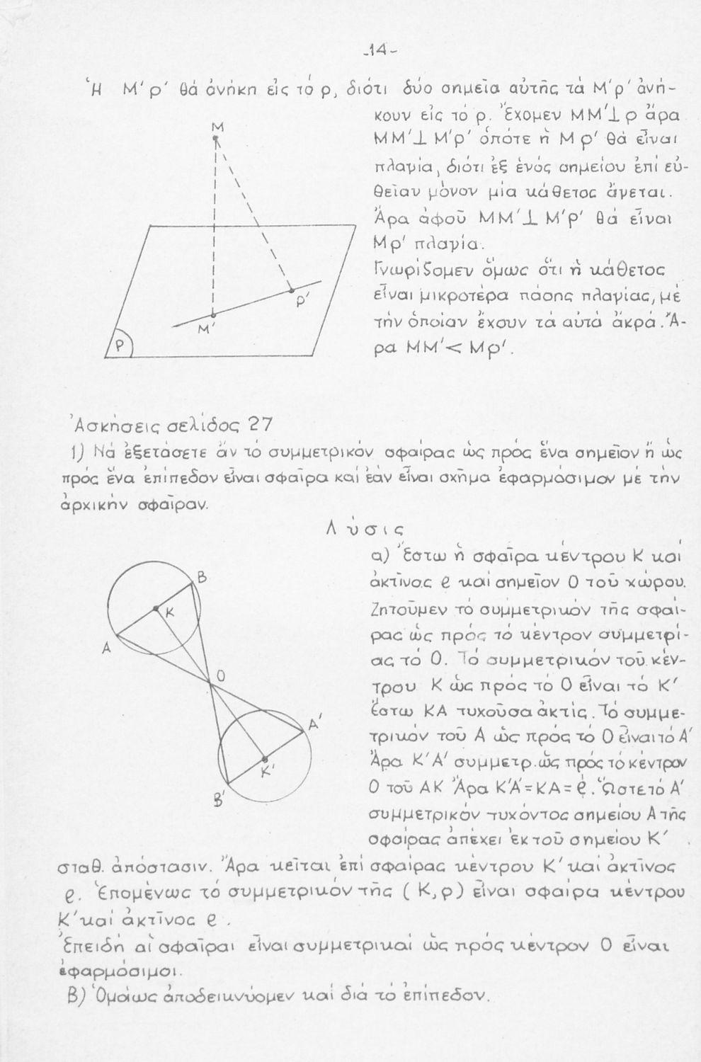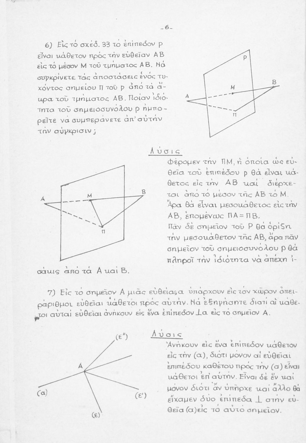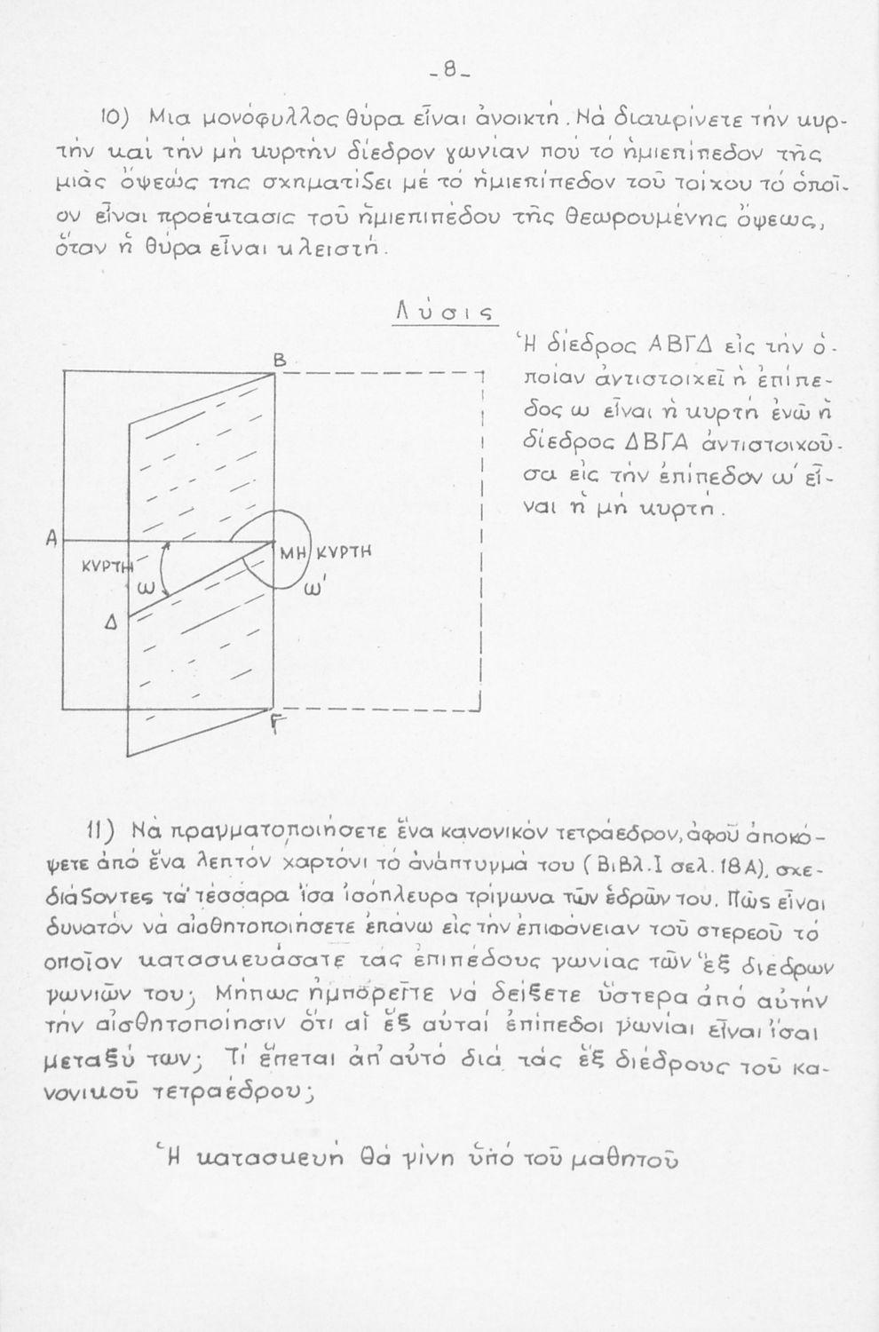 Σχολικό εγχειρίδιο Γεωμετρίας για τις Γ΄, Δ΄, Ε΄, ΣΤ΄ Γυμνασίου που περιλαμβάνει θεωρία και ασκήσεις και είναι χωρισμένο σε Επιπεδομετρία και Στερεομετρία. Φέρει το σύμβολο της δικτατορίας.
