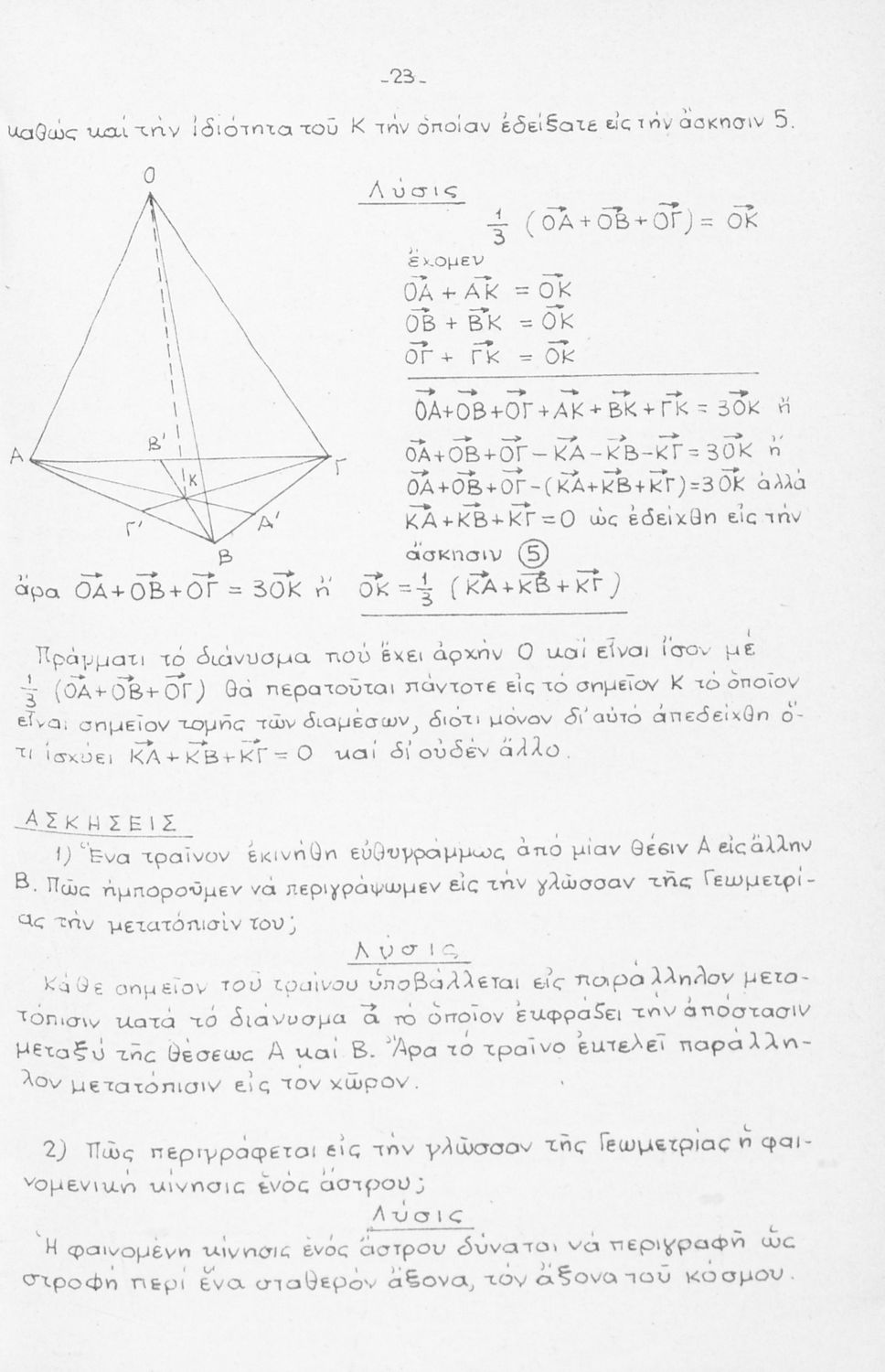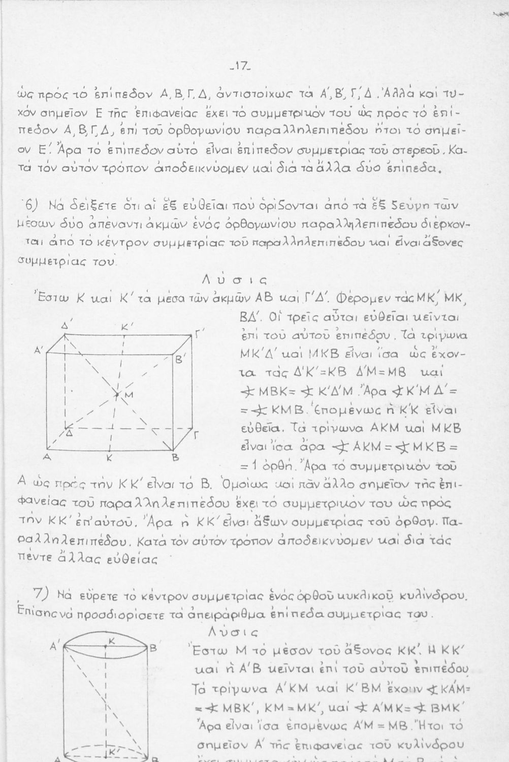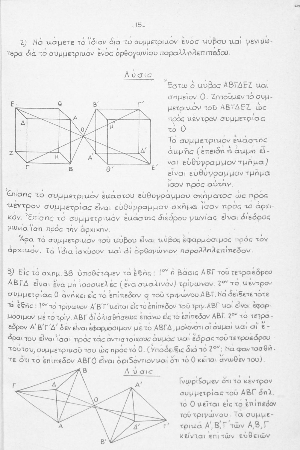Σχολικό εγχειρίδιο Γεωμετρίας για τις Γ΄, Δ΄, Ε΄, ΣΤ΄ Γυμνασίου που περιλαμβάνει θεωρία και ασκήσεις και είναι χωρισμένο σε Επιπεδομετρία και Στερεομετρία. Φέρει το σύμβολο της δικτατορίας.