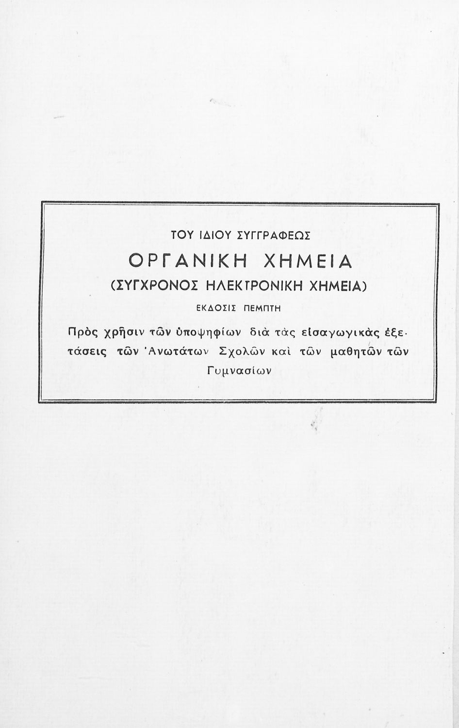 Μαθητικό βοήθημα Χημείας για τους υποψηφίους των εισαγωγικών εξετάσεων των ανωτάτων σχολών και των μαθητών της Ζ' τάξεως των Γυμνασίων και Πρακτικών Λυκείων. Το βιβλίο περιέχει γενικές έννοιες της Χημείας, ...