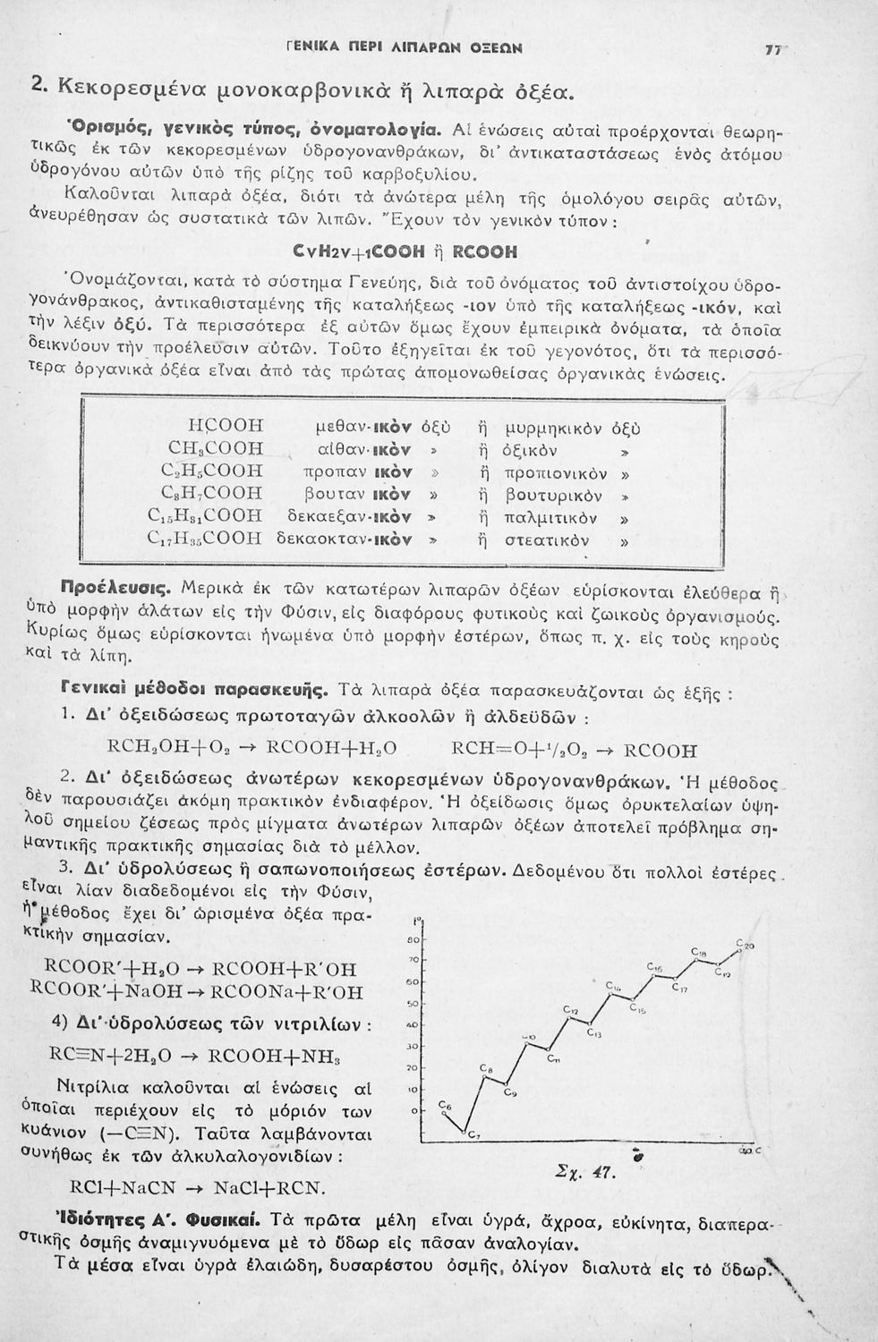 Βαθμίδα εκπαίδευσης: Δευτεροβάθμια Τάξη: Γυμνάσιο Μάθημα: Χημεία Γλώσσα: Απλή καθαρεύουσα Παρουσίαση περιεχομένου: Μαθητικό βοήθημα για τους υποψήφιους των Ανωτάτων Σχολών και των μαθητών της τελευταίας τάξεως των σχολείων της Μέσης Εκπαίδευσης. Το βιβλίο εξετάζει τις οργανικές ενώσεις, γενική θεωρία για αυτές, μετά κυκλικές και άκυκλες ενώσεις και ολοκληρώνει με ζητήματα βιολογικής βιομηχανικής σημασίας όπως η χημειοθεραπεία και η χρήση των εντομοκτόνων. |