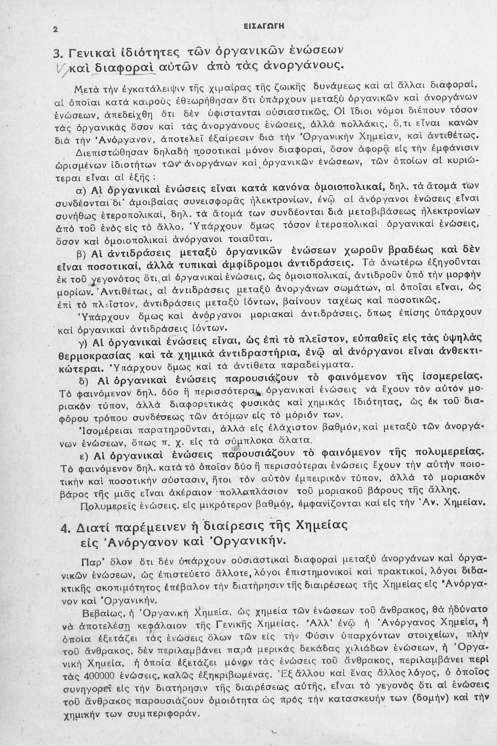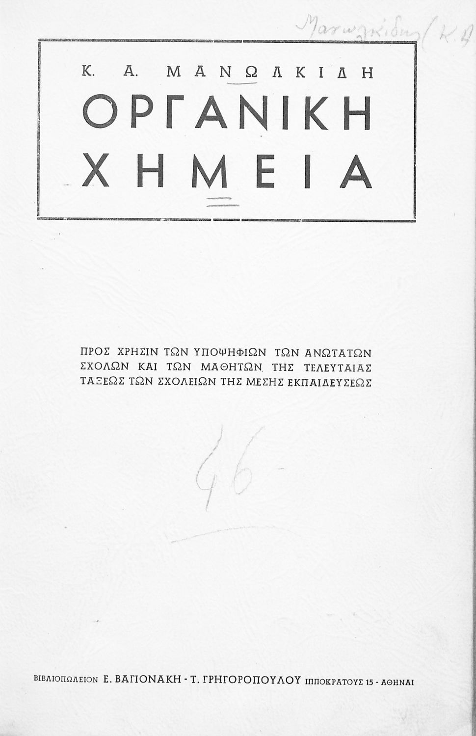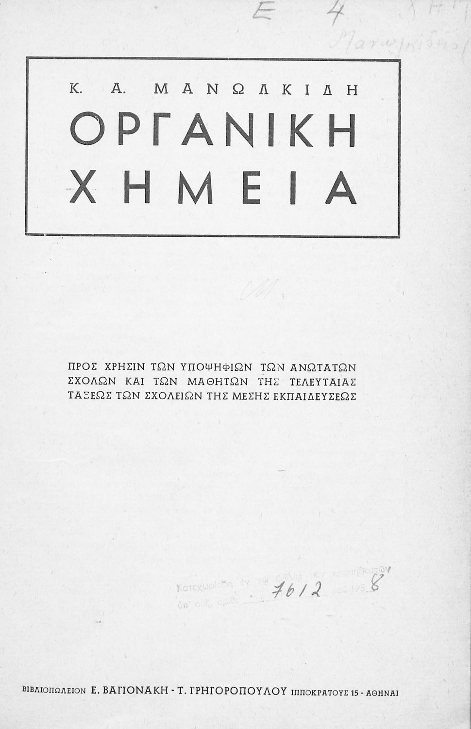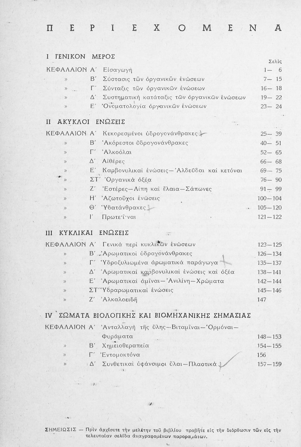 Μαθητικό βοήθημα για τους υποψήφιους των Ανωτάτων Σχολών και των μαθητών της τελευταίας τάξεως των σχολείων της Μέσης Εκπαίδευσης. Το βιβλίο εξετάζει τις οργανικές ενώσεις, γενική θεωρία για αυτές, μετά κυκλικές και άκυκλες ενώσεις και ολοκληρώνει με ζητήματα βιολογικής βιομηχανικής σημασίας όπως η χημειοθεραπεία και η χρήση των εντομοκτόνων.