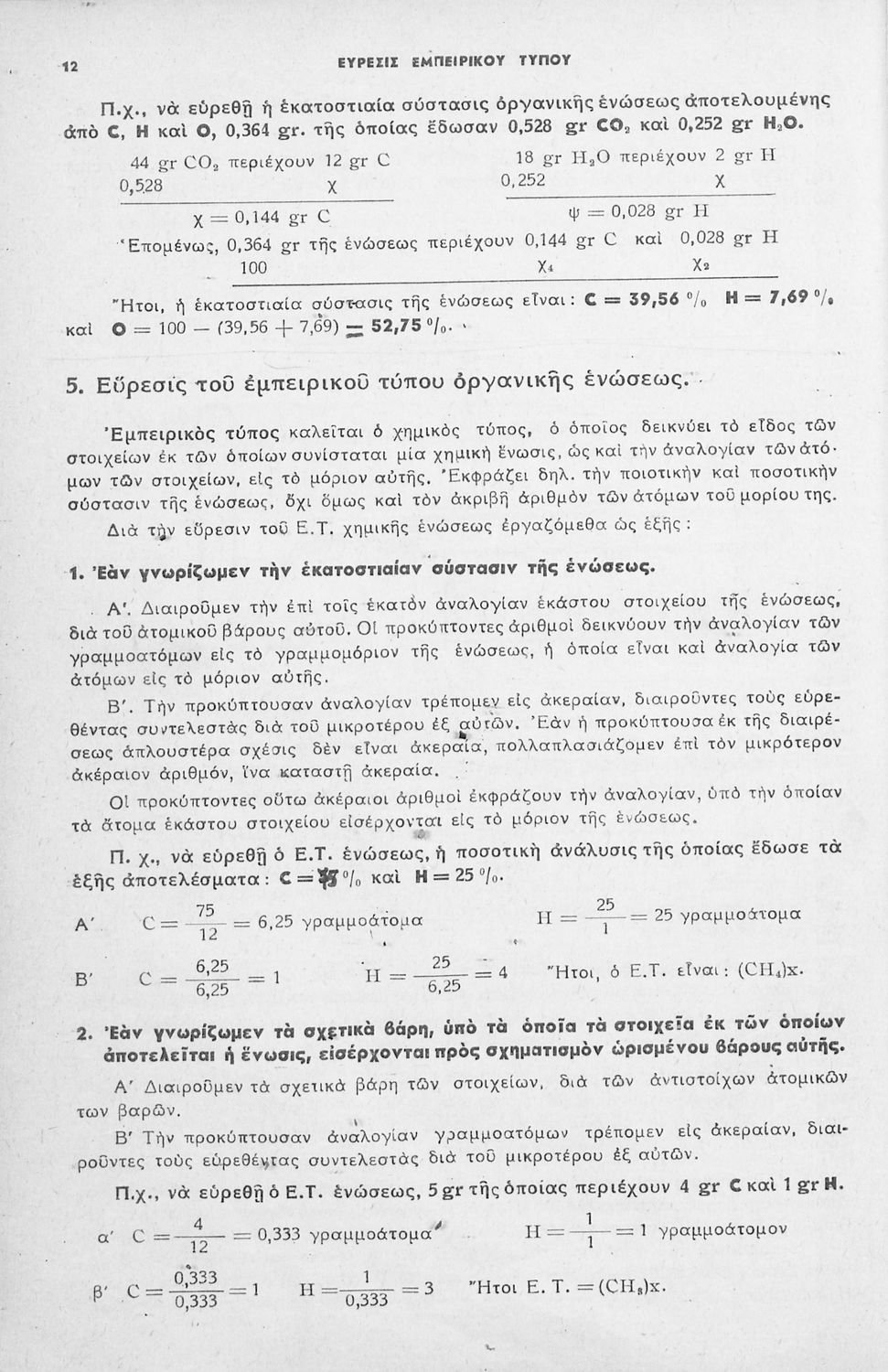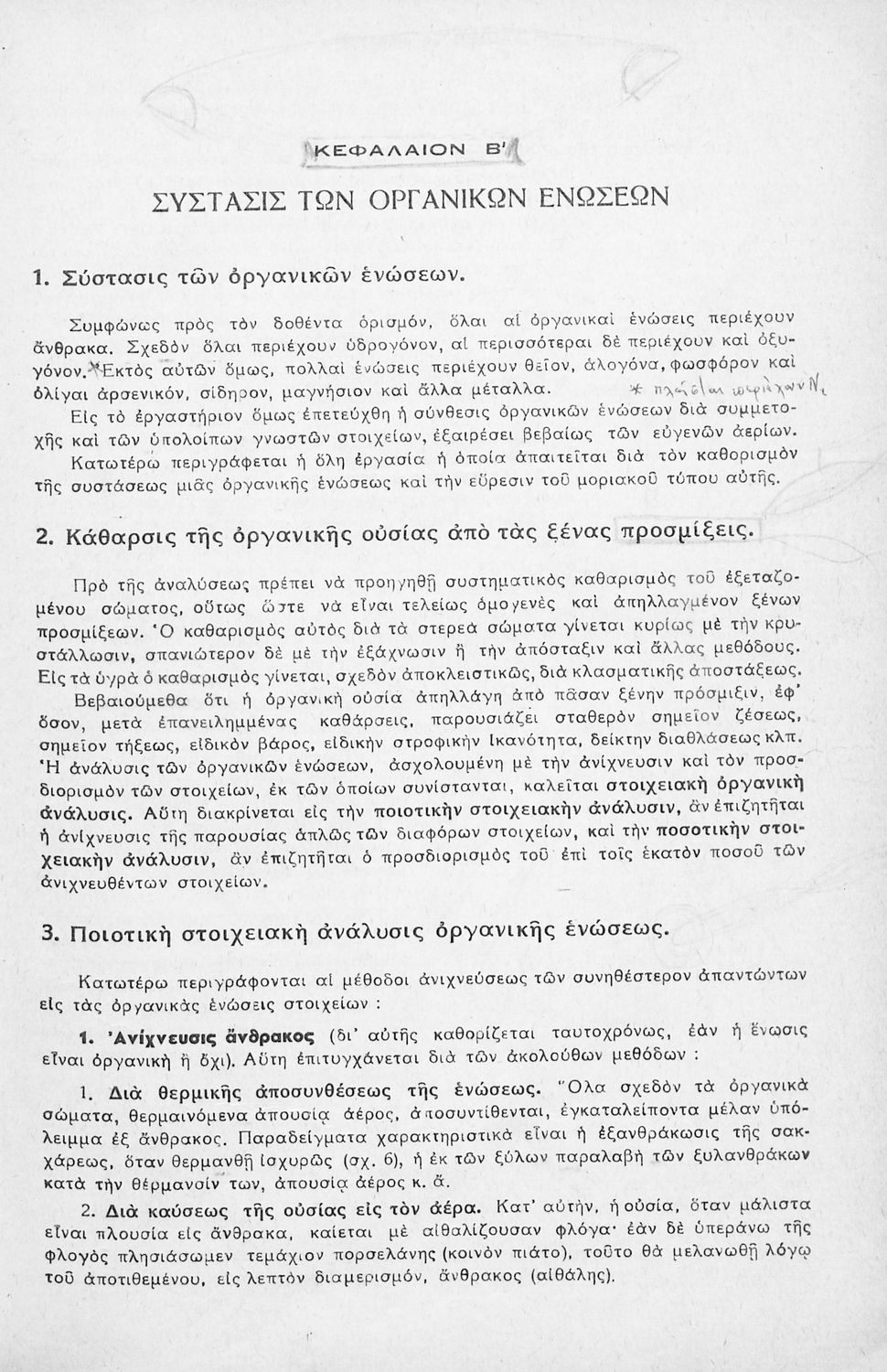 Βαθμίδα εκπαίδευσης: Δευτεροβάθμια Τάξη: Γυμνάσιο Μάθημα: Χημεία Γλώσσα: Απλή καθαρεύουσα Παρουσίαση περιεχομένου: Μαθητικό βοήθημα για τους υποψήφιους των Ανωτάτων Σχολών και των μαθητών της τελευταίας τάξεως των σχολείων της Μέσης Εκπαίδευσης. Το βιβλίο εξετάζει τις οργανικές ενώσεις, γενική θεωρία για αυτές, μετά κυκλικές και άκυκλες ενώσεις και ολοκληρώνει με ζητήματα βιολογικής βιομηχανικής σημασίας όπως η χημειοθεραπεία και η χρήση των εντομοκτόνων. |