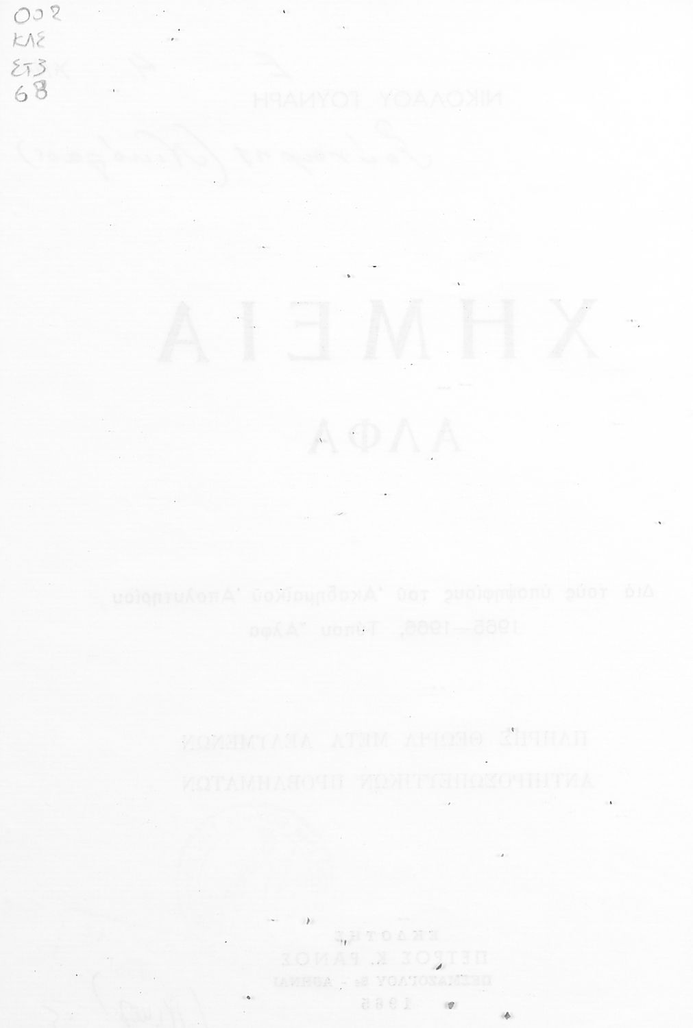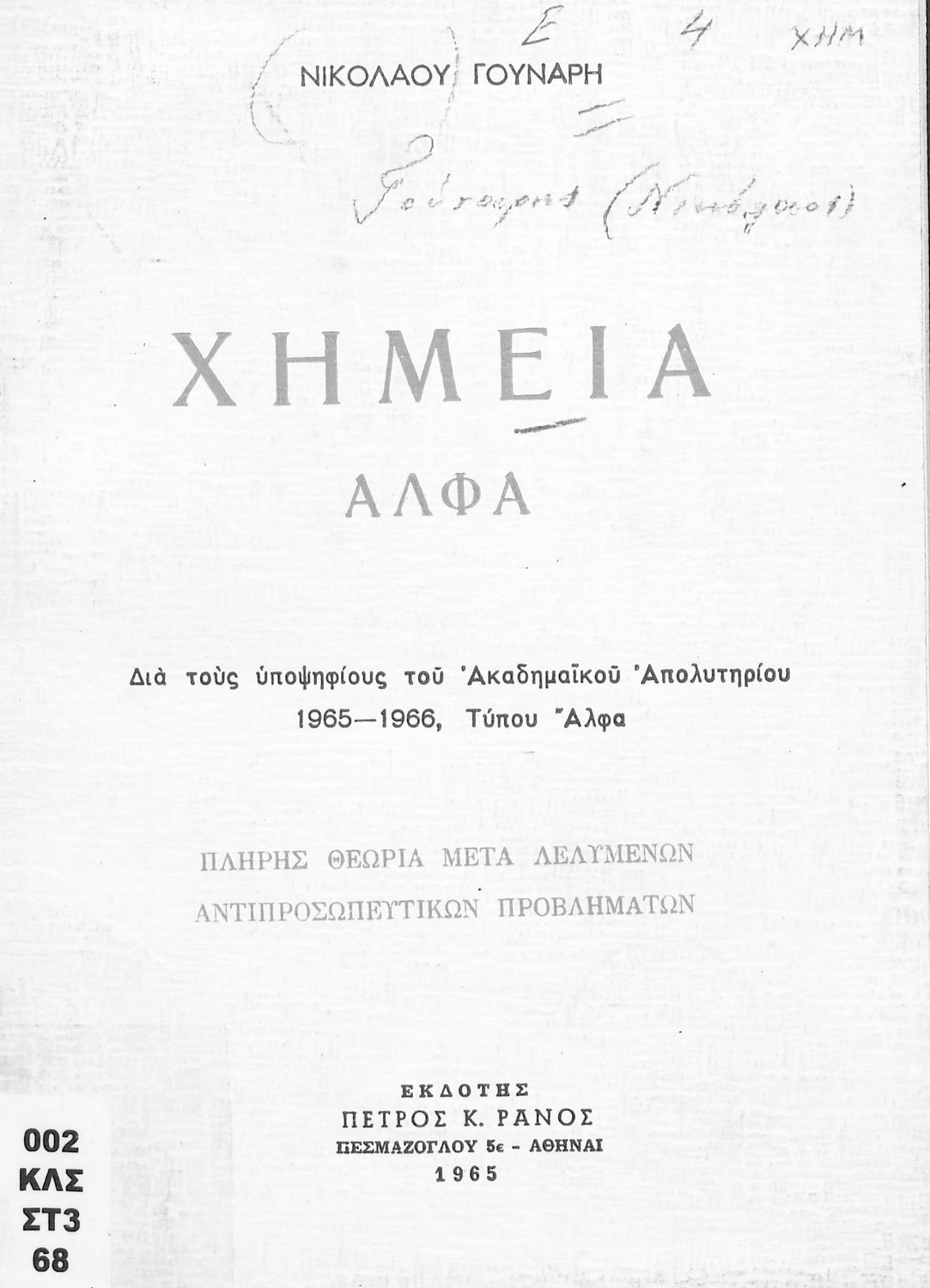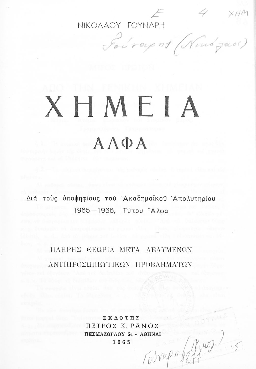 Μαθητικό βοήθημα για τους υποψηφίους του Ακαδημαϊκού Απολυτηρίου 1965-1966, Τύπου Α που περιέχει θεωρία της χημείας και ασκήσεις.