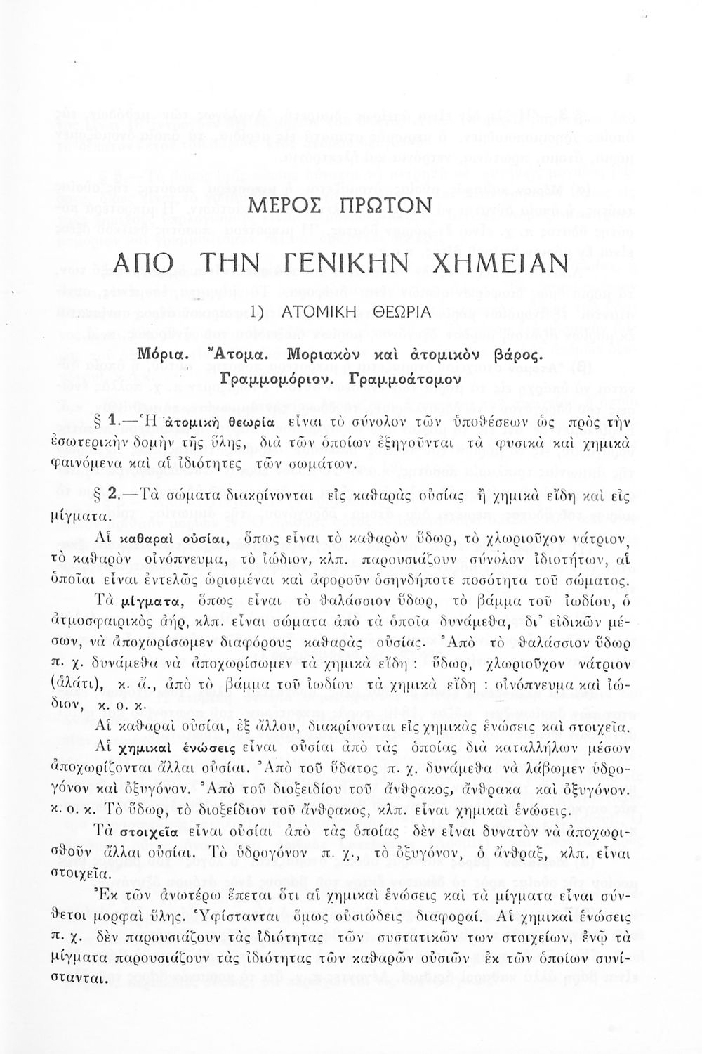 Βαθμίδα εκπαίδευσης: Δευτεροβάθμια Μάθημα: Χημεία Γλώσσα: Απλή καθαρεύουσα Παρουσίαση περιεχομένου: Μαθητικό βοήθημα για τους υποψηφίους του Ακαδημαϊκού Απολυτηρίου 1965-1966, Τύπου Α που περιέχει θεωρία της χημείας και ασκήσεις. |