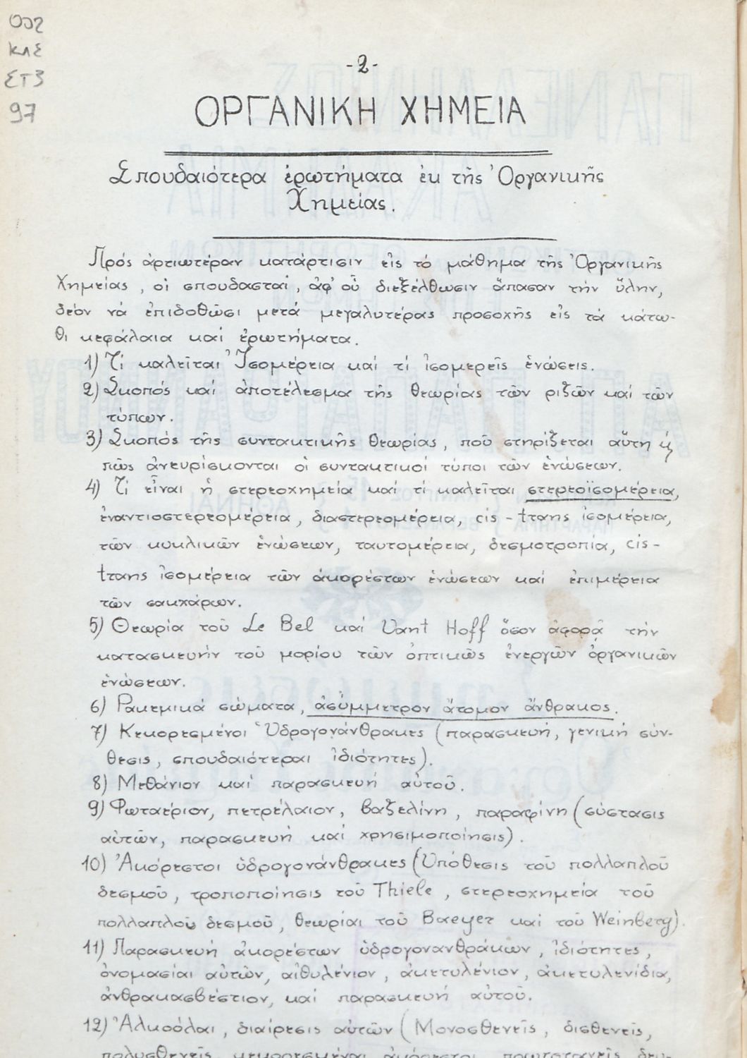 Μαθητικό βοήθημα Χημείας το οποίο περιέχει σημειώσεις Οργανικής Χημείας οι οποίες βασίζονται σε Πανεπιστημιακές παραδόσεις. Το βιβλίο εξετάζει ζητήματα Οργανικής Χημείας και παρουσιάζει τις βασικές έννοιες της οργανικής χημείας και τις βασικές χημικές ενώσεις, τα χαρακτηριστικά τους, τον τρόπο παρασκευής και τα παράγωγά τους.