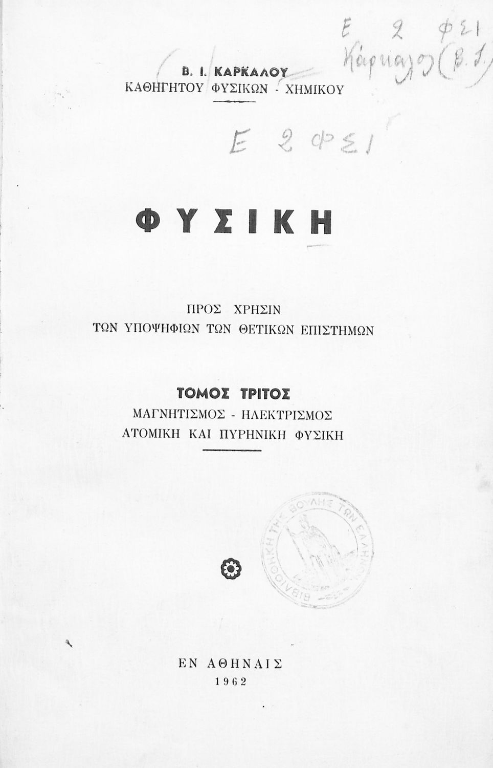 Μαθητικό βοήθημα Φυσικής των υποψηφίων των Θετικών επιστημών. Το βιβλίο ασχολείται με θεματικές του μαγνητισμού, του ηλεκτρισμού αλλά και της ατομικής και πυρηνικής φυσικής.