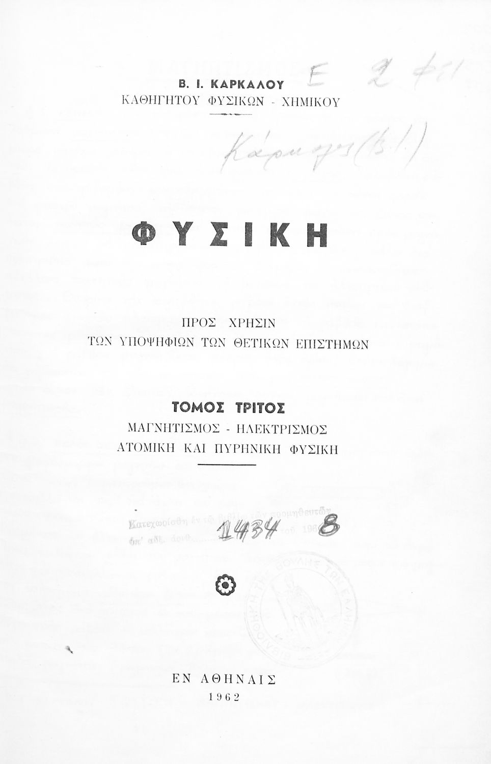 Βαθμίδα εκπαίδευσης: Δευτεροβάθμια Μάθημα: Φυσική Γλώσσα: Απλή καθαρεύουσα Παρουσίαση περιεχομένου: Μαθητικό βοήθημα Φυσικής των υποψηφίων των Θετικών επιστημών. Το βιβλίο ασχολείται με θεματικές του μαγνητισμού, του ηλεκτρισμού αλλά και της ατομικής και πυρηνικής φυσικής. |