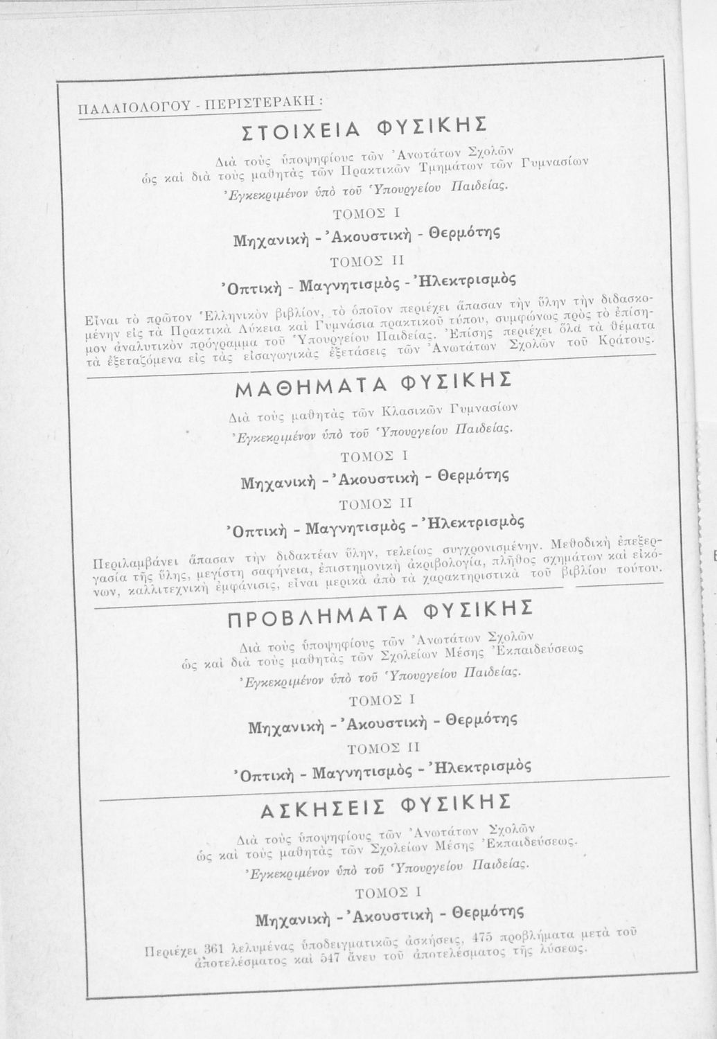 Μαθητικό βοήθημα Φυσικής για τους υποψηφίους των Ανωτάτων Σχολών και τους μαθητές των ανωτέρων τάξεων των Σχολείων Μέσης Εκπαιδεύσεως που εξετάζει ζητήματα της μηχανικής, ηλεκτρισμού και ηλεκτρομαγνητισμού, και θερμότητας και τις μεταβολές που επιφέρει στις ιδιότητες των αερίων.