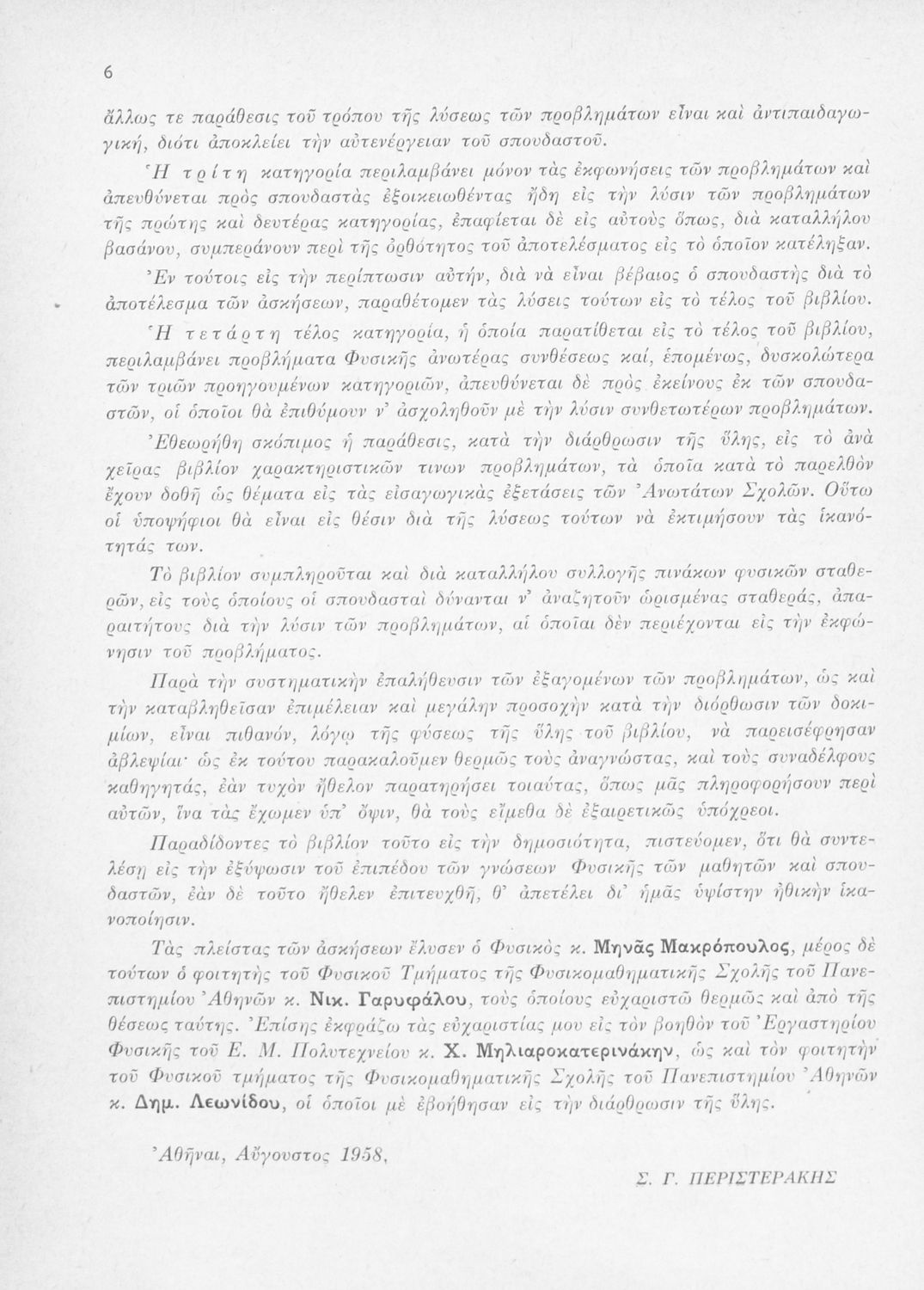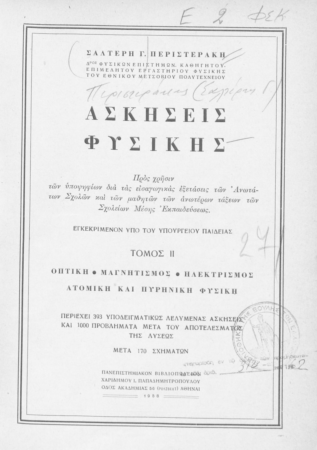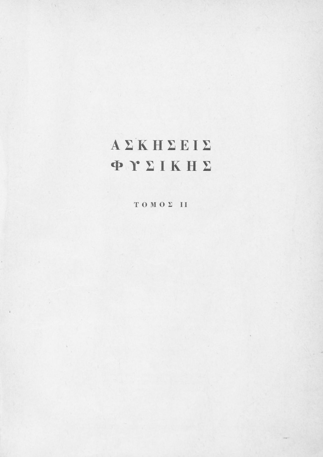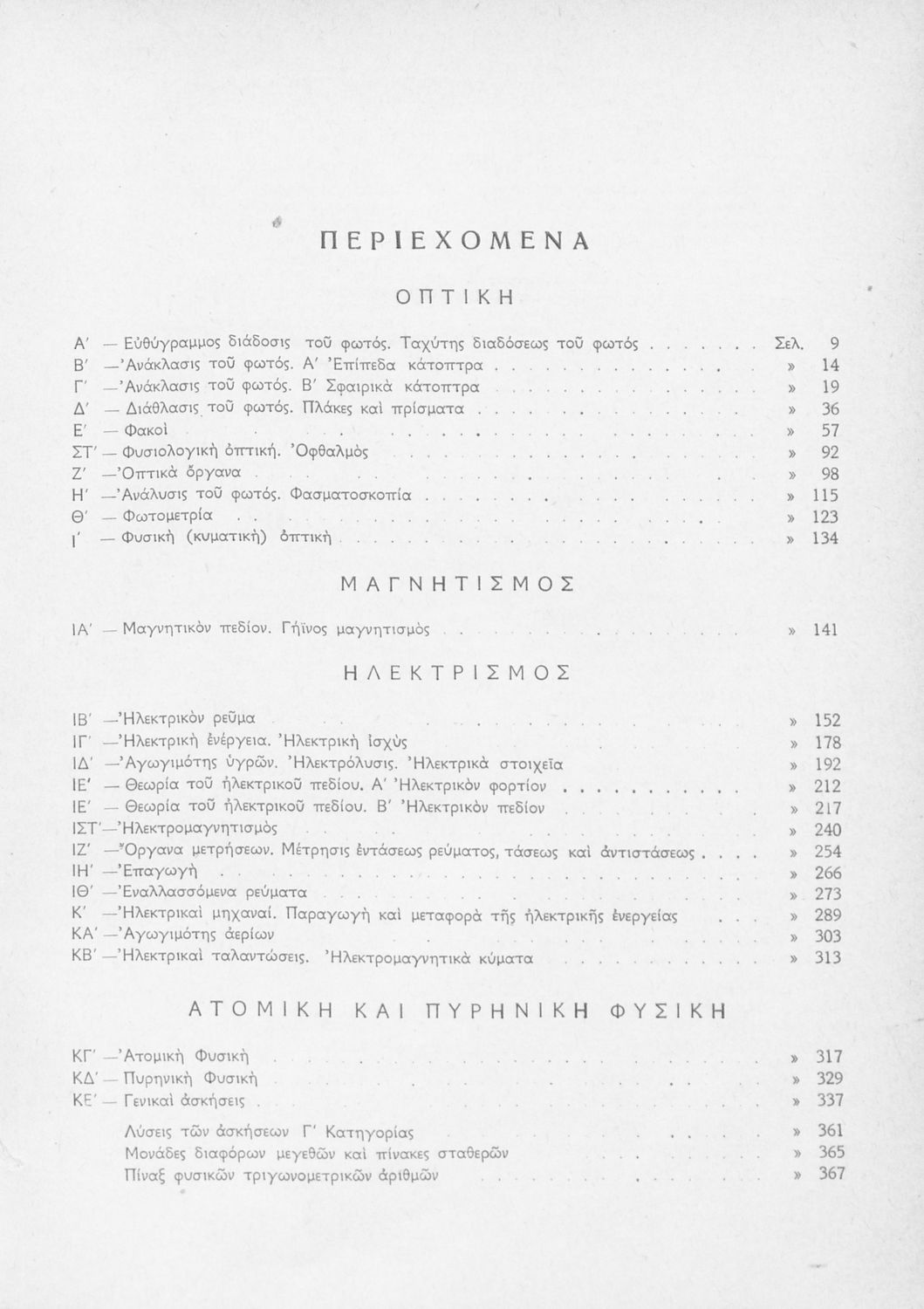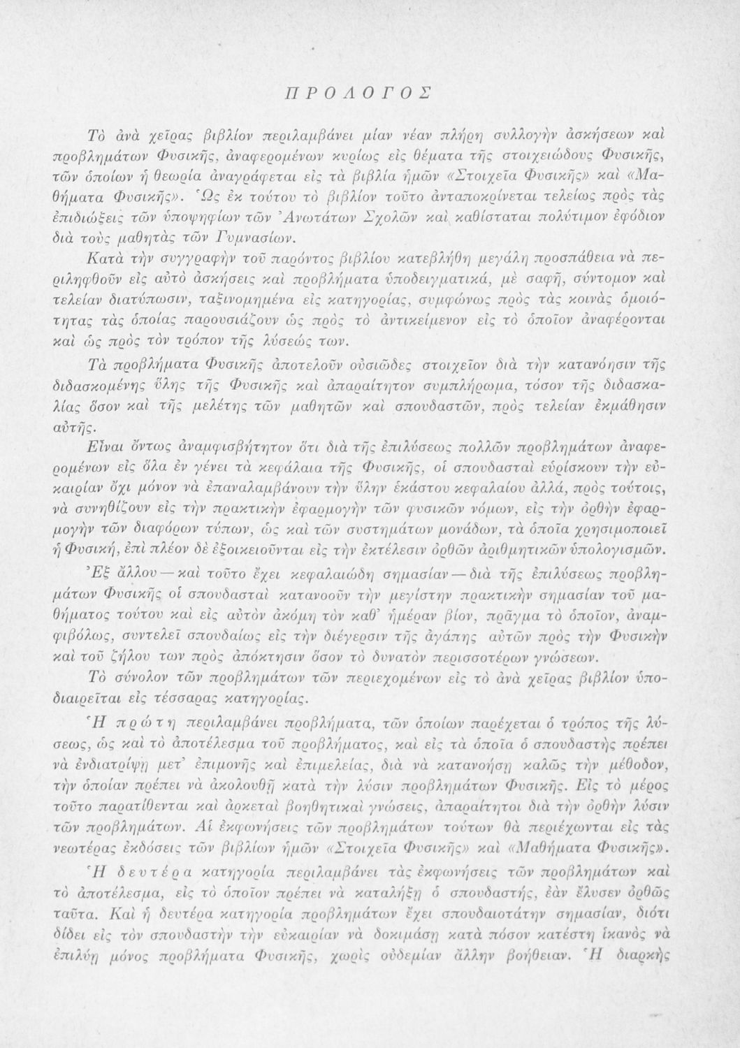 Μαθητικό βοήθημα Φυσικής για τους υποψηφίους των Ανωτάτων Σχολών και τους μαθητές των ανωτέρων τάξεων των Σχολείων Μέσης Εκπαιδεύσεως που εξετάζει ζητήματα της μηχανικής, ηλεκτρισμού και ηλεκτρομαγνητισμού, και θερμότητας και τις μεταβολές που επιφέρει στις ιδιότητες των αερίων.
