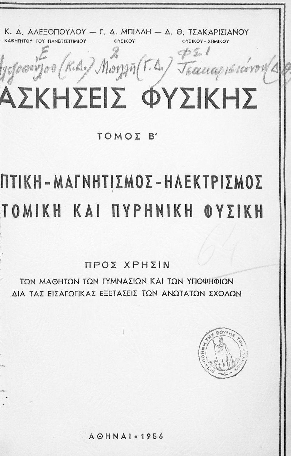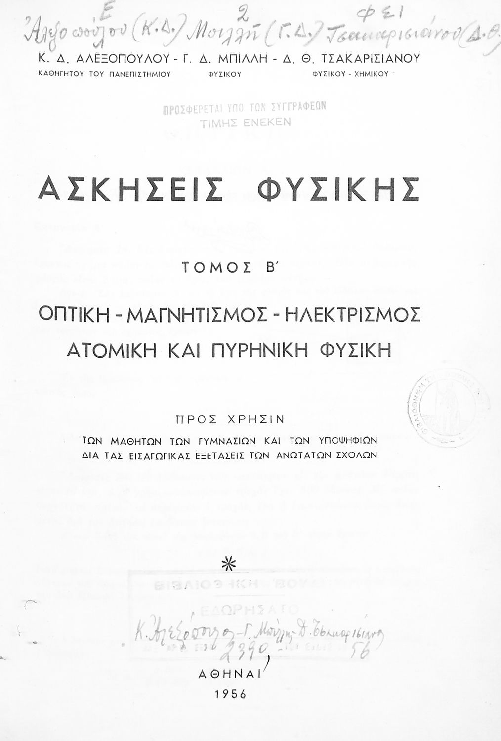 Μαθητικό βοήθημα Φυσικής για τα Γυμνάσια και για τους υποψηφίους των Ανωτάτων Σχολών που περιλαμβάνει ασκήσεις φυσικής στους τομείς της οπτικής, του μαγνητισμού, ηλεκτρισμού αλλά και της ατομικής και πυρηνικής φυσικής.