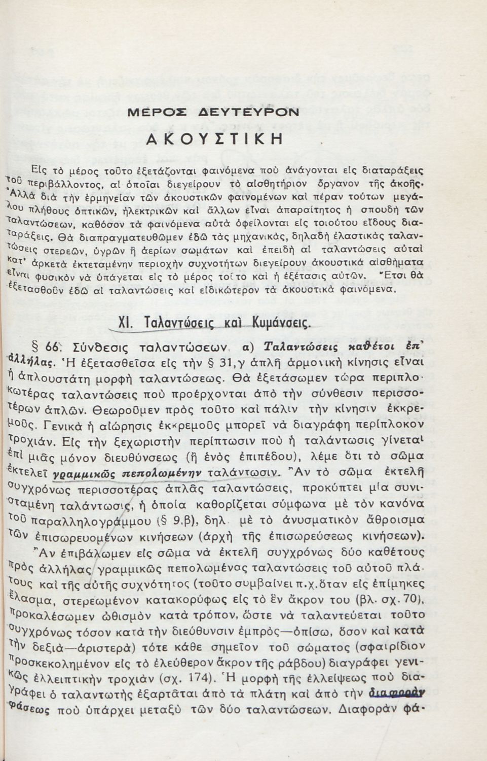Σχολικό εγχειρίδιο Φυσικής Πειραματικής που εστιάζει στα φυσικά φαινόμενα της μηχανικής, της ακουστικής και της θερμότητας. Φέρει το σύμβολο της δικτατορίας.