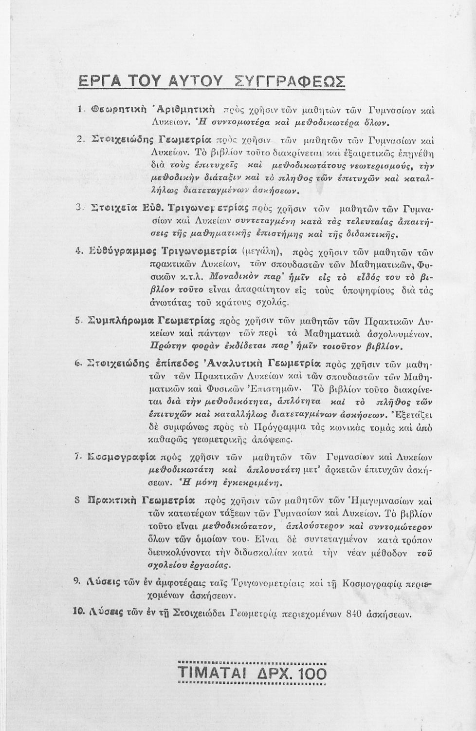 Βαθμίδα εκπαίδευσης: Δευτεροβάθμια Τάξη: Πρακτικό Λύκειο Μάθημα: Φυσική Γλώσσα: Απλή καθαρεύουσα Παρουσίαση περιεχομένου: Μαθητικό βοήθημα Φυσικής για τους μαθητές των πρακτικών Λυκείων και τους υποψηφίους των Ανωτάτων Σχολών του κράτους. Το βιβλίο περιέχει τη μαθηματική εξήγηση της Φυσικής χωρίς το πειραματικό μέρος. Το τέλος κάθε κεφαλαίου ακολουθείται από ασκήσεις. |