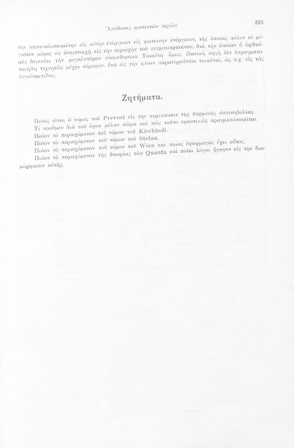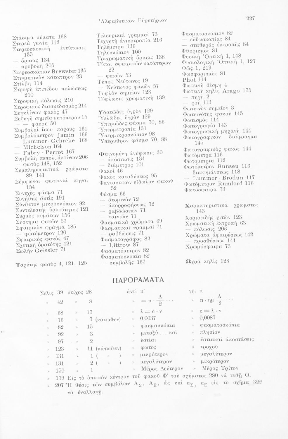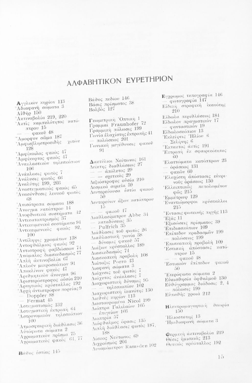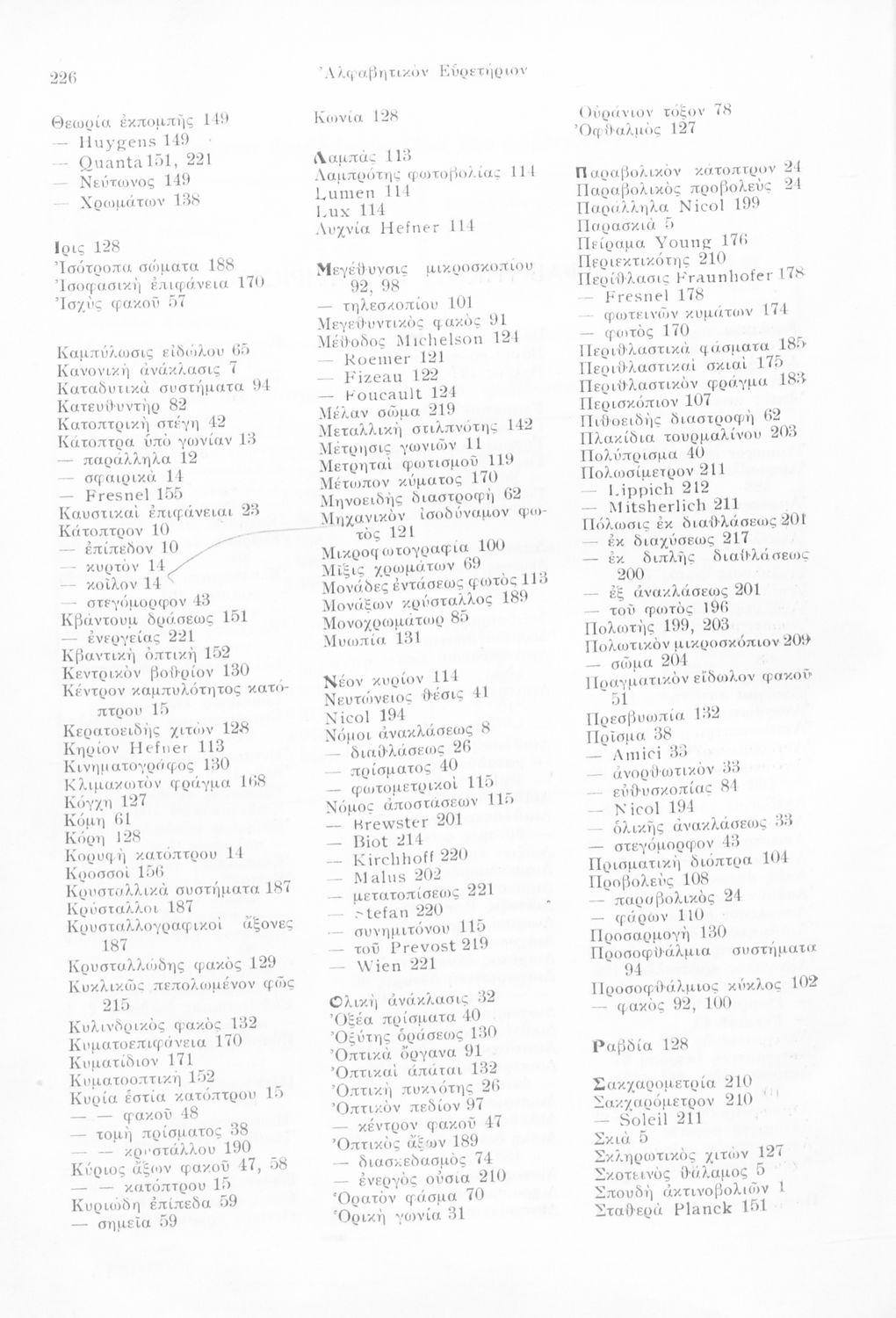 Μαθητικό βοήθημα Φυσικής για τους σπουδαστές των Ανωτέρων Σχολών. Το βιβλίο είναι χωρισμένο σε τρία μέρη και εξετάζει τη διαφορετικά είδη οπτικής, τη γεωμετρική οπτική, τη φυσιολογική και την φυσική οπτική.