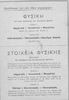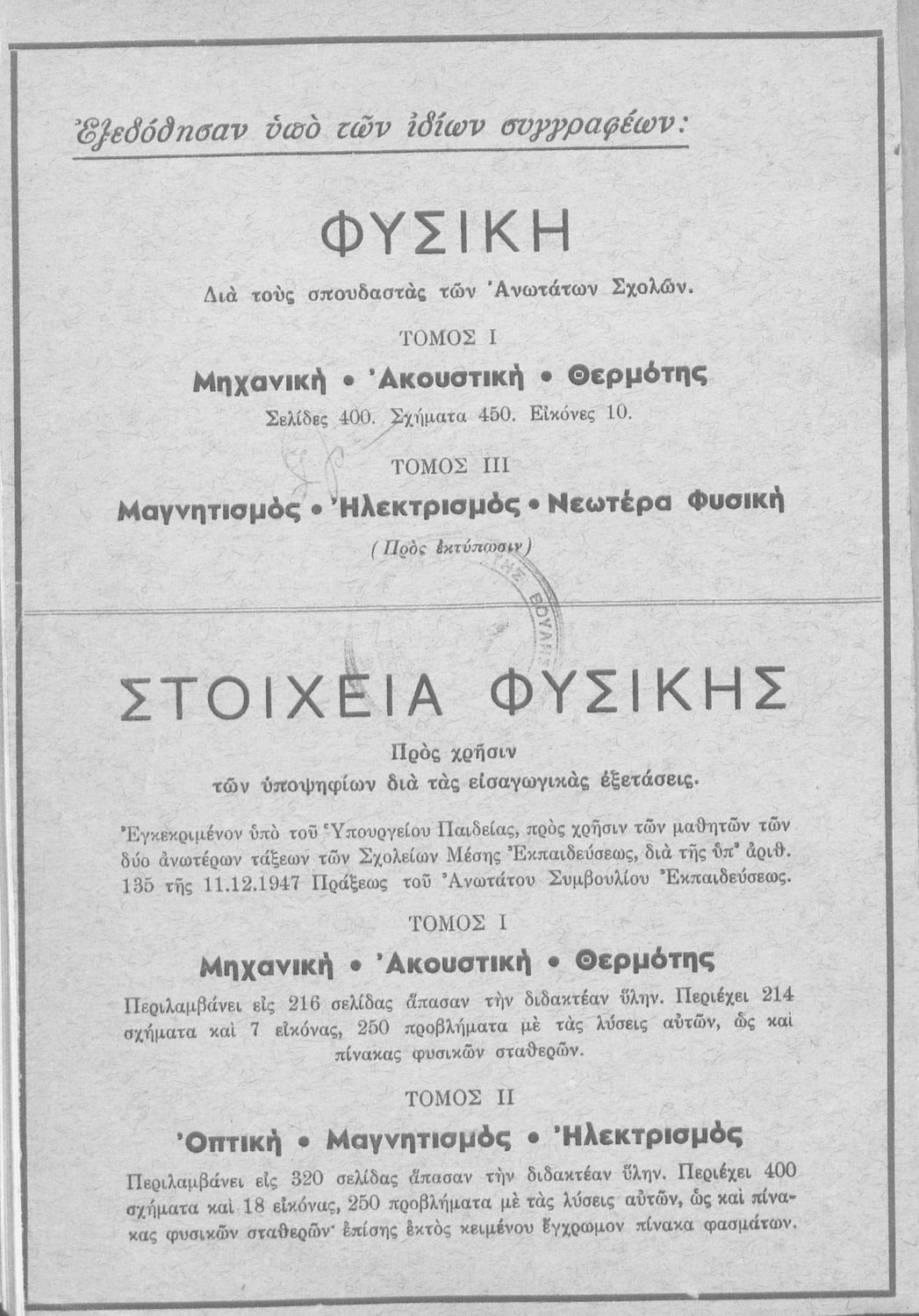 Μαθητικό βοήθημα Φυσικής για τους υποψήφιους των Ανωτάτων Σχολών και των μαθητών των ανωτέρων τάξεων των Σχολείων Μέσης Εκπαιδεύσεως που περιλαμβάνει ασκήσεις ηλεκτρονικής, ατομικής και πυρηνικής Φυσικής.