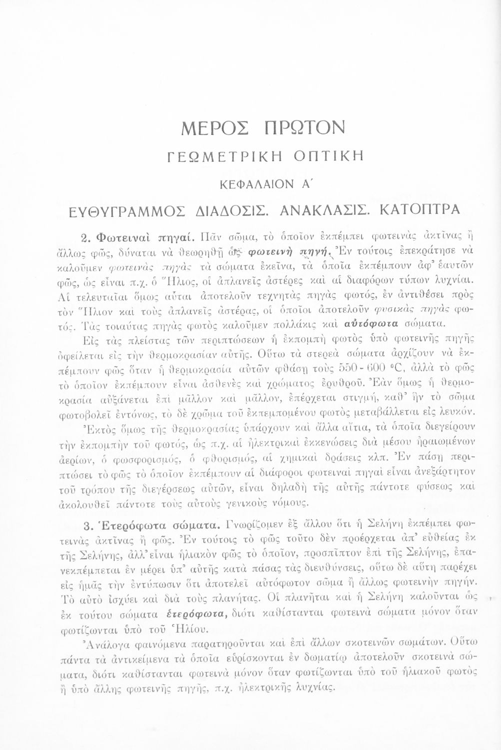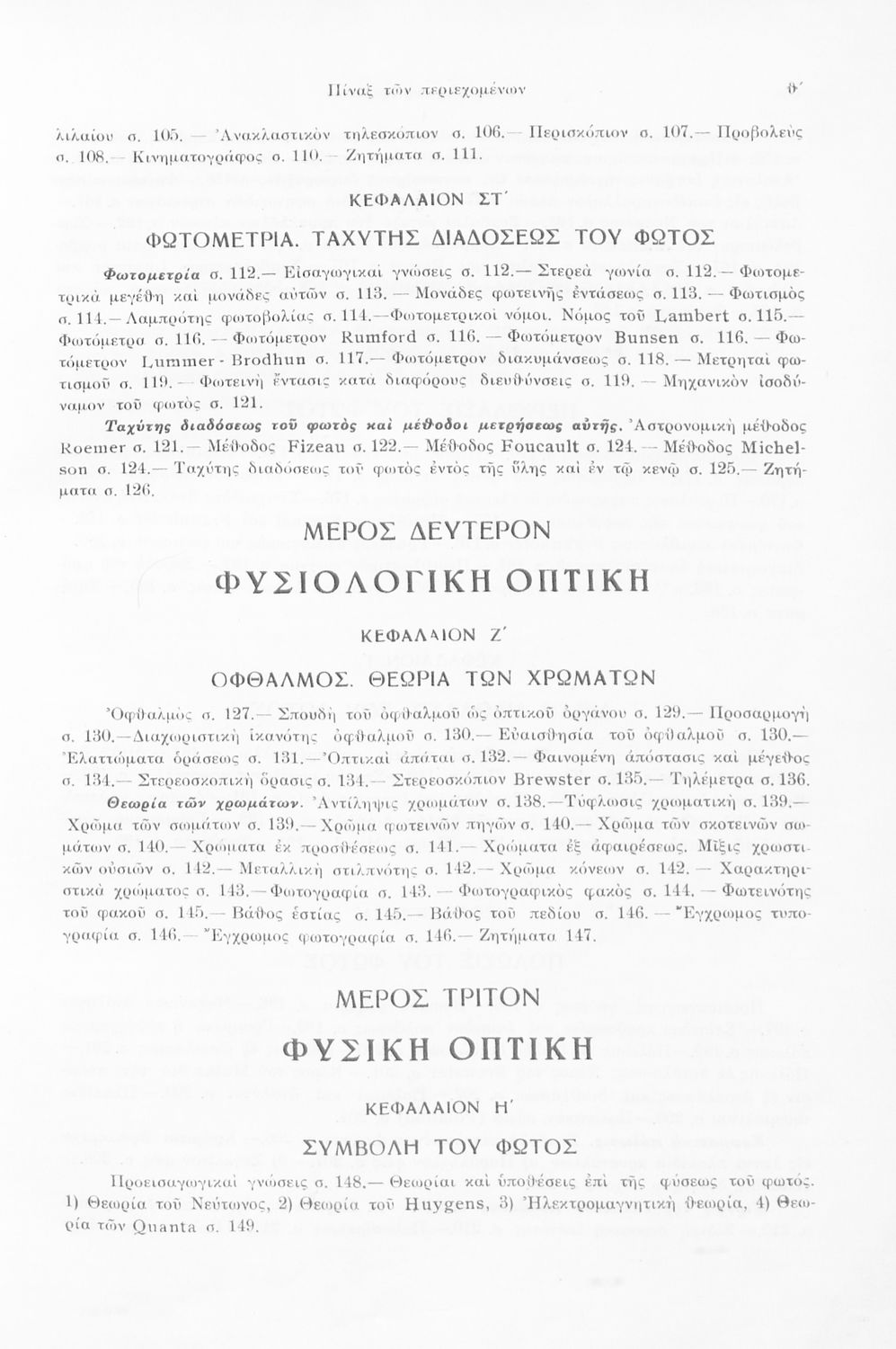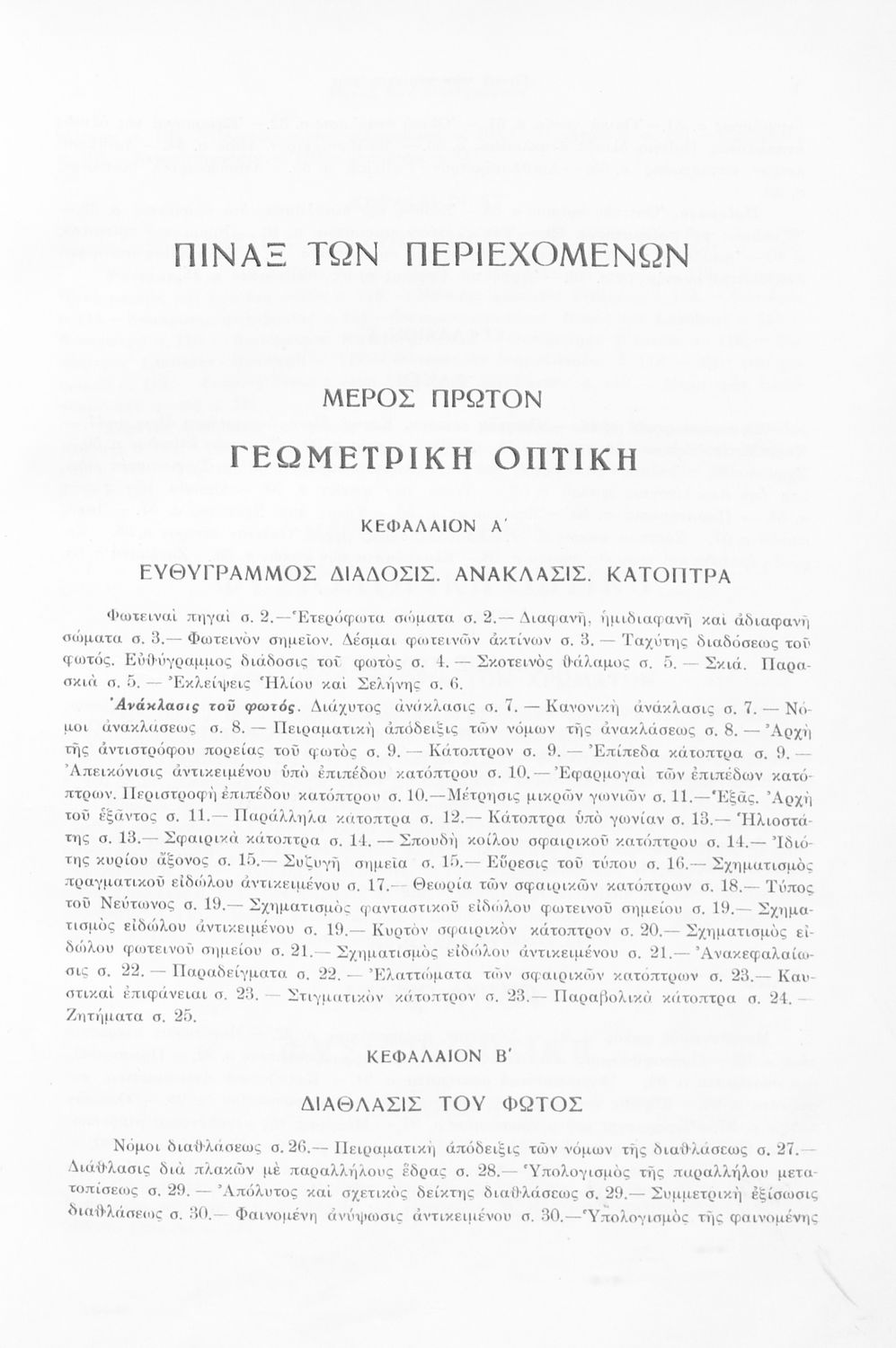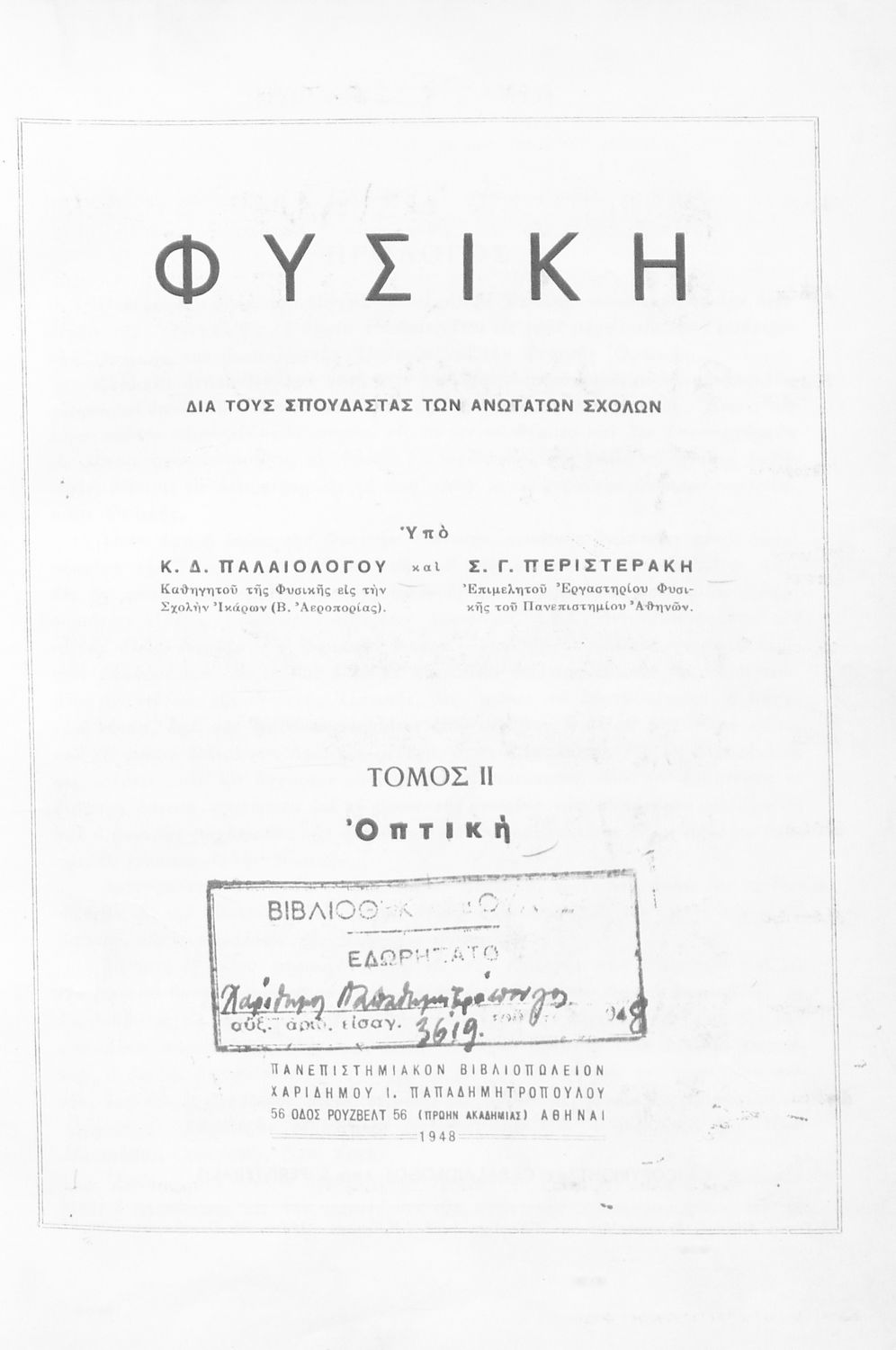 Μαθητικό βοήθημα Φυσικής για τους σπουδαστές των Ανωτέρων Σχολών. Το βιβλίο είναι χωρισμένο σε τρία μέρη και εξετάζει τη διαφορετικά είδη οπτικής, τη γεωμετρική οπτική, τη φυσιολογική και την φυσική οπτική.