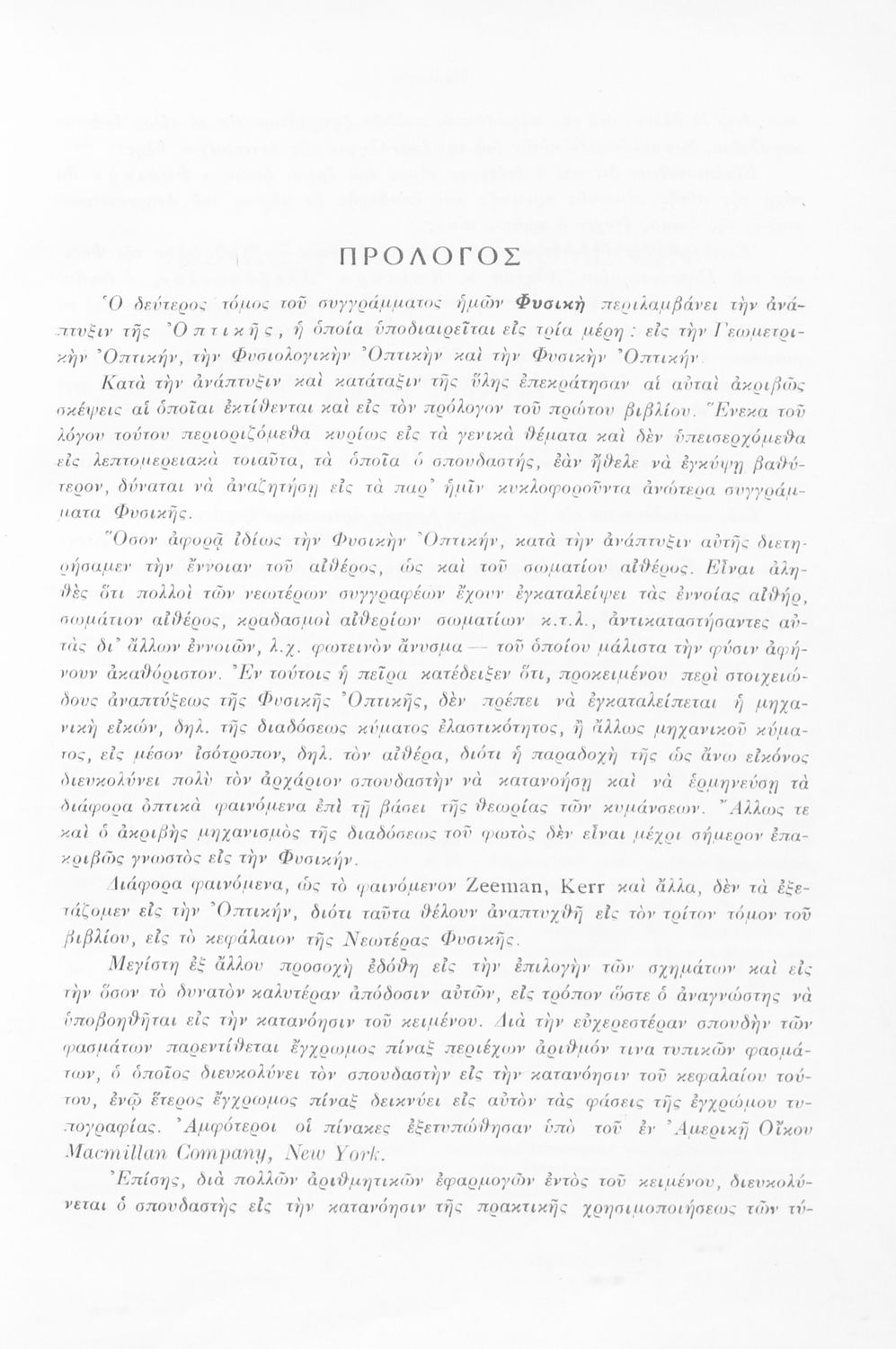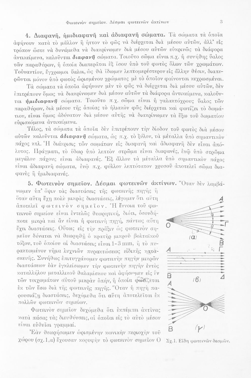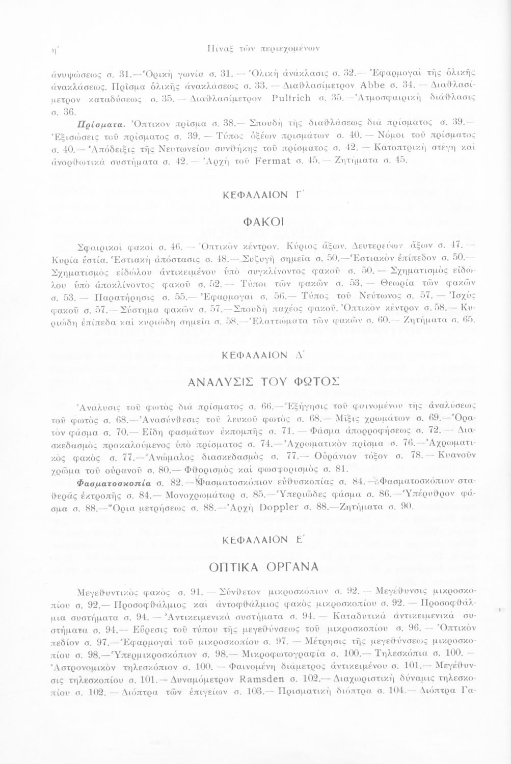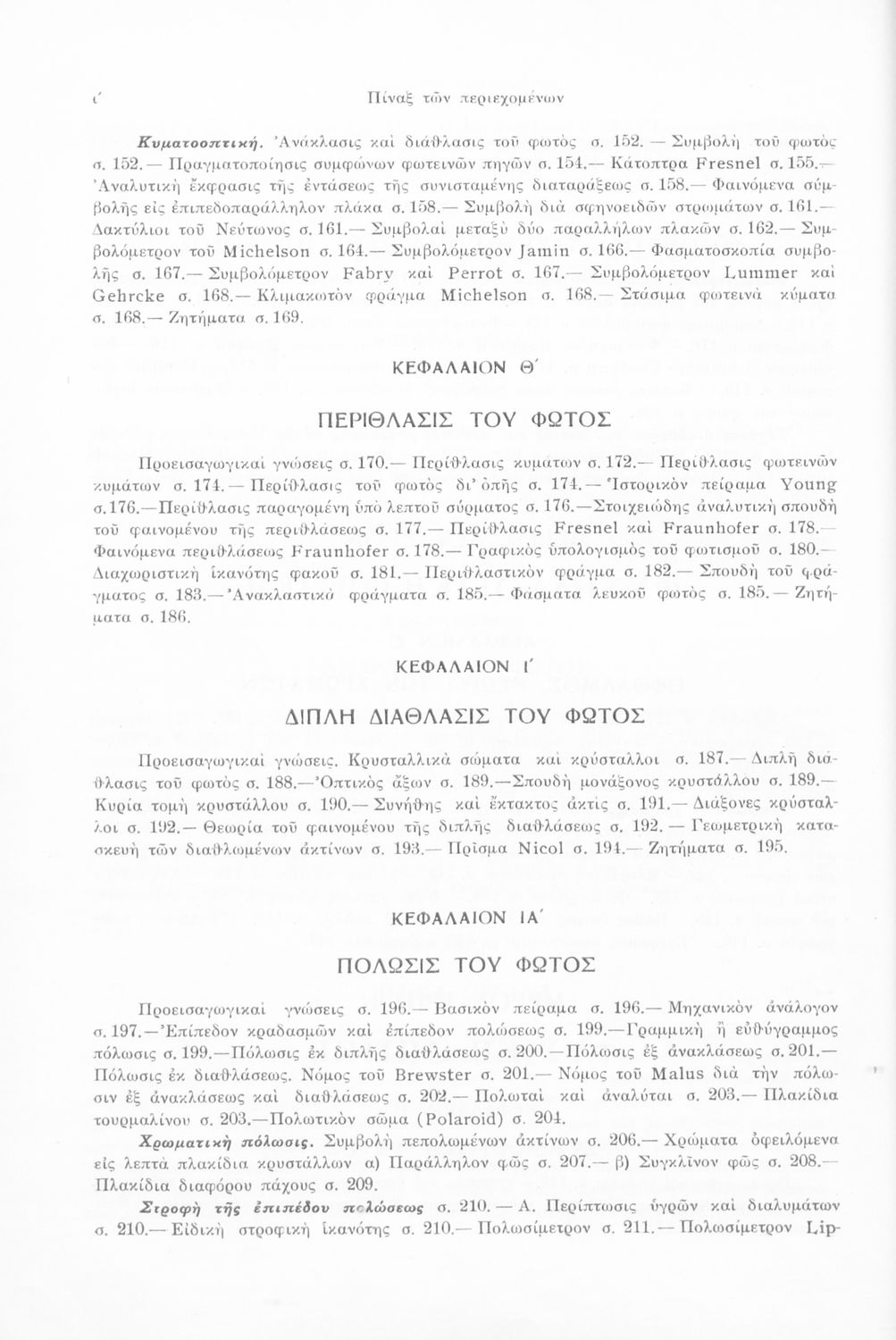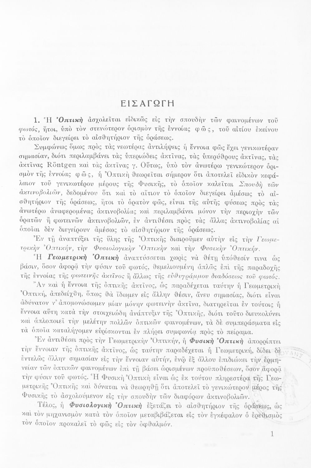 Μαθητικό βοήθημα Φυσικής για τους σπουδαστές των Ανωτέρων Σχολών. Το βιβλίο είναι χωρισμένο σε τρία μέρη και εξετάζει τη διαφορετικά είδη οπτικής, τη γεωμετρική οπτική, τη φυσιολογική και την φυσική οπτική.