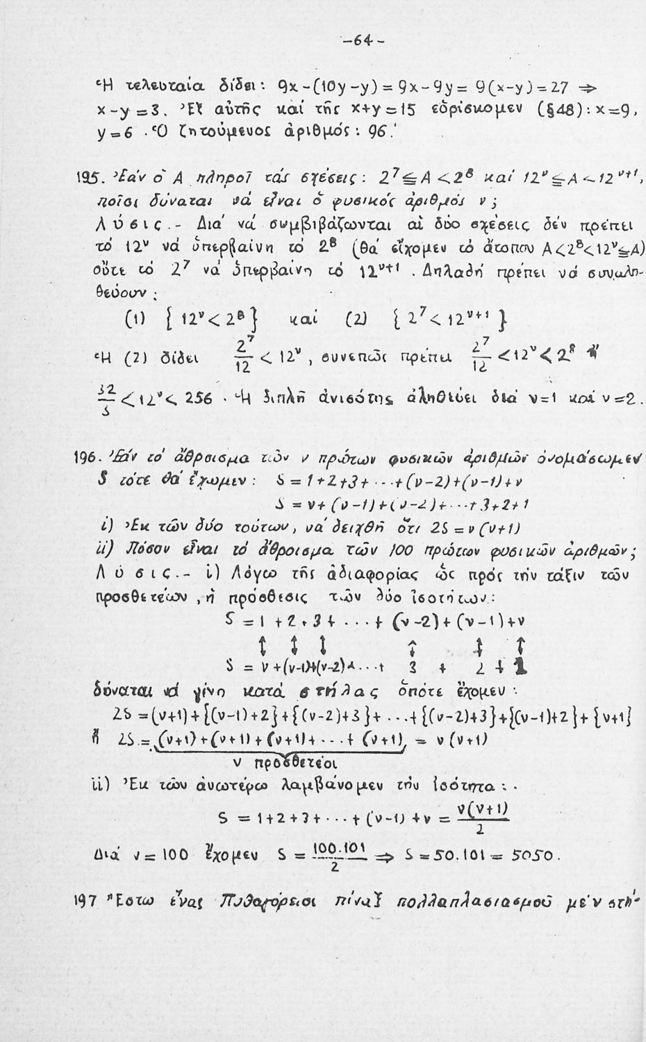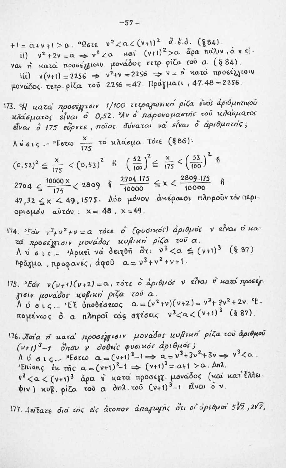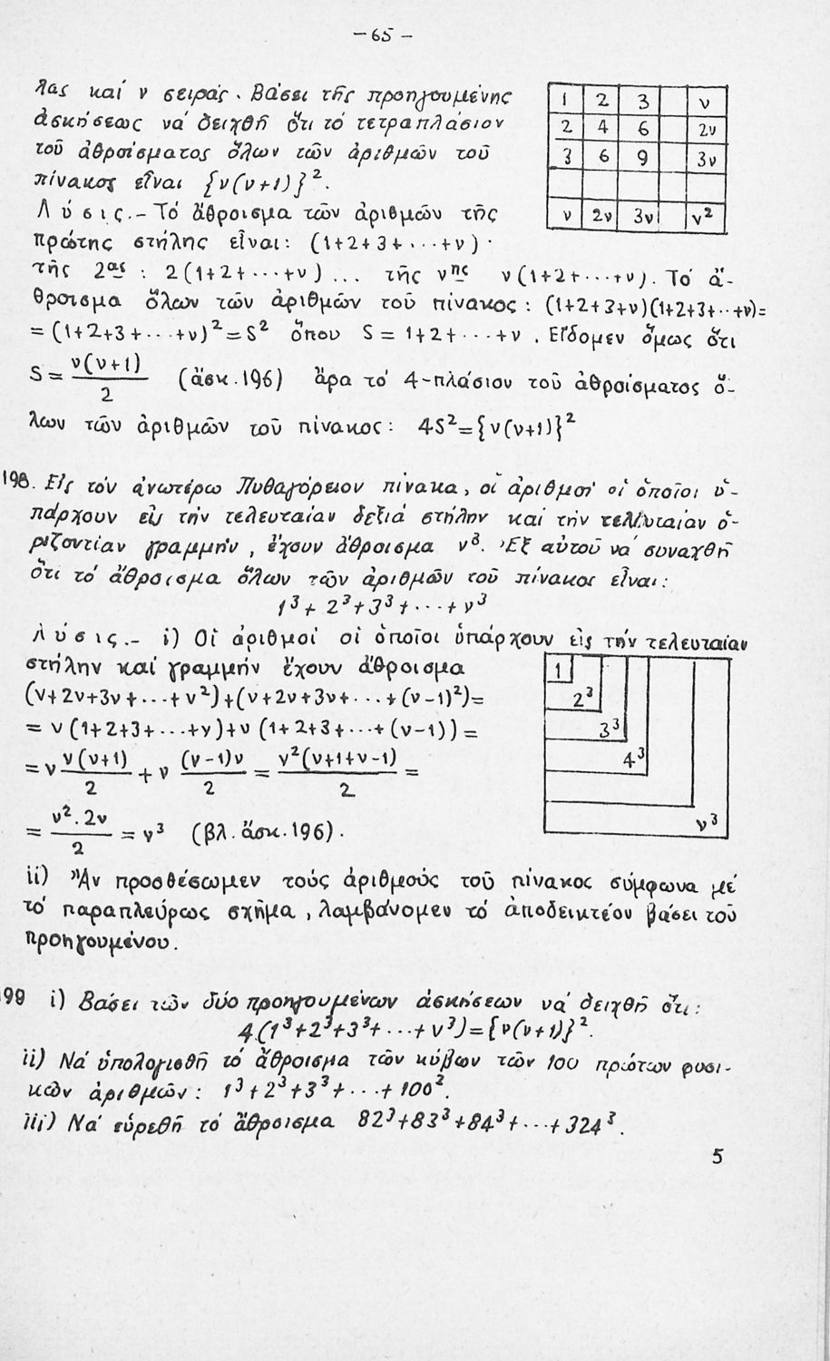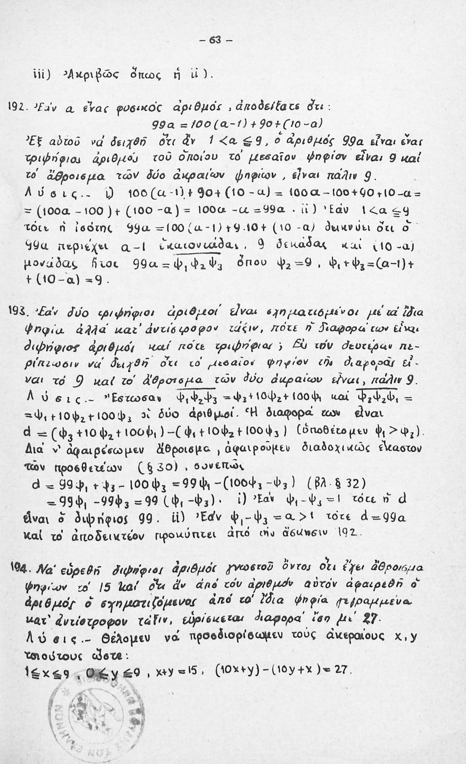 Σχολικό εγχειρίδιο Μαθηματικών Γυμνασίου που είναι χωρισμένο σε θεωρήματα, παραδείγματα και ασκήσεις και περιλαμβάνει στοιχεία Ανώτερης Άλγεβρας και Μαθηματικής Ανάλυσης.