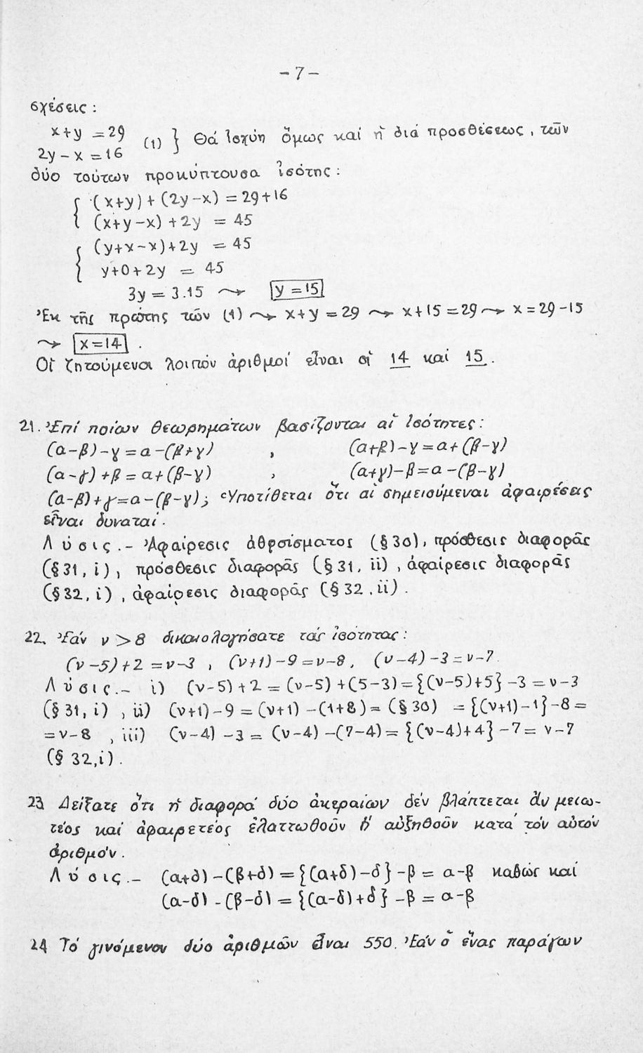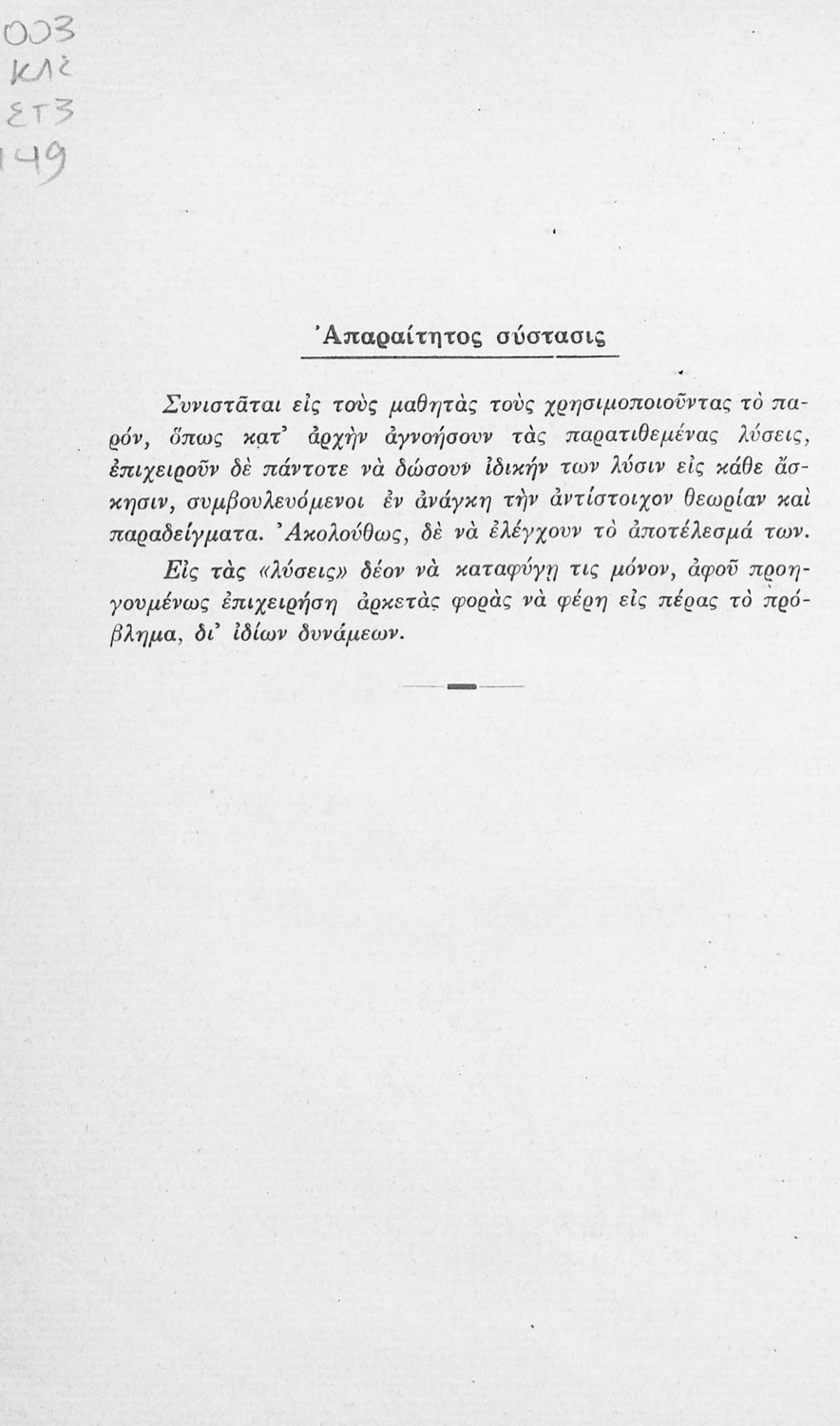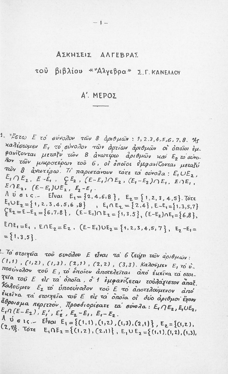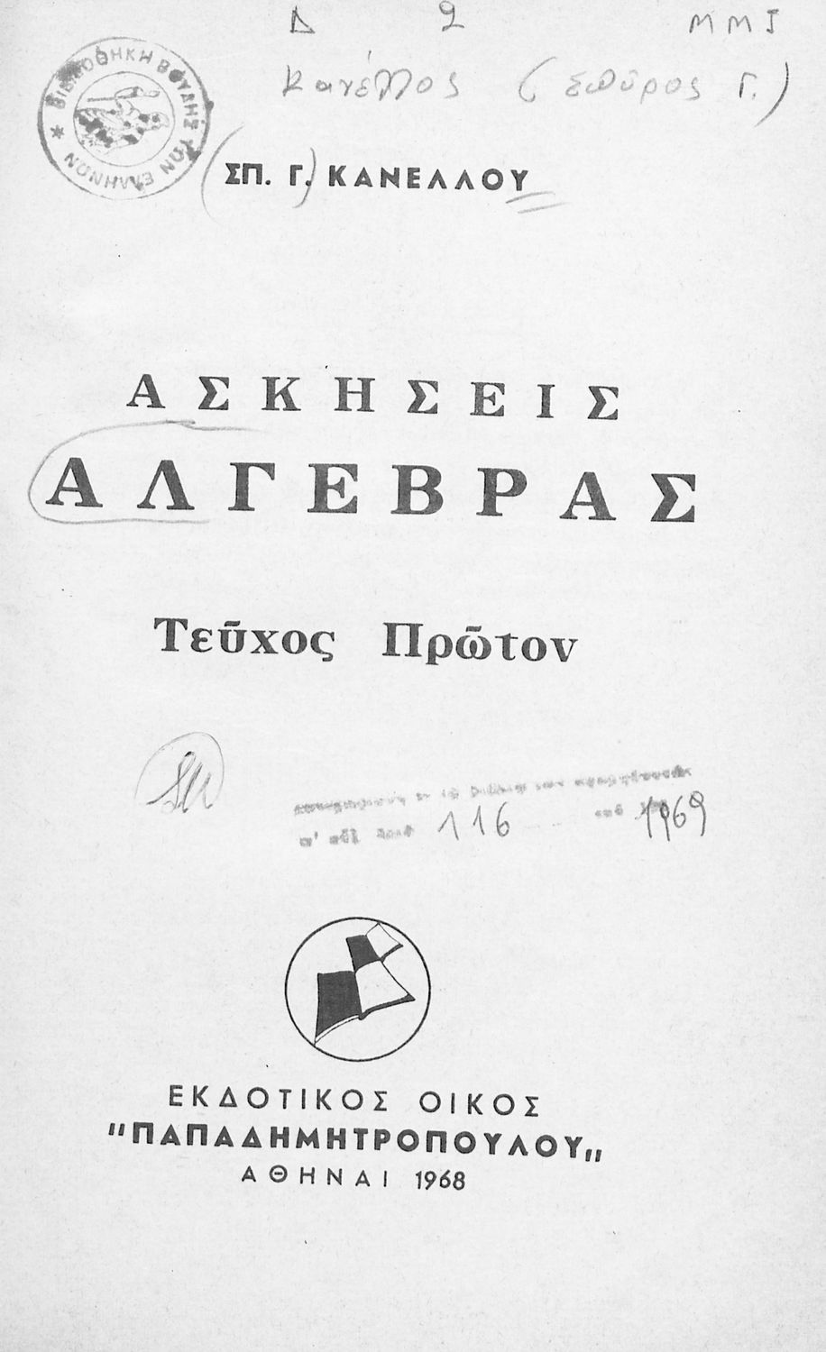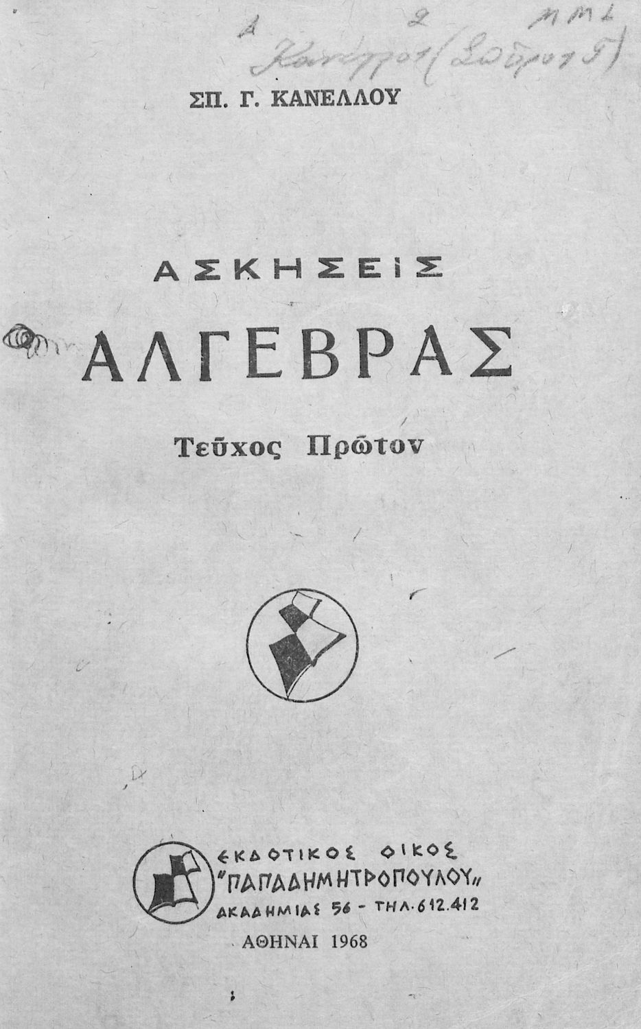 Σχολικό εγχειρίδιο Άλγεβρας για τα Γυμνάσια χωρισμένο σε θεωρία και ασκήσεις. Ο συγγραφέας ήταν καθηγητής στο Πανεπιστήμιο Αθηνών.