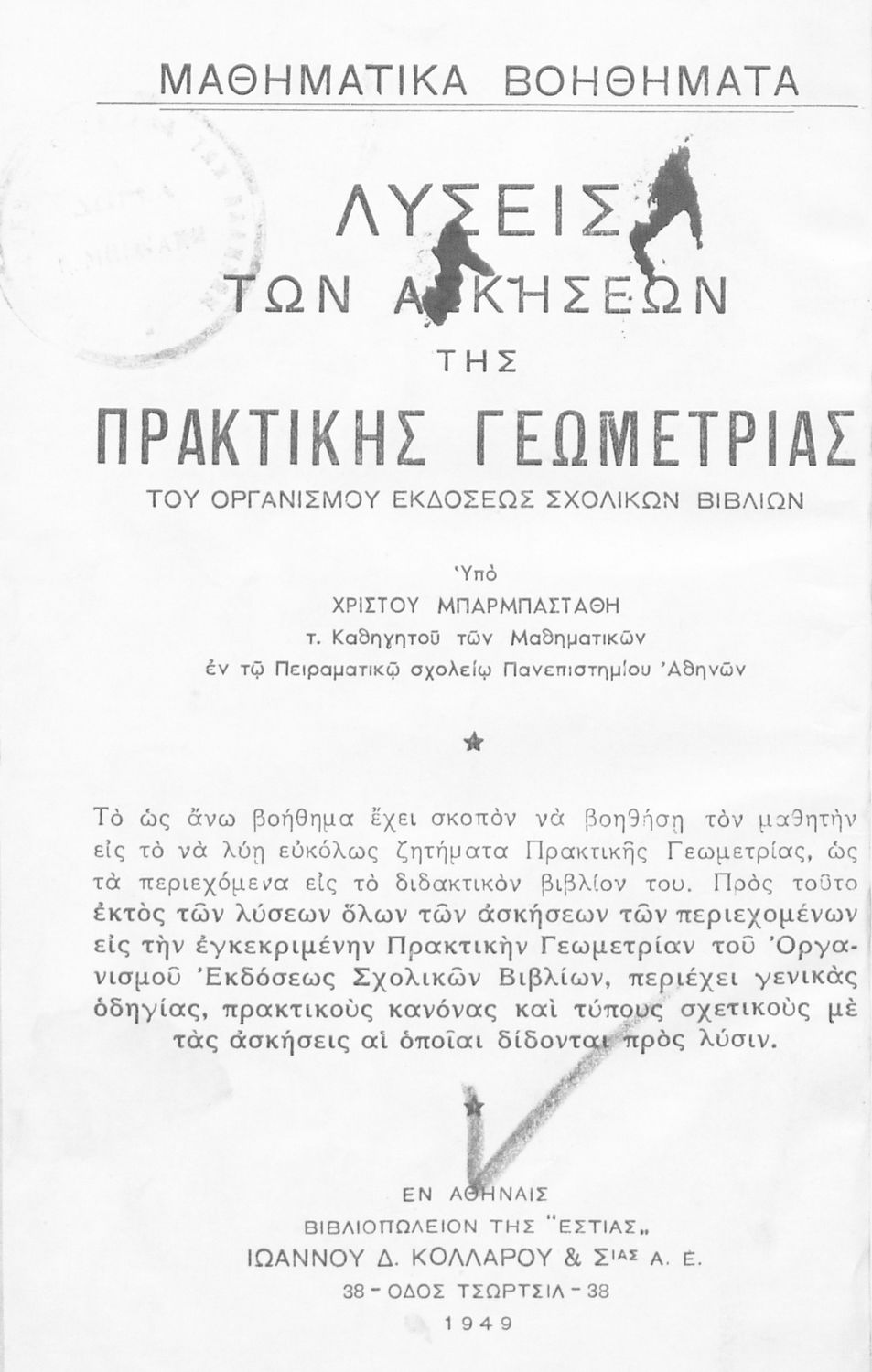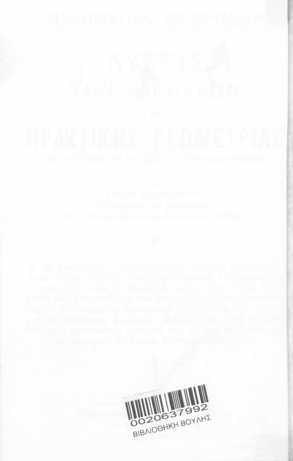 Κωδικός αναγνώρισης: 03-20637992 Τίτλος: Λύσεις των ασκήσεων και προβλημάτων της αριθμητικής του Οργανισμού Εκδόσεως Σχολικών Βιβλίων με απλουστεύσεις μαθηματικών εννοιών, παρατηρήσεις, επεξηγήσεις, πρακτικούς κανόνας, τύπους, οδηγίας και αριθμητικούς πίνακας, δια την ευκολωτέραν και ταχυτέρα λύσιν ζητημάτων της αριθμητικής Συγγραφέας: Χρίστος Α. Μπαρμπαστάθης Μέγεθος και υπόστρωμα: Μαθητικό βοήθημα, σκληρό εξώφυλλο, 172 σελίδες. |