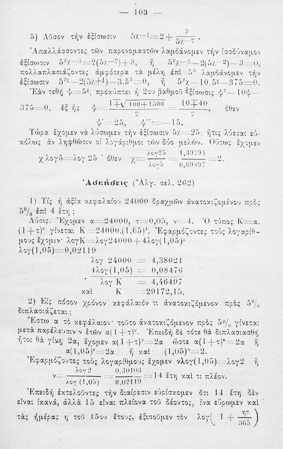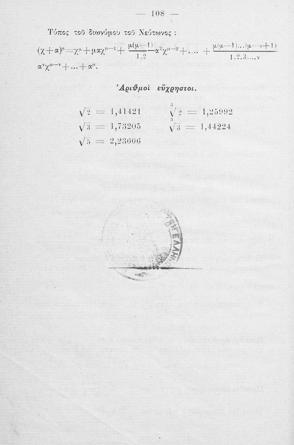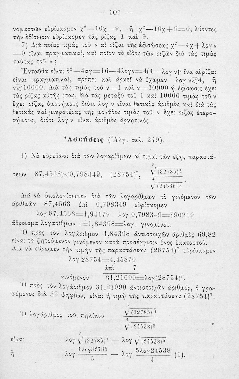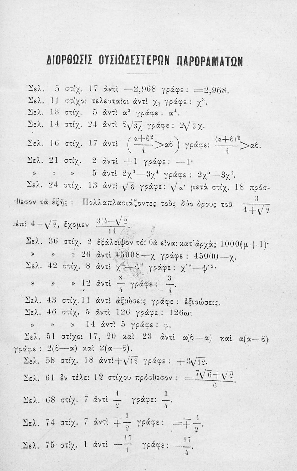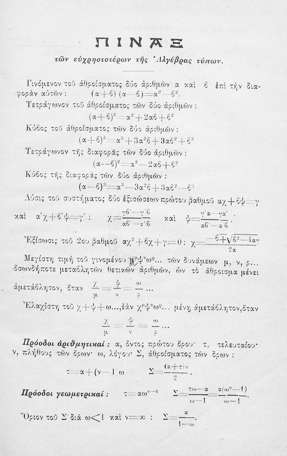 Βαθμίδα εκπαίδευσης: Δευτεροβάθμια Μάθημα: Μαθηματικά Γλώσσα: Καθαρεύουσα Παρουσίαση περιεχομένου: Μαθητικό βοήθημα Μαθηματικών για τους μαθητές των Γυμνασίων και τους υποψήφιους των Στρατιωτικών σχολών και του Πολυτεχνείου που περιλαμβάνει λύσεις ασκήσεων Άλγεβρας. |