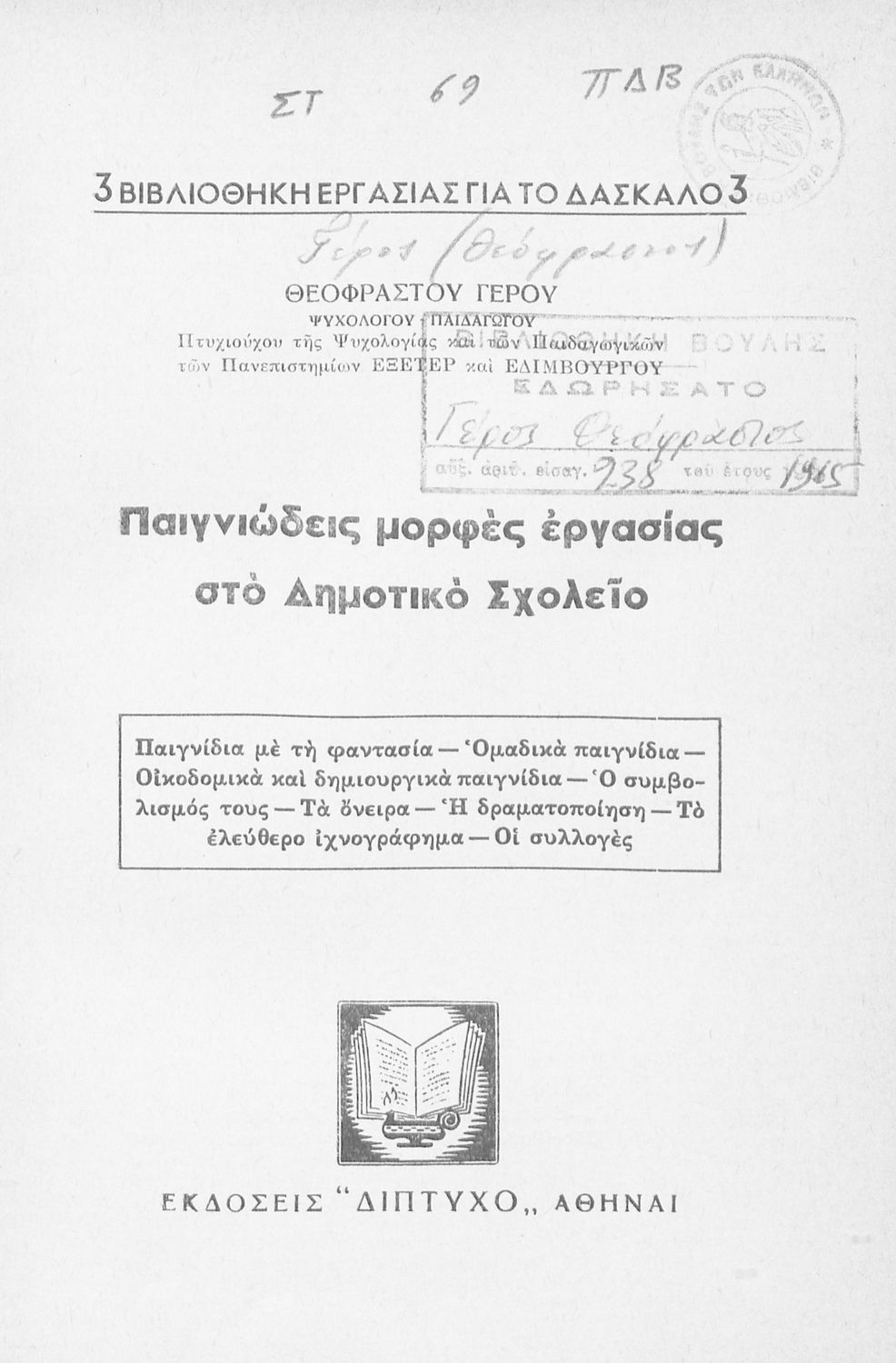 Παιδαγωγικό βοήθημα που αναλύει τη σημασία του παιχνιδιού στην παιδαγωγική και διδακτική διαδικασία στα παιδιά του Δημοτικού. Φέρει ιδιόχειρη αφιέρωση.